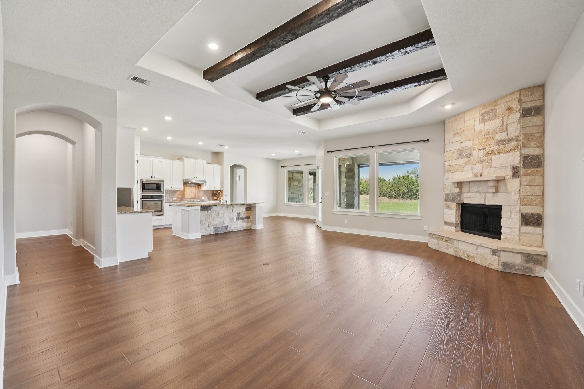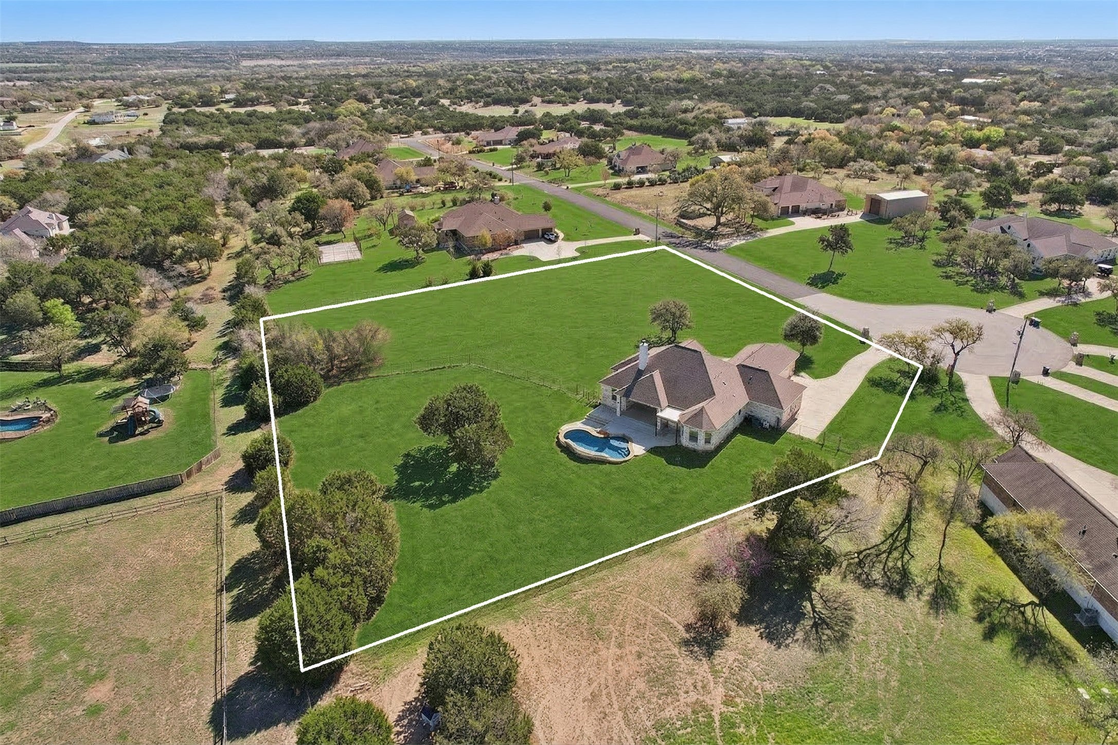 Situated on a peaceful 2-acre cul-de-sac lot in Liberty Hill, this 5-bedroom, 3-bath home offers 2,874 square feet of comfortable living space with plenty of room both inside and out. The property combines a spacious layout with exceptional outdoor living and the privacy that comes with acreage living. The backyard is designed for relaxation and entertaining, featuring a sparkling in-ground pool, an expansive covered patio, and a large fenced lawn perfect for gatherings, outdoor dining, or simply enjoying the quiet Texas countryside. With ample open space on the property, there is also the opportunity to build a shop, additional garage, or other outbuilding to suit your needs. Inside, the home offers a functional layout with generous living spaces. The large living room features a stone fireplace and flows into the open kitchen and dining areas, creating an inviting space for everyday living. The split-bedroom floor plan provides added privacy for the primary suite while allowing room for family, guests, or a home office with five total bedrooms and three full bathrooms. Additional features include a 2-car garage plus a separate garage with a mini split that is ideal for a workshop, gym, or extra storage. The home is on well water with a well house and septic system. Enjoy the space, privacy, and flexibility that comes with owning acreage while still being conveniently located near Liberty Hill amenities.