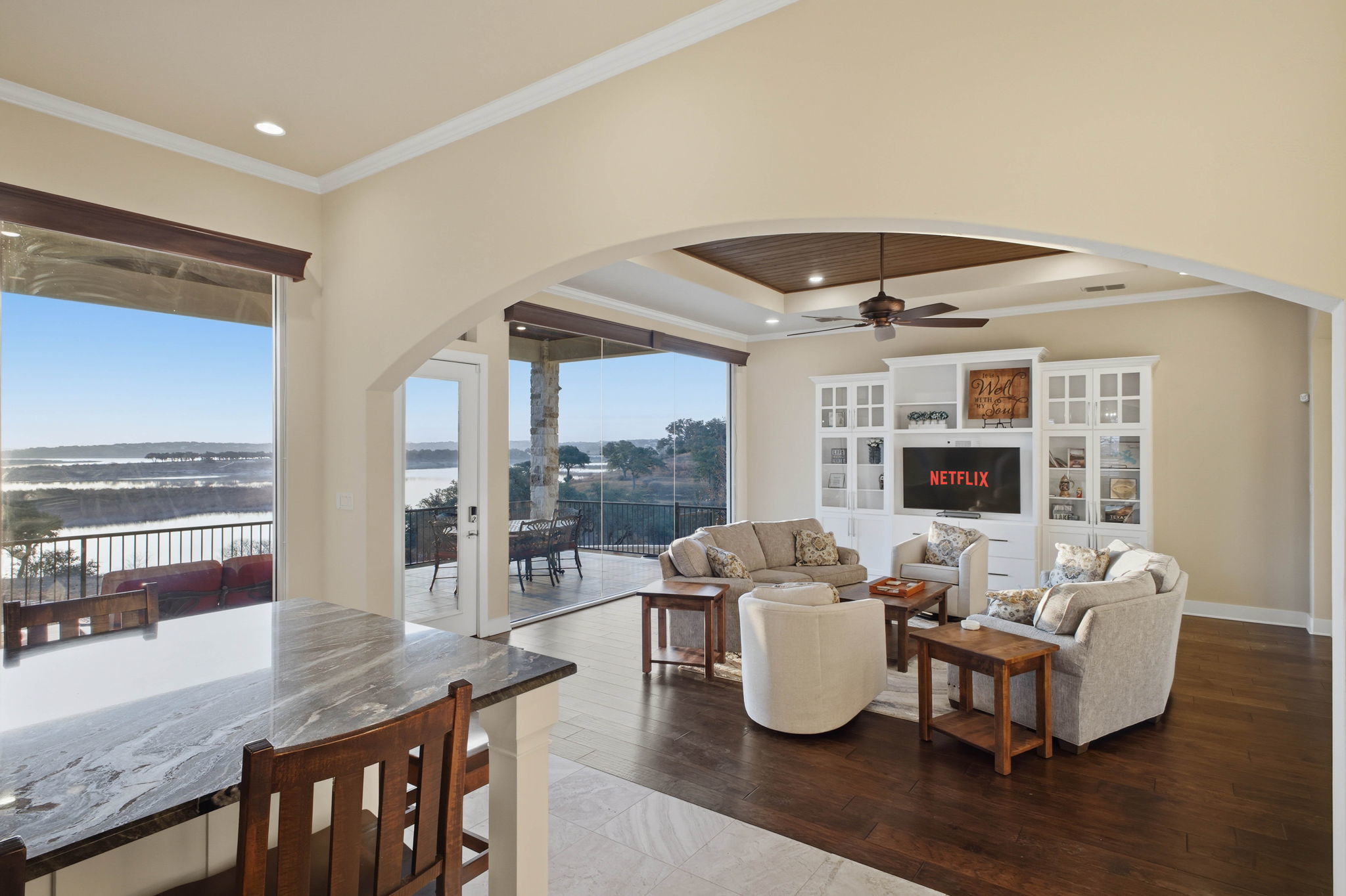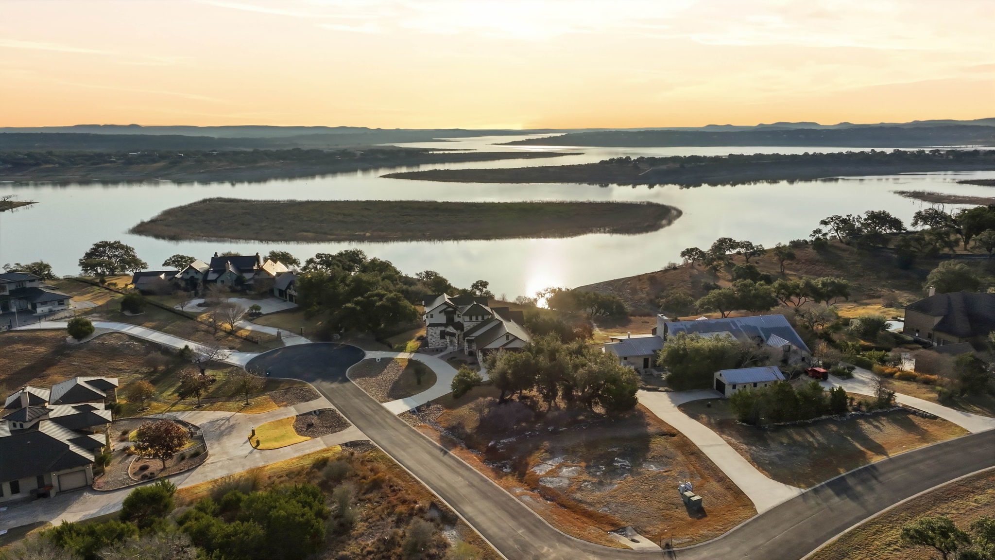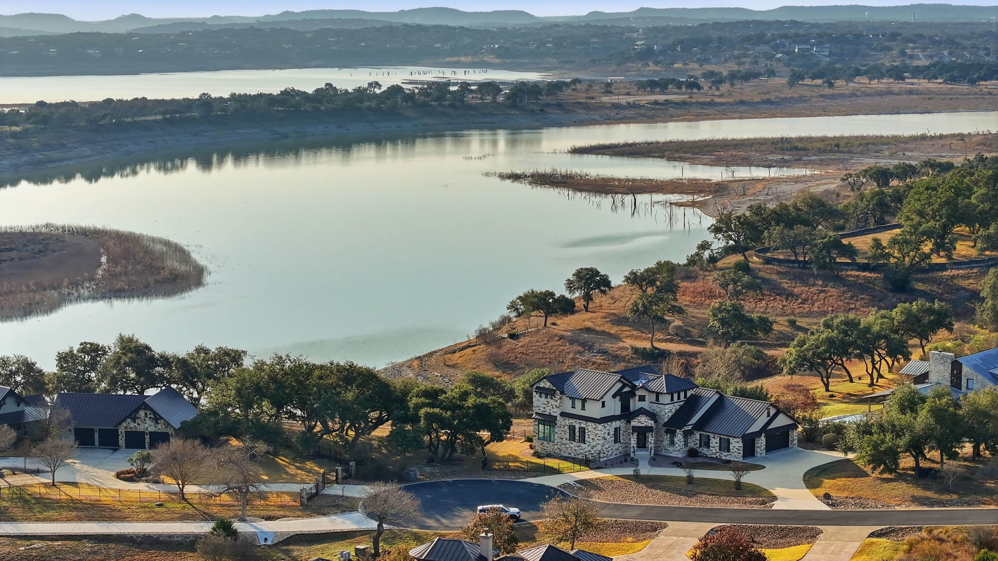 Experience true lakefront living in this stunning custom home located in the gated Peninsula at Mystic Shores on Canyon Lake. Set on 1.71 acres of prime waterfront with shoreline access, this 3,987 sq ft residence offers breathtaking, unobstructed lake views through expansive floor-to-ceiling windows that flood the home with natural light. This thoughtfully designed home features 4 bedrooms, each with its own private en suite bathroom, 4.5 baths. The open-concept living area showcases beautiful wood-paneled ceilings in both the main living room and primary suite, creating a warm yet refined atmosphere while framing panoramic water views. The large kitchen offers plenty of storage and workspace, ideal for entertaining and everyday living. A second-floor mini kitchen adjacent to the media room provides added convenience for guests or extended gatherings. Enjoy outdoor living with two spacious patios overlooking the lake, perfect for relaxing, dining, and taking in the scenery. The primary suite includes a custom walk-in closet with built-in storage for exceptional organization. Additional highlights include propane utilities and a three-car garage with ample space for vehicles and lake gear. With rare lakefront access, generous acreage, and luxury finishes throughout, this home delivers the ultimate Canyon Lake lifestyle in one of Mystic Shores' most desirable gated sections.