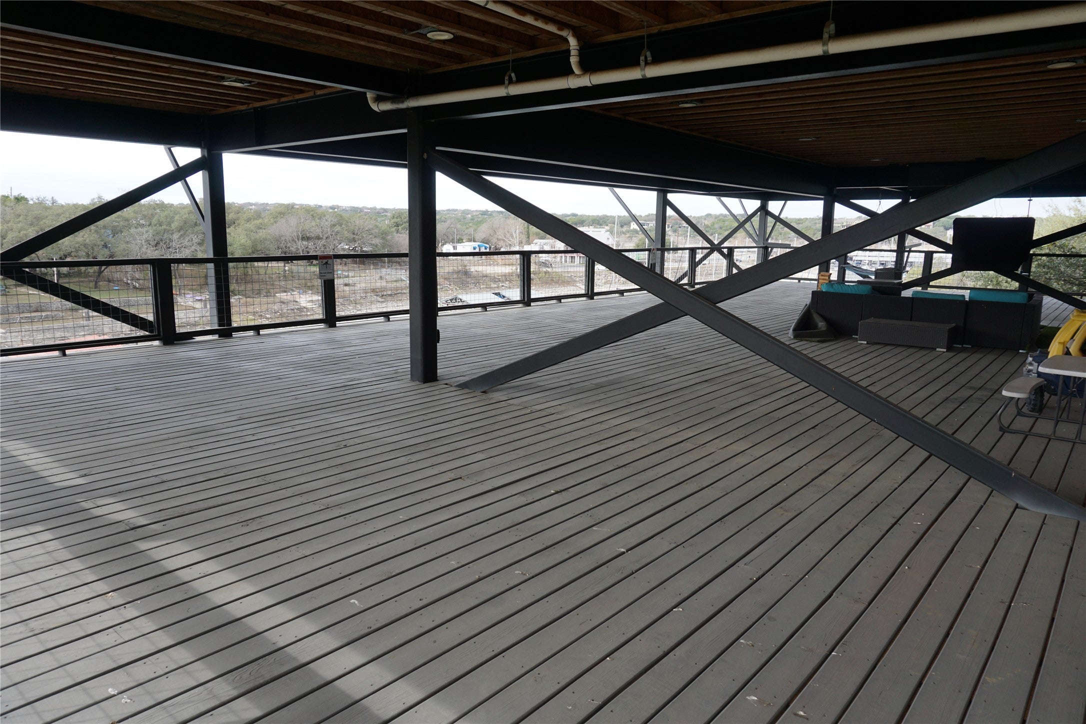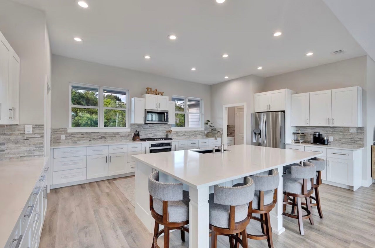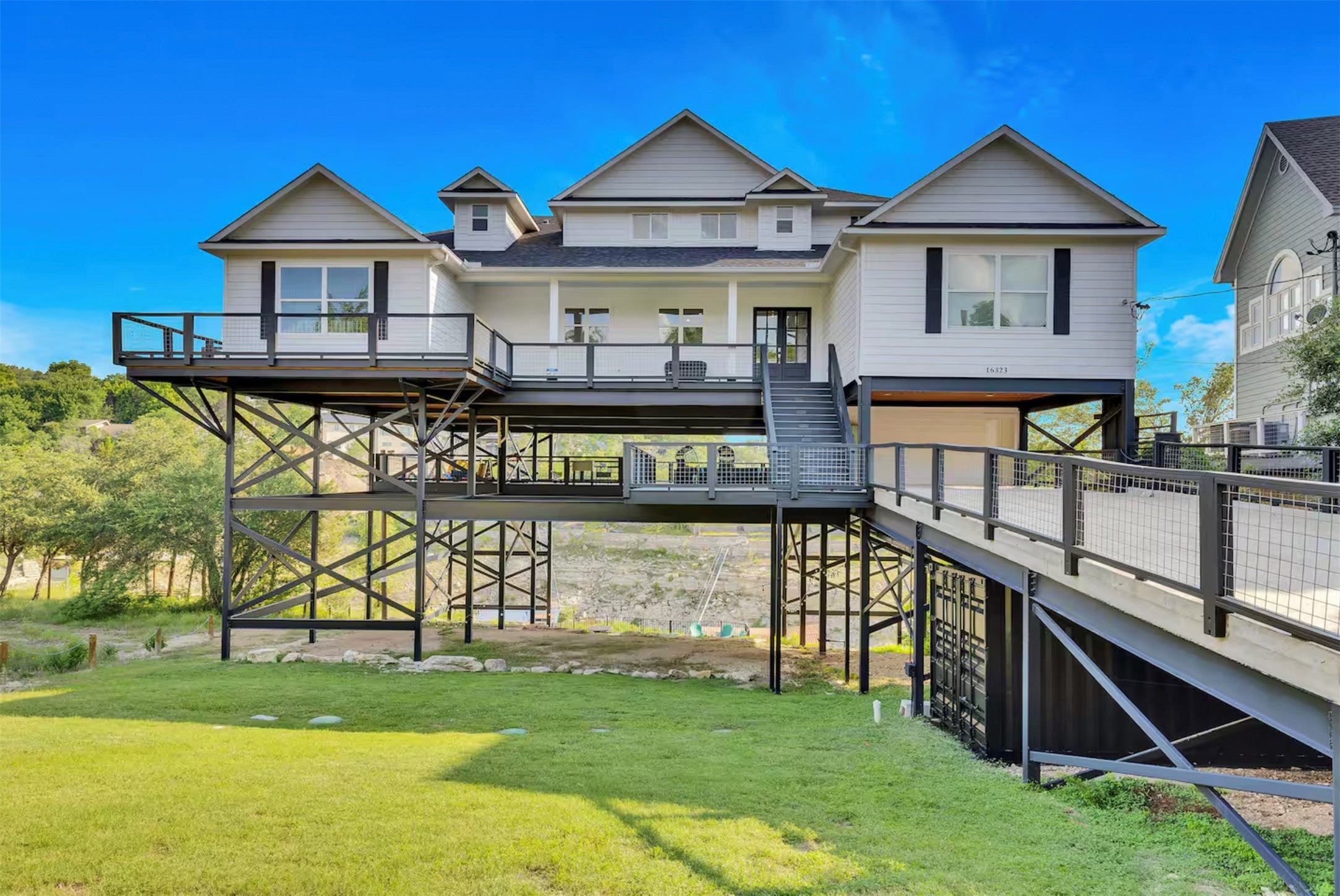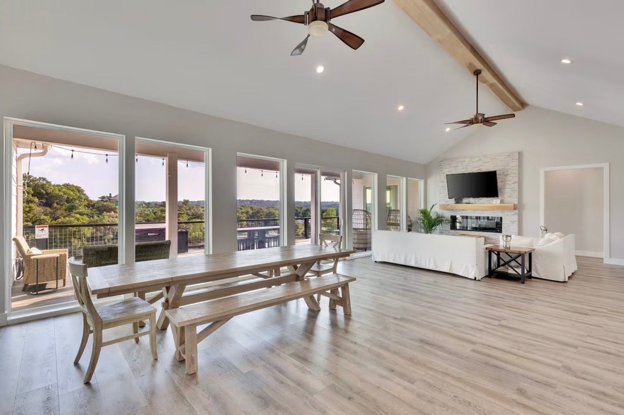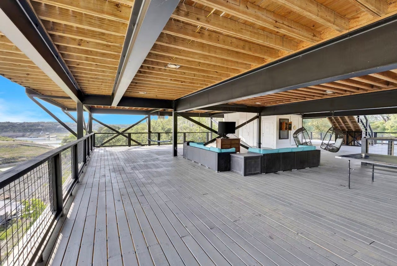 This custom-built lakefront home is located in a prime location, just outside of Lakeway. The contemporary home offers panoramic views of Lake Travis. Elevated on steel beams for flood protection, the property features an expansive lower deck with a ping pong table, outdoor living area with a TV, swings, and children's play equipment. The home is highly energy-efficient with spray foam insulation. Flooring is WPC - Wood Plastic Composite. These are 100% waterproof engineered luxury vinyl planks. Square Footage updated per prev. appraisal - over 4K+ living sq. ft. Inside, the open-concept design includes floor-to-ceiling windows. The kitchen is equipped with quartz countertops, ample storage, a built-in gas range, overhead microwave, and a large center island with a wraparound bar. The primary suite offers lake views, dual sliding door access to the deck, two walk-in closets, and an en-suite bathroom with a walk-in shower, jetted tub, and double vanities. The guest wing provides three bedrooms, each with a private bathroom, walk-in closet, and deck access from each bedroom. A media room features blackout curtains, shuffleboard, reclining couches, and futon beds. The upstairs guest room offers multiple bunk beds and a full bathroom. Potential for owner financing or assumable loan, buyer to do due diligence. Seller Motivated. The property is also a successful, turn-key short-term rental. Call today to schedule a showing!