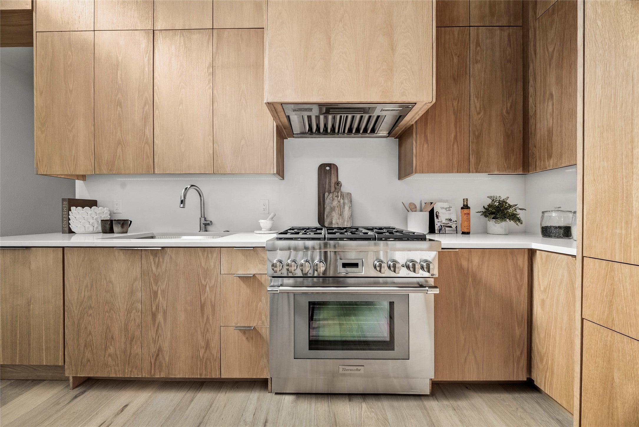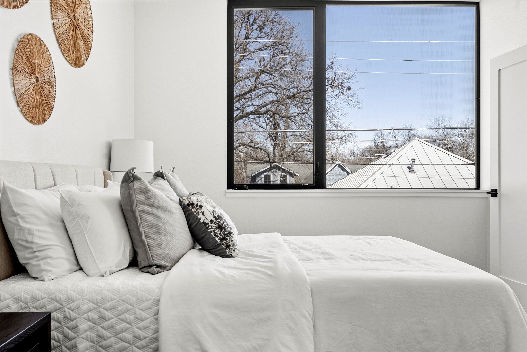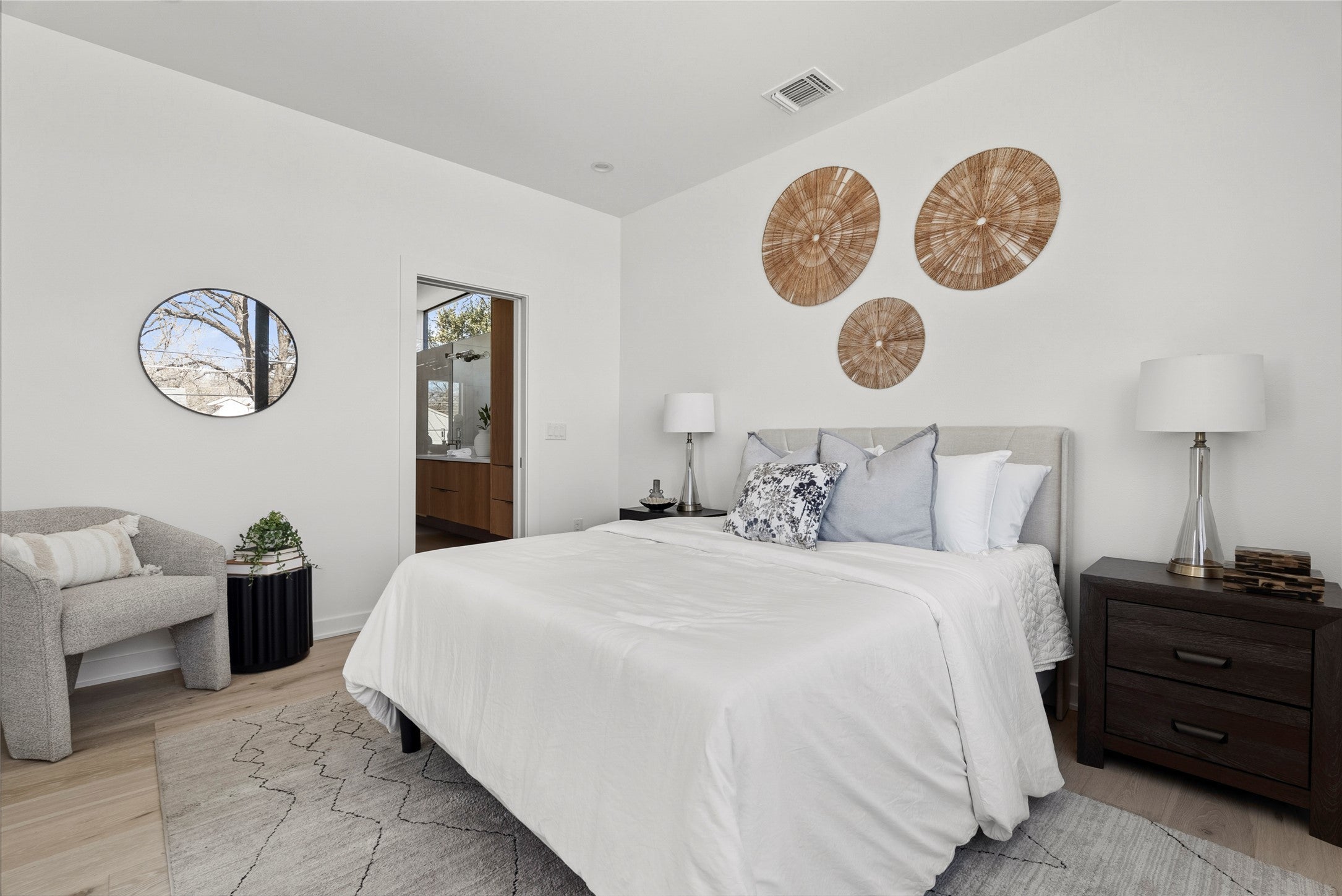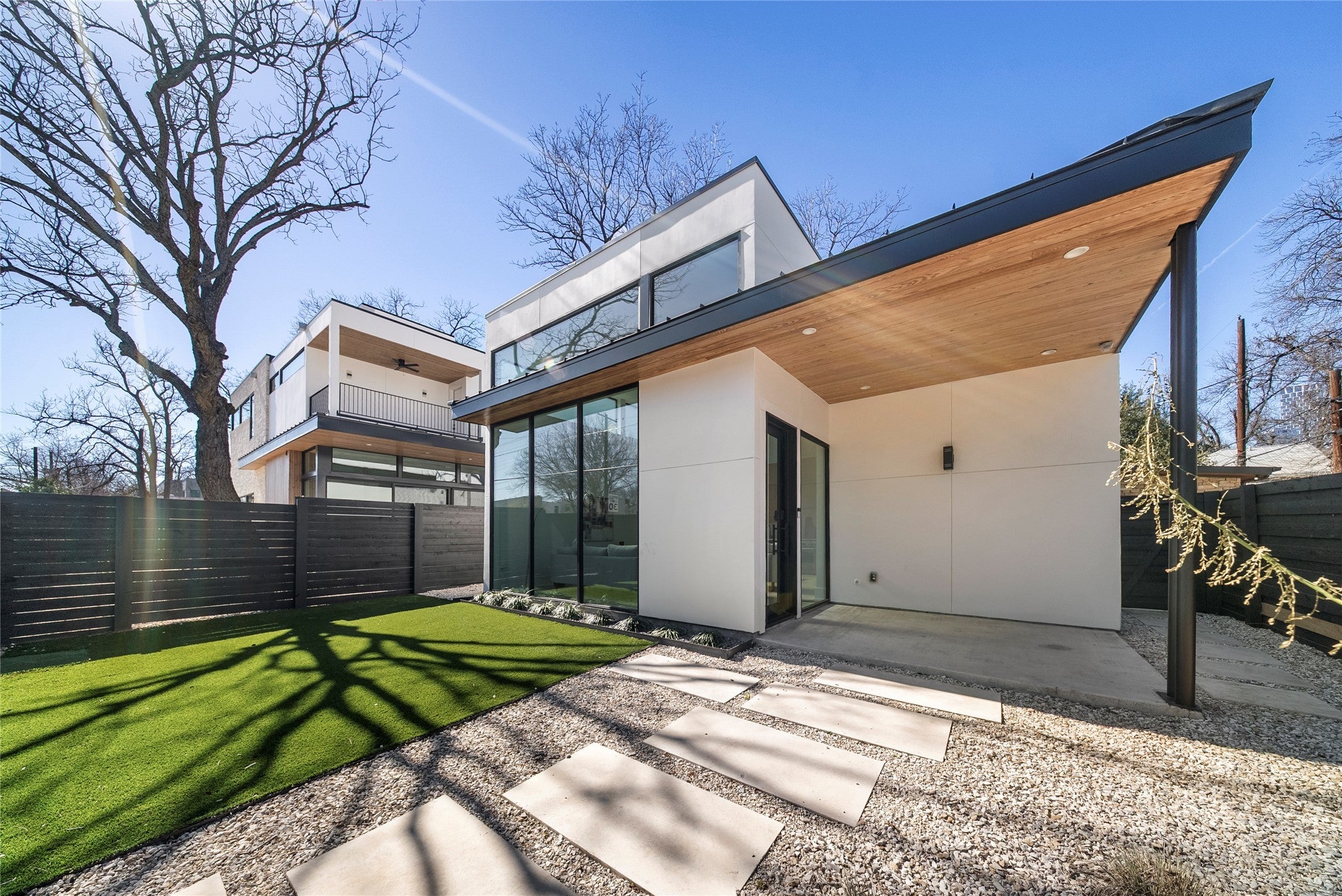 Dick Clark designed modern home with a fenced yard and low maintenance turf, creating seamless indoor outdoor living. The open concept main level features white oak cabinetry, Thermador appliances, and the clean contemporary lines that define Dick Clark architecture. An insulated one car garage includes an EV charger and LG smart washer and dryer. Upstairs the primary suite offers a double vanity and spacious closet with additional washer and dryer connections. Two zone HVAC, security wiring, and quality finishes throughout. Walk to Lady Bird Lake and enjoy quick access to downtown Austin, South Congress, and the city’s best restaurants and trails. This is the perfect lock and leave compound.