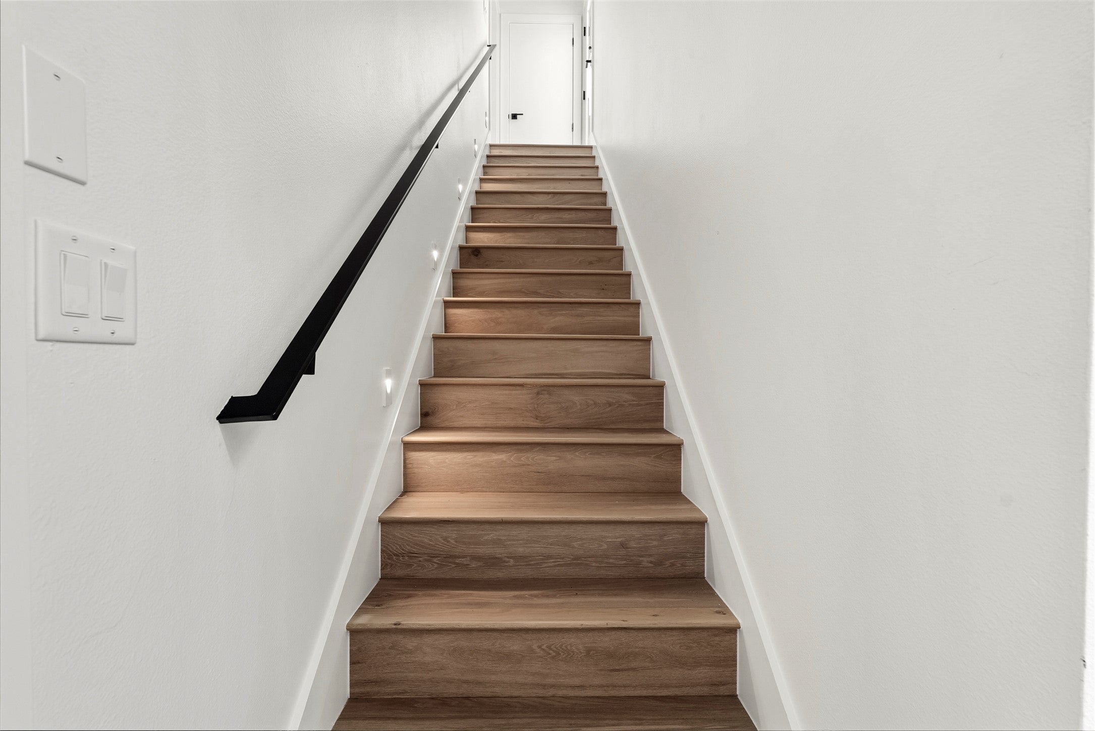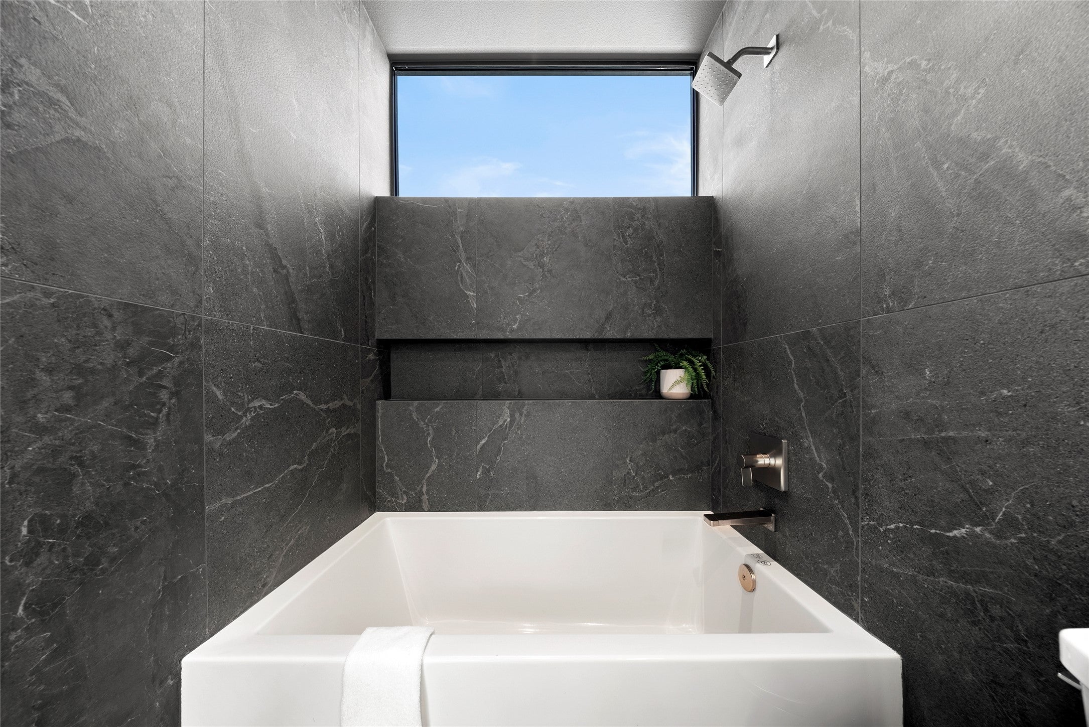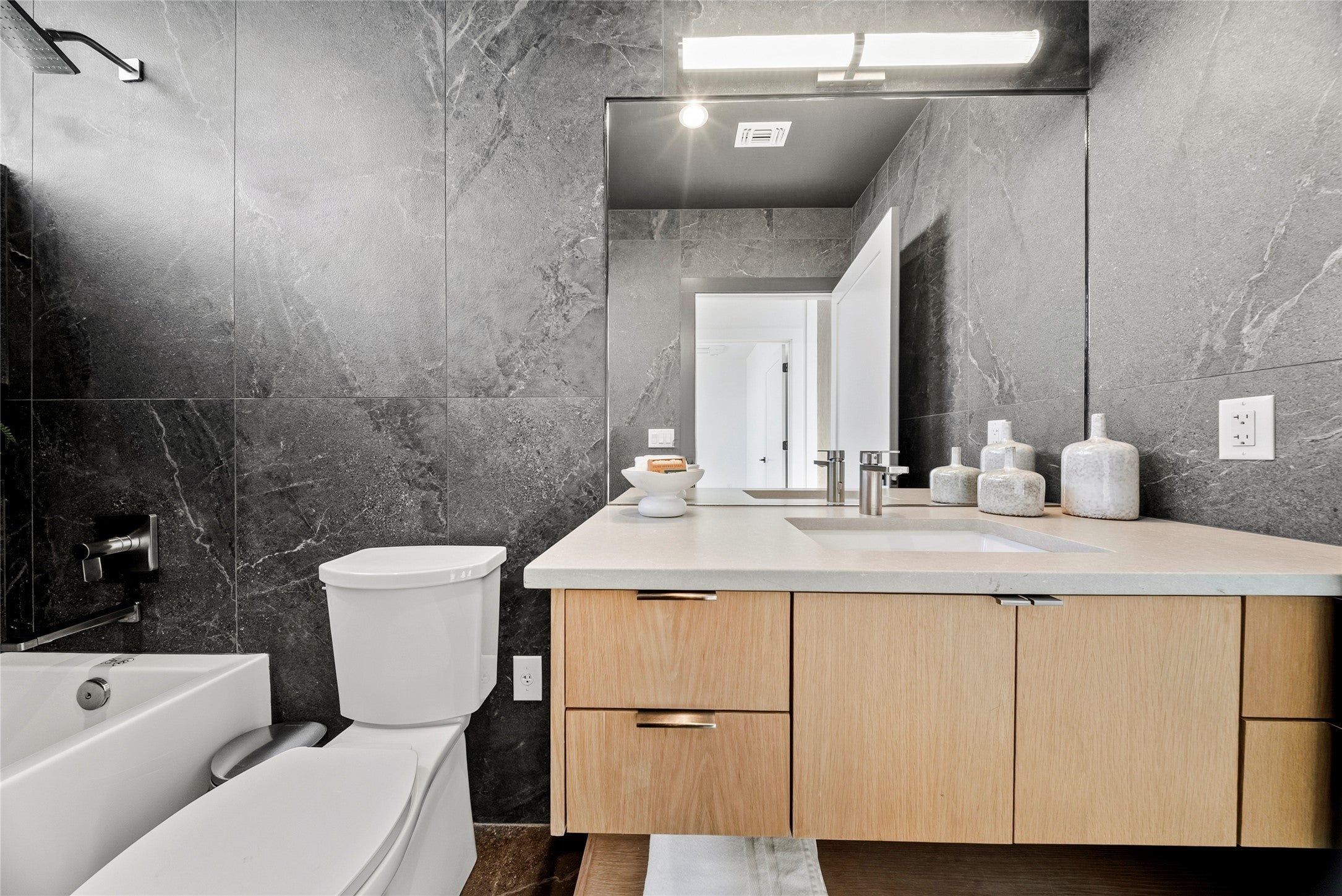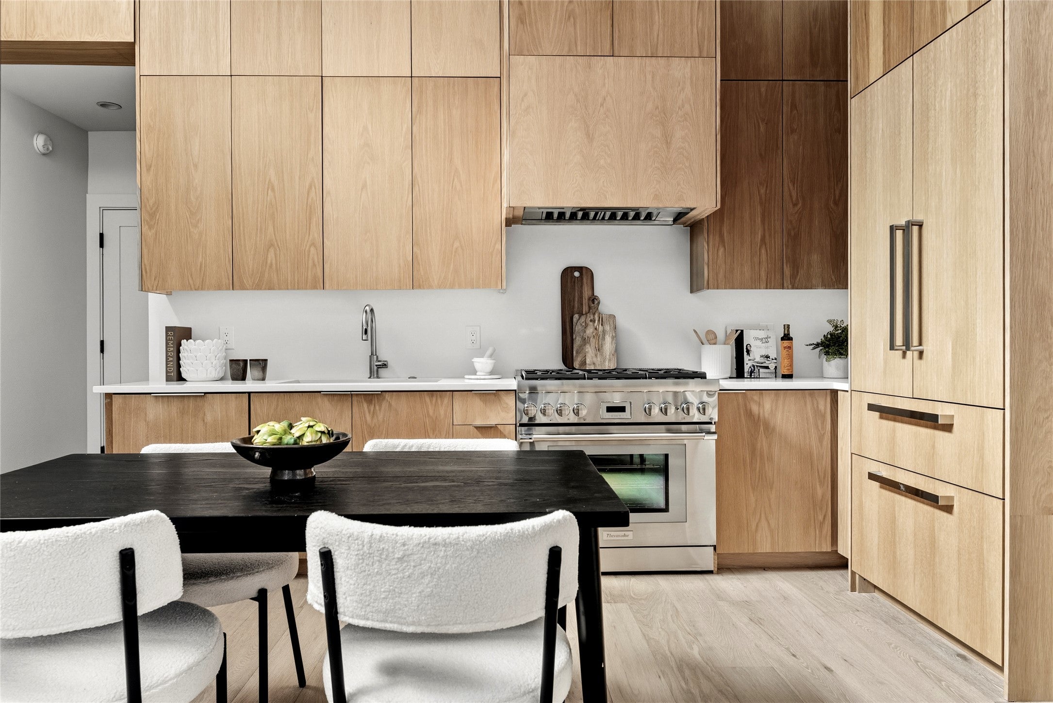 Dick Clark designed modern home with a fenced yard and low maintenance turf, creating seamless indoor outdoor living. The open concept main level features white oak cabinetry, Thermador appliances, and the clean contemporary lines that define Dick Clark architecture. An insulated one car garage includes an EV charger and LG smart washer and dryer. Upstairs the primary suite offers a double vanity and spacious closet with additional washer and dryer connections. Two zone HVAC, security wiring, and quality finishes throughout. Walk to Lady Bird Lake and enjoy quick access to downtown Austin, South Congress, and the city’s best restaurants and trails. This is the perfect lock and leave compound.