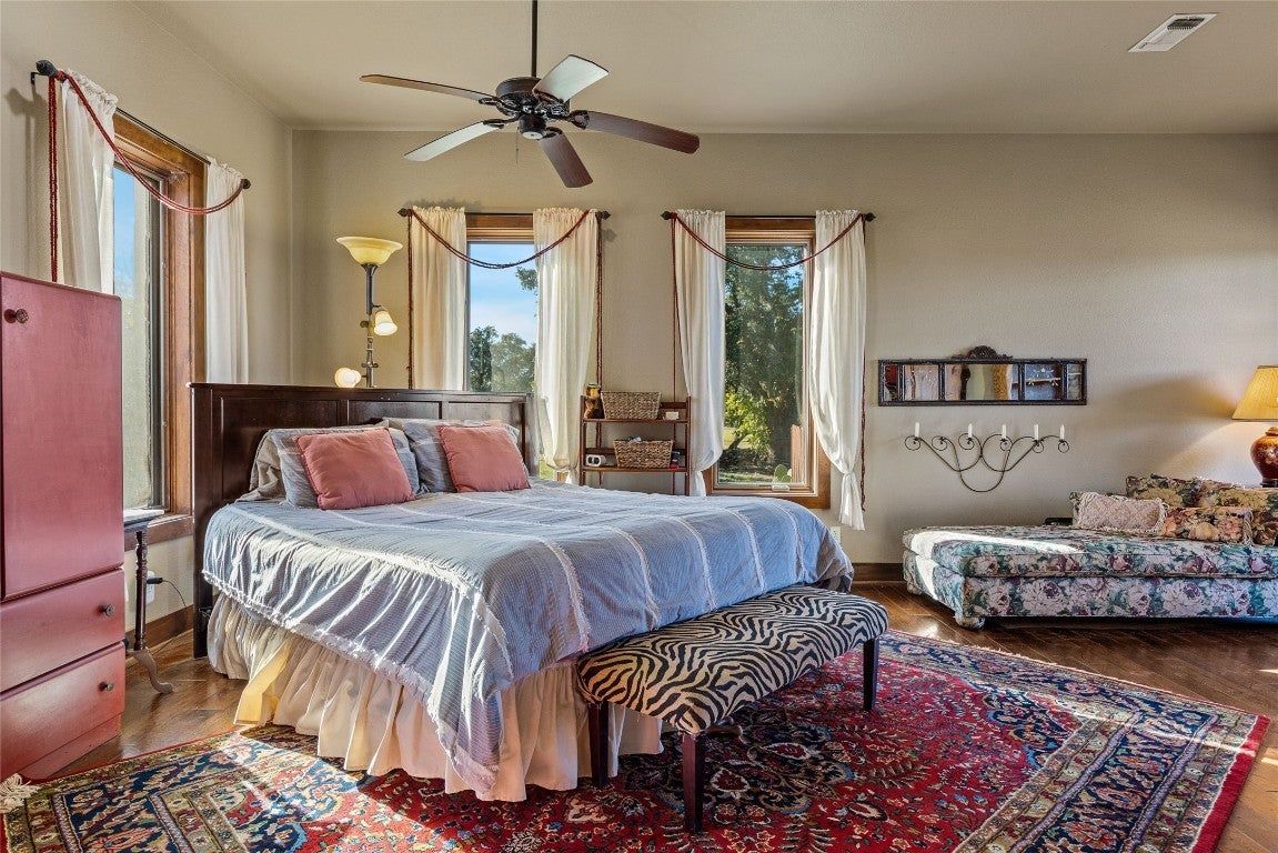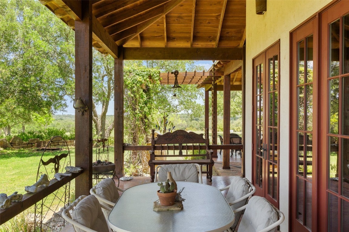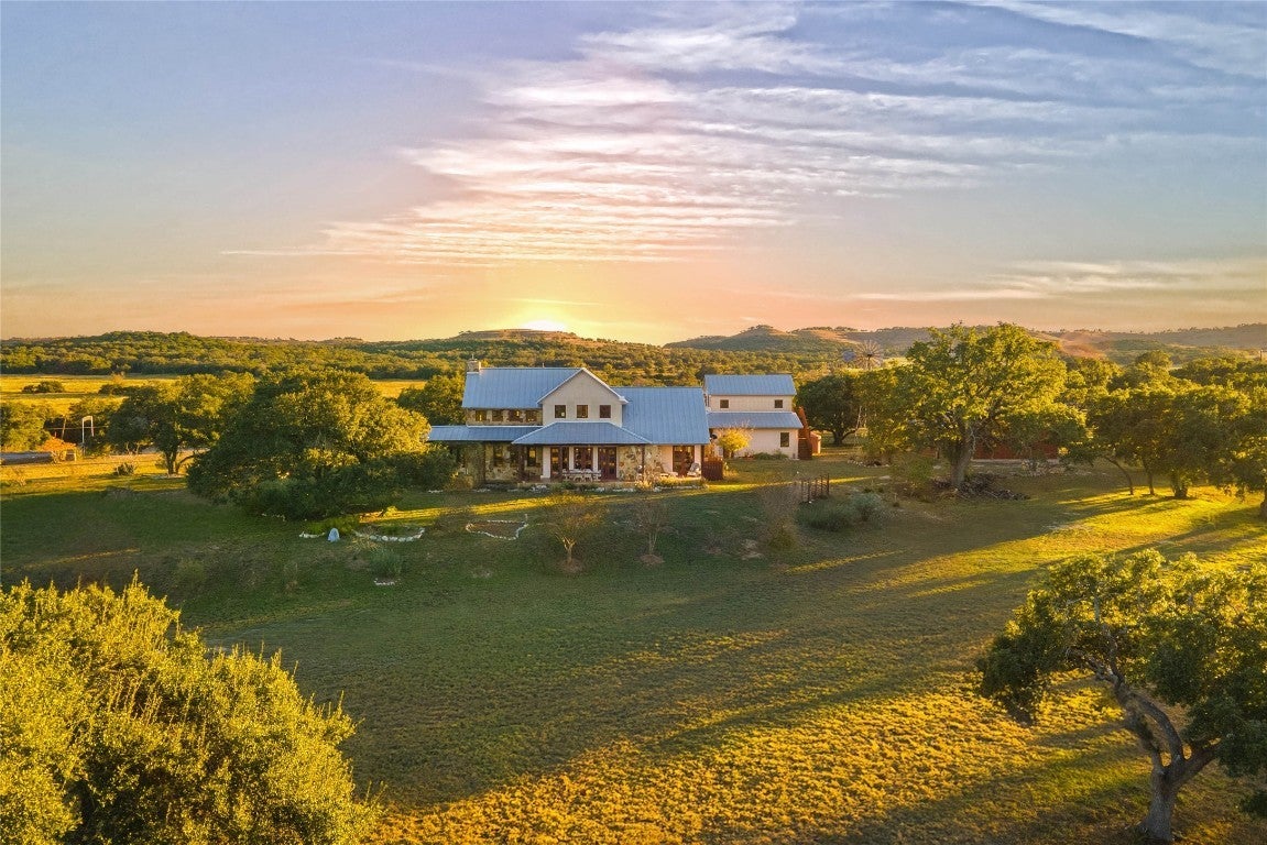 One of a kind 25± acre oak studded Hill Country retreat, offering serenity, privacy, and natural beauty just minutes from the Blanco Square. Anchored by a luminous 2,800± sq. finely crafted Hill Country home, the property also features a spacious carriage house with a 2.5 bay garage, inviting 1 bedroom, 1 bath casita, and a 40x45 workshop. From the moment you arrive, the property radiates a sense of peace and timeless charm. Thoughtfully designed to embrace sweeping Hill Country views, the home’s vaulted living room with exposed trusses and Texas sized stone fireplace creates an atmosphere of warmth and grandeur perfect for hosting gatherings or simply unwinding in quiet comfort. Expansive wood-framed windows invite the outdoors in, framing tranquil vistas of rolling pastures, heritage oaks, and colorful sunsets. The chef’s kitchen, with custom cabinetry, flows seamlessly into the dining area and out through French doors to alfresco spaces ideal for savoring fresh air and songbird melodies. The generous primary suite offers a restful escape with a private porch for quiet mornings surrounded by butterflies and gentle breezes. Upstairs, a lofted flex space and guest suite showcase the best views in the home, capturing the essence of the Hill Country’s beauty. Outdoor living abounds with a wraparound porch designed for grilling, entertaining, and soaking in serene twilight skies beneath the oaks and fruit trees. The carriage house provides abundant storage below and a charming casita above, while beyond the homestead, an 1,800± sq. ft. barn/workshop offers endless opportunities for projects or equipment. Usable, fully fenced acreage supports livestock or recreational enjoyment and benefits from a wildlife property tax exemption. Light and sensible restrictions preserve the tranquility of the land, while its prime location, less than 7 minutes from Blanco Square and Blanco River, and just an hour from Austin or San Antonio, makes it both a convenient and idyllic escape.