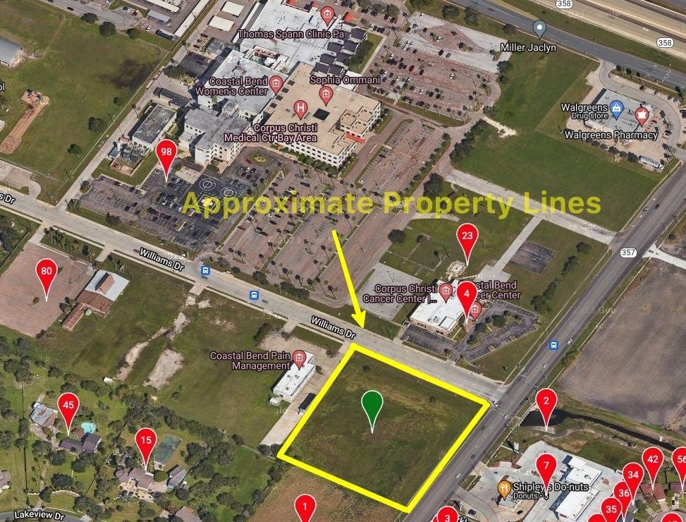 Over 3 acre commercial lot. Very busy corner vacant lot at the intersection of Williams Dr and 357. Right across the street from Corpus Christi Bay Area Hospital & Costal Bend Cancer Center. Right next door to Coastal Bend Pain Management Center. Just minutes to restaurants, shopping, retail, hotels, Texas A & M Corpus, and Naval Station. Most of the information provided is by a 3rd party source. The information seems reliable, but not guaranteed. Neither Seller or listing agent has verified the information provided or makes any warranties, representation, or guarantees as to accuracy of the data listed. Please make sure to do your own due diligence and verify all information and restrictions.