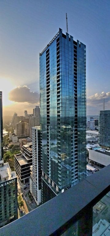 Vesper is a premier luxury condominium community in downtown Austin. It offers modern residences with high-end finishes and exceptional amenities. Residents can easily walk to Austin's best dining, vibrant nightlife, or scenic trail along Lady Bird Lake. This upgraded unit on the 39th floor, just below the penthouse, features roller shades throughout, including blackout shades in the bedrooms. The guest bathroom includes a custom-made shower curtain, while the kitchen boasts under-counter lighting and upgraded double ovens, perfect for any urban cook. The kitchen is equipped with Italian-made cabinetry, terrazzo quartz countertops, and Bosch appliances. This spacious 1,176 square foot corner unit has floor-to-ceiling windows that fill the space with natural light, 10-foot ceilings, and an open-concept layout. It includes two bedrooms, two bathrooms, and a generous balcony offering stunning views of the hill country and southwest sunsets. Residents of Vesper enjoy various amenities, including 24-hour concierge service, a rooftop lounge, a resort-style pool, private co-working spaces, and a fitness center equipped with state-of-the-art equipment, including private Peloton rooms and a yoga studio. This unit also includes two designated parking spots. Additionally, this unit can be sold as a fully furnished unit with Restoration Hardware and CB2 furniture for an additional package price. You literally would only have to pack a suitcase to move in.