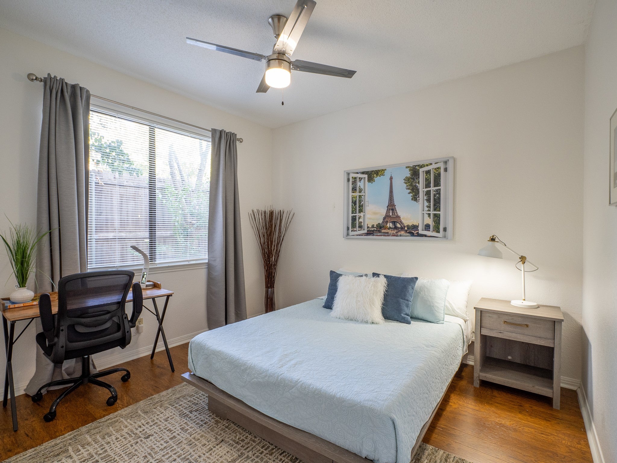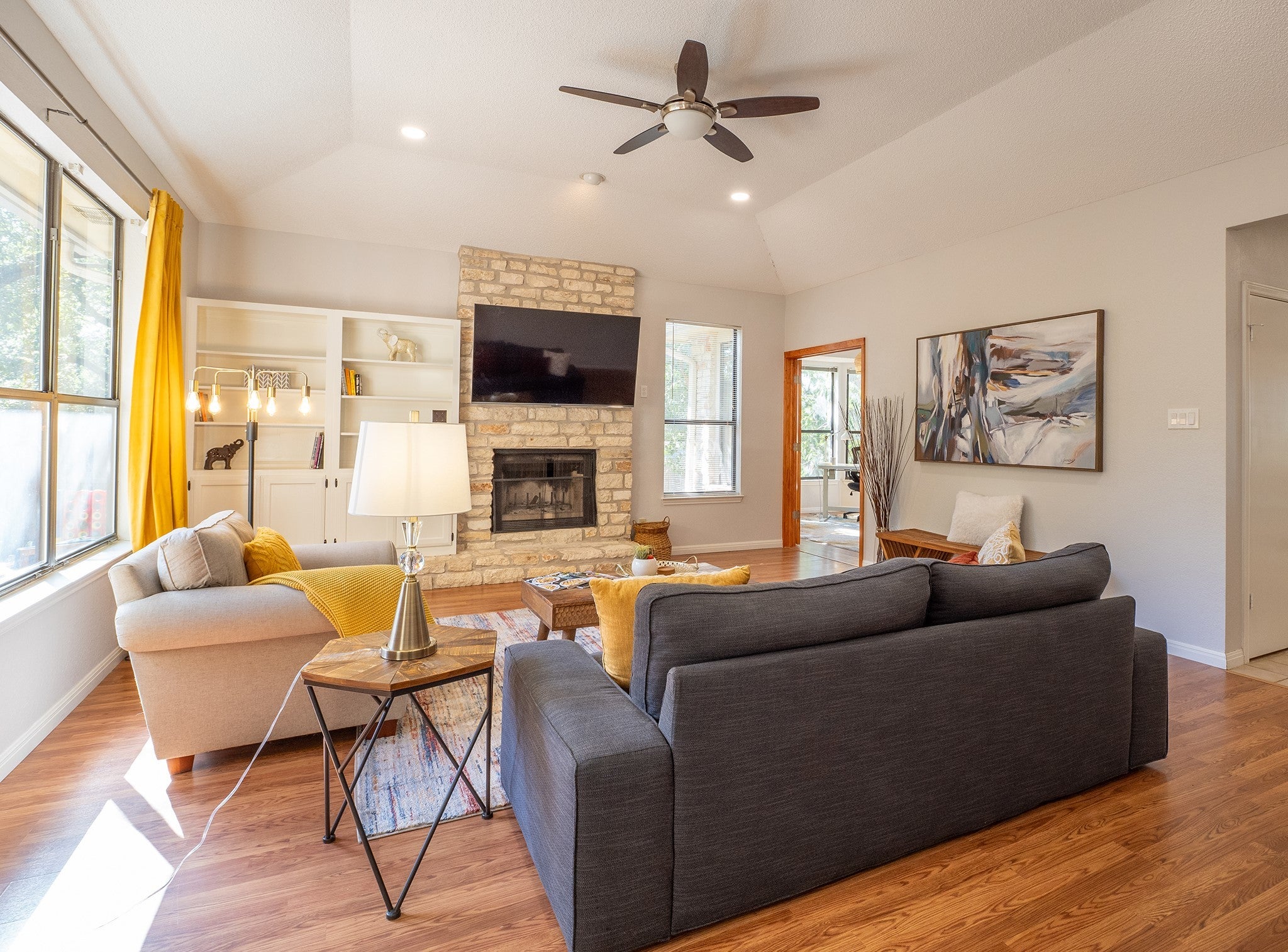 Come check out this beautiful family home in the mature Spicewood community in North Austin. This home is fully furnished and boasts lots of natural light and built-in storage throughout. The 4 bedrooms plus office are spacious including a master bedroom with king size canopy bed and back patio entrance. Master bath is equipped with a soak tub, shower, and double vanities. There is a large living room and eat in kitchen along with a stand-alone office, perfect for a work from home lifestyle. This property also boasts a fully fenced yard with oversized back patio, mature trees, and outdoor eating area. This house is in the Round Rock ISD zone and feeds to Laurel Mountain Elementary Canyon Vista Middle, and Westwood High School. Community Park and playground are a short walking distance from the home as well! Utility Cap- 350/month One Time Cleaning Fee- $425