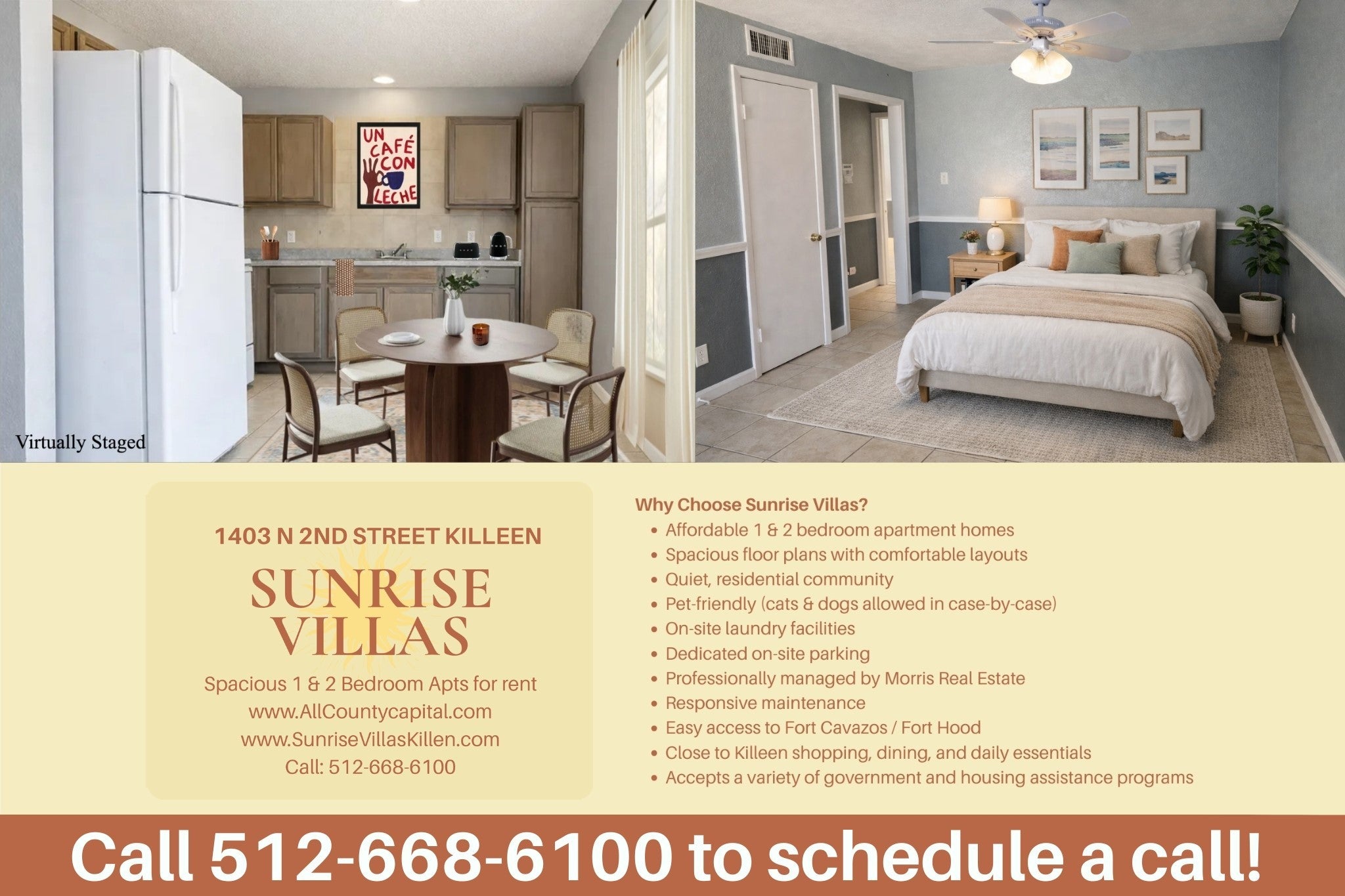 Welcome to Sunrise Villas, an affordable & professionally managed 1- and 2-bedroom apartment community located just 5 to 10 minutes from Fort Hood (Fort Cavazos) in Killeen, TX. Whether you are: - An active-duty service member stationed at or relocating to Fort Cavazos - A military retiree or veteran seeking affordable, low-maintenance living - A small family looking for a quiet, stable community - Or simply searching for budget-friendly apartments in Killeen and near Temple Sunrise Villas offers clean, comfortable living with convenient access to base, shopping, schools, and major roadways. Community Features - Spacious 1- and 2-bedroom layouts - Full kitchens with appliances - Central heat & air - On-site laundry facility - Dedicated parking - Professionally managed, quiet residential setting If you're searching for off-base housing near Fort Cavazos or military-friendly apartments in Killeen, Sunrise Villas provides practical, well-maintained homes at competitive pricing. Military & Housing Program Friendly - Fort Cavazos Rental Partnership Program (RPP) Application in progress - CITCOG Housing Assistance accepted - Section 8 / Housing Choice Vouchers welcome - We honor the **Service Members Civil Relief Act (SCRA)** for qualifying orders Rental Requirements - Verifiable income of approximately 2.5x monthly rent - Background screening - Rental history verification - No recent evictions - Valid government-issued ID - We understand military pay structures and BAH and are happy to assist during the verification process. Application Process & Fees - Contact our property management team to check availability - Schedule a tour of the property and available units - Submit an application ($50 application fee per applicant) - Pay the security deposit (typically equal to one month's rent) - Sign your lease and receive your keys. Welcome home! CALL All County Capital to schedule a tour today!