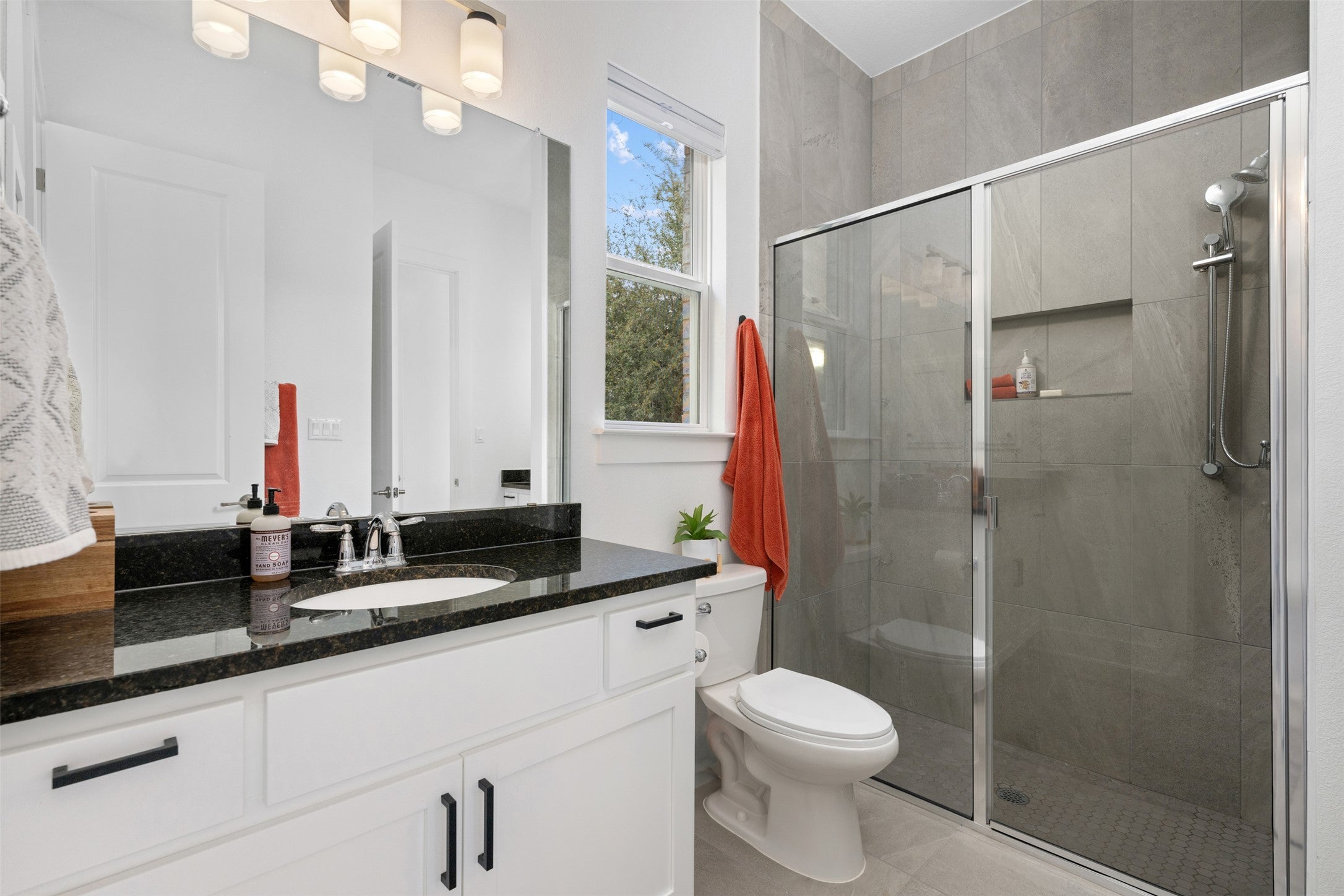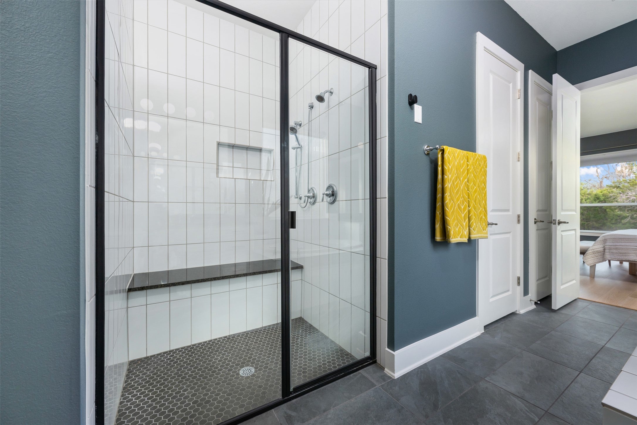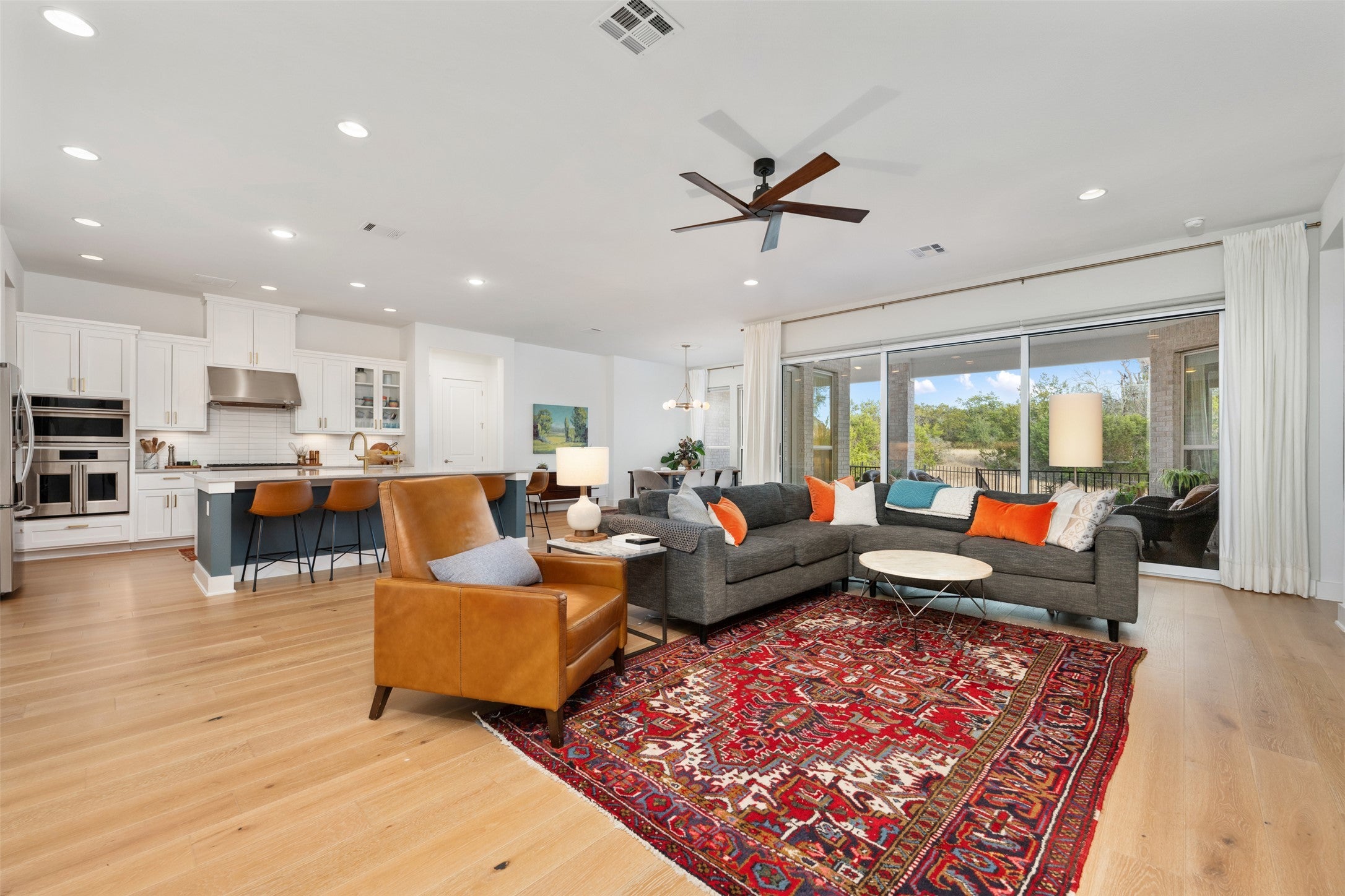 Refined design and elevated craftsmanship define this exceptional residence in Parten Ranch, where thoughtful upgrades create a sophisticated, luxury living experience. The main living area is anchored by a dramatic floor-to-ceiling custom-tiled fireplace, highlighted by a custom walnut mantel and white oak shelving. Cantilevered custom cabinetry with quartz countertops on either side of the fireplace adds architectural distinction and functional elegance. Designer window treatments are featured throughout the home, including room-darkening, top-down/bottom-up, and insulating blinds, with motorized blinds in the living room and primary bathroom. Most lighting is enhanced with dimmers and complemented by upgraded lighting fixtures and designer ceiling fans throughout. The media room is designed for an immersive experience, featuring built-in surround sound, projector pre-wiring, and enhanced sound insulation. An upgraded whole-house insulation package further elevates comfort, efficiency, and privacy. The chef’s kitchen showcases upgraded Vicostone quartz countertops, premium GE Monogram appliances—including a microwave/convection oven and an additional convection/self-cleaning oven—and extensive upgraded pull-out cabinetry. Brass fixtures and cabinet hardware add warmth and refinement, while Multipure water filtration enhances everyday living.The primary suite offers extensive custom “his and hers” closet detailing, creating a boutique-style wardrobe experience. Additional upgrades include upgraded carpet and wood flooring, upgraded shower slide bars, a tankless on-demand water heater, keyless front-door entry, and upgraded interior door hardware throughout. Entertaining is effortless with a well-appointed butler’s pantry featuring quartz countertops, custom cabinetry, and a wine refrigerator. Outdoors, a private tiled patio provides a serene setting for relaxing or hosting guests.
