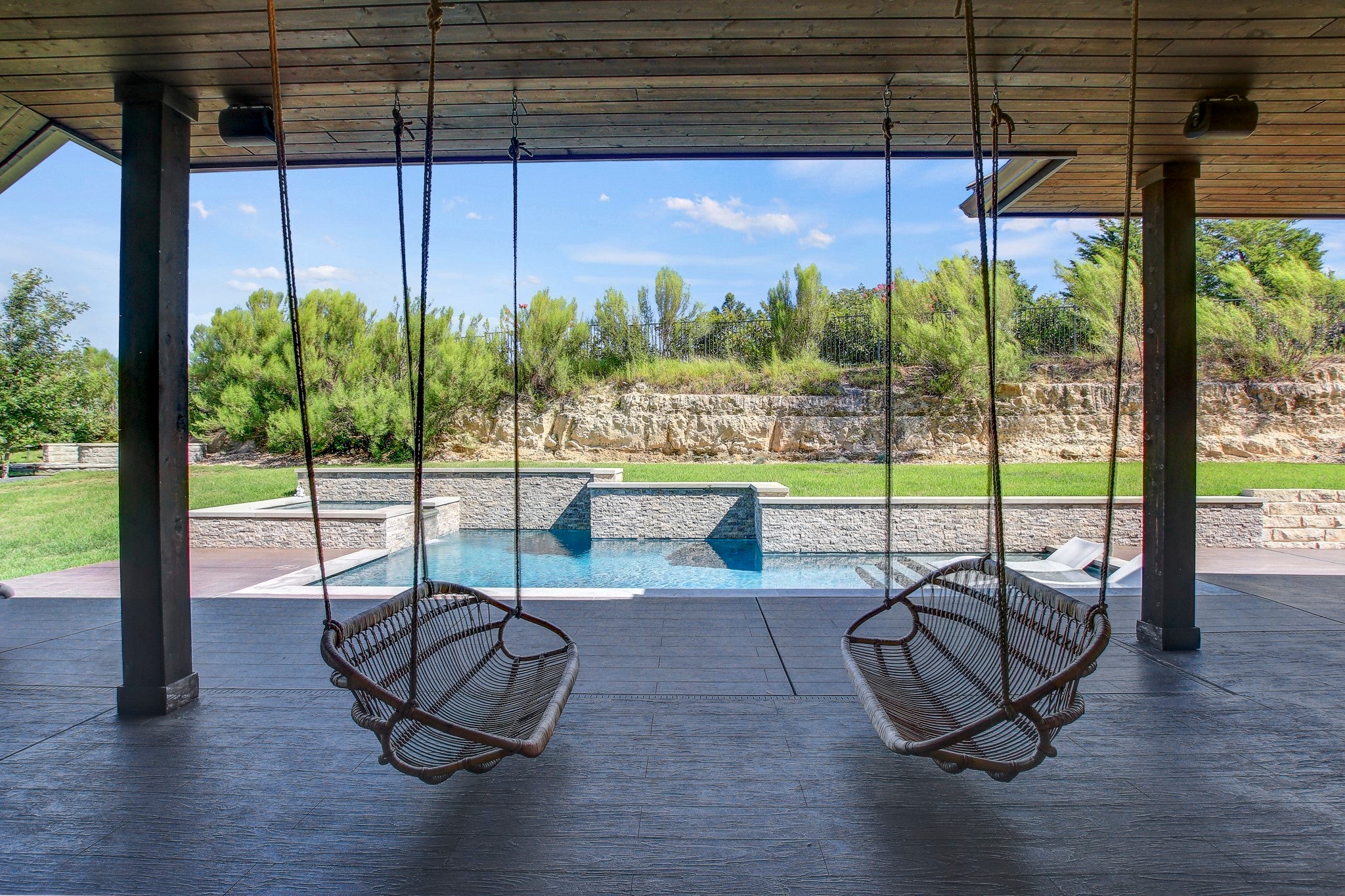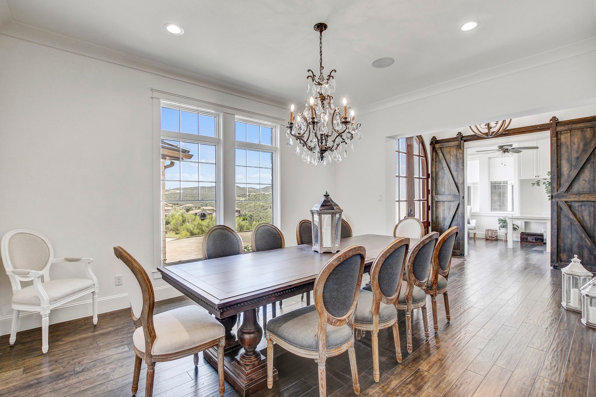 Welcome to this remarkable Sterling Custom Home with 4 bedrooms and 5.5 bathrooms, and breathtaking views. Sitting on a sprawling 0.38-acre lot and spanning over 4,500 sqft, this 2-story residence boasts a 3-car garage, a temperature-controlled home gym, rec room, bar, and home office, all featuring the finest craftsmanship and attention to detail. Inside you’ll discover a stunning interior featuring elegant hardwood floors throughout. A dining room comfortably seats 12, with access to a 500 bottle, temperature-controlled wine cellar. The spacious living areas include a double-sided wood and propane fireplace, perfect for cozy evenings and entertaining guests. Bifold doors seamlessly blend indoor and outdoor living, leading to an expansive patio area complete with stamped concrete, a sparkling Anthony & Sylvan pool, spa, and fire-pit—a true oasis for relaxation and enjoyment. A full outdoor bathroom enhances convenience and comfort for poolside gatherings. The gourmet kitchen is equipped with top-of-the-line Thermador appliances, a quartzite island, quartz countertops, custom hardwood cabinetry, and a butler's pantry with a Miele coffee and cappuccino maker, ideal for starting your day. The first floor home office comes with a custom built in desk, and offers outstanding hillside views. Upstairs, the owner’s suite offers serene views and a spa-like ensuite bath, creating a peaceful retreat. Three additional bedrooms provide space for family and guests, each with its own en suite. Located in the exclusive Waters Edge section of Rough Hollow, this home is a 10 minute walk to the marina, The Grill community restaurant, miles of hill country hiking and bike trails, as well as the World of Tennis Athletic Club. Don't miss your chance to experience luxurious living in this exceptional home.