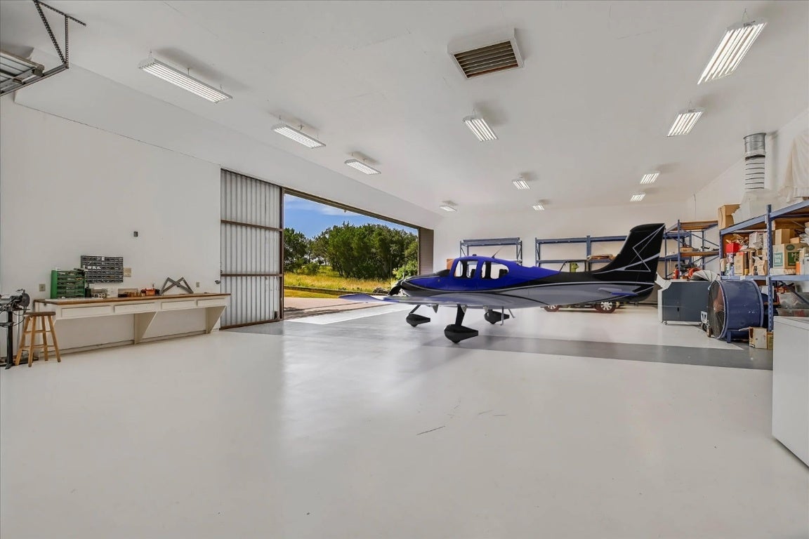 Rare aviation lifestyle property adjacent to the gated Horseshoe Bay Jet Center. This 0.68-acre lot includes a remodeled 2-story home, detached guest casita, and a 2,700+ sq ft aircraft hangar with direct taxiway access to the private 6,000-ft lighted runway. Main home offers 2,714 sq ft, 3 beds, 2.5 baths, updated kitchen w/ tile counters & stainless steel appliances, open living/dining areas, and spacious primary suite w/ private balcony and Hill Country + Lake LBJ views. Space available to add an elevator. Detached 544 sq ft guest casita includes 1 bed, 1 bath, kitchenette, and office/flex space. Hangar features 50 ft. manual bypass door, oversized automatic RV door, epoxy floors, and ample space for aircraft, boats, RVs, or storage. Additional helipad area for a helicopter or secondary aircraft parking. Located near golf, lake, and resort amenities in Horseshoe Bay. Ideal for aviation enthusiasts, second-home owners, or live/work setups.