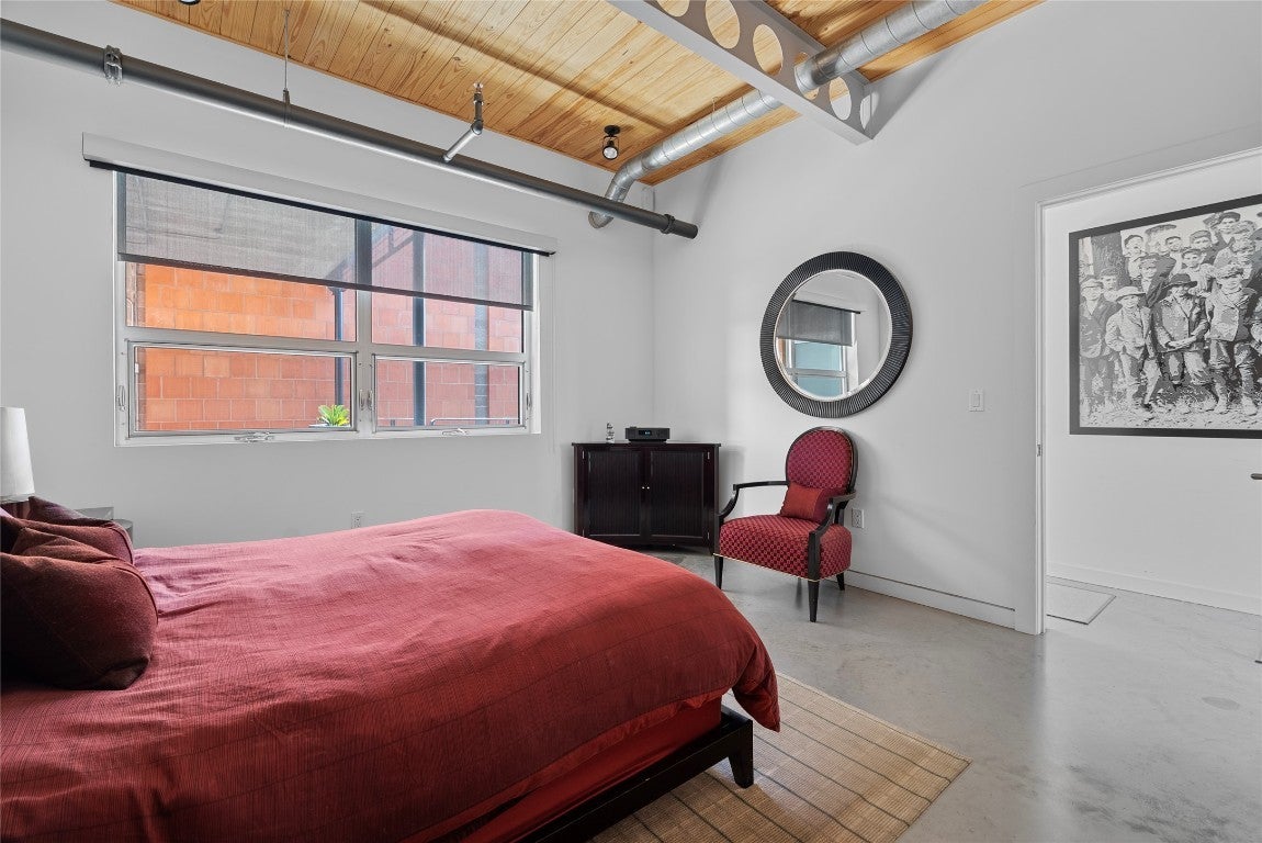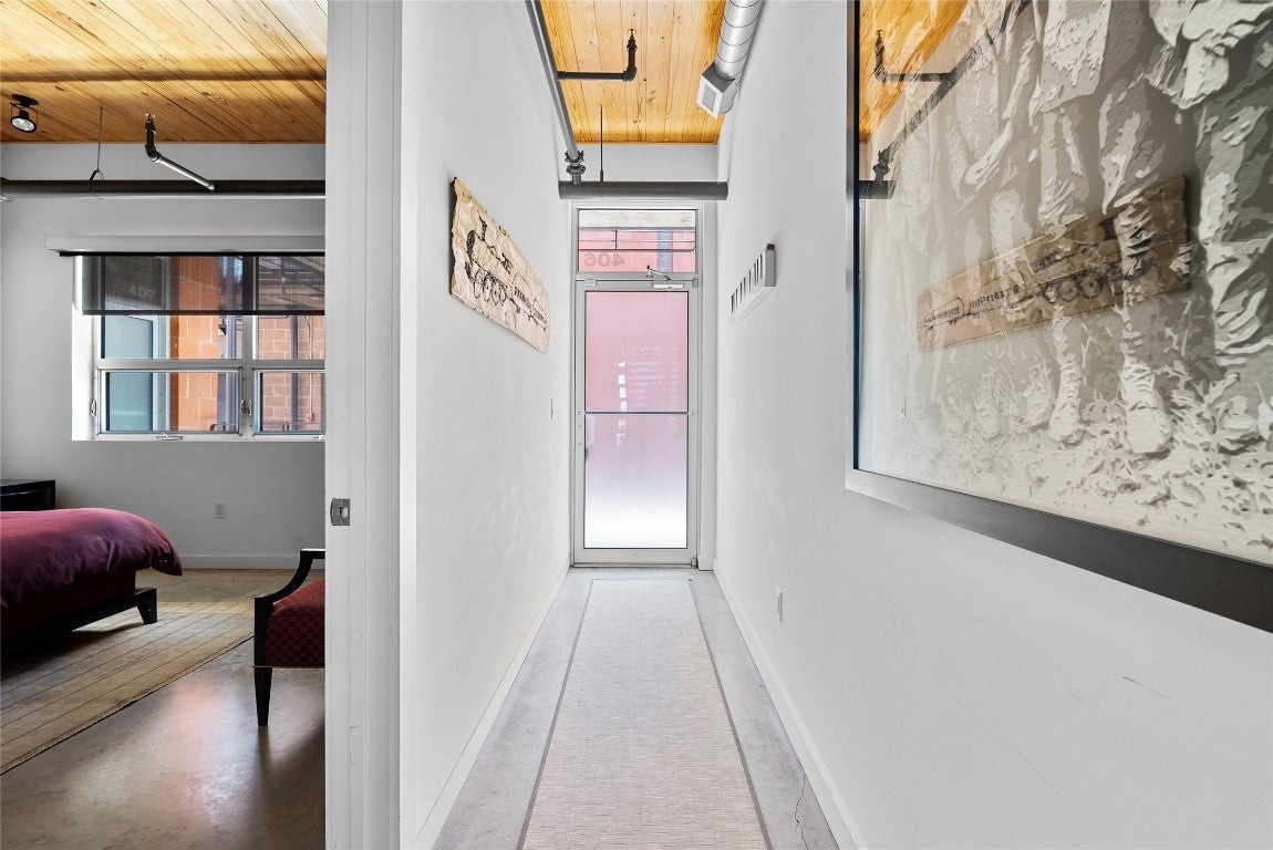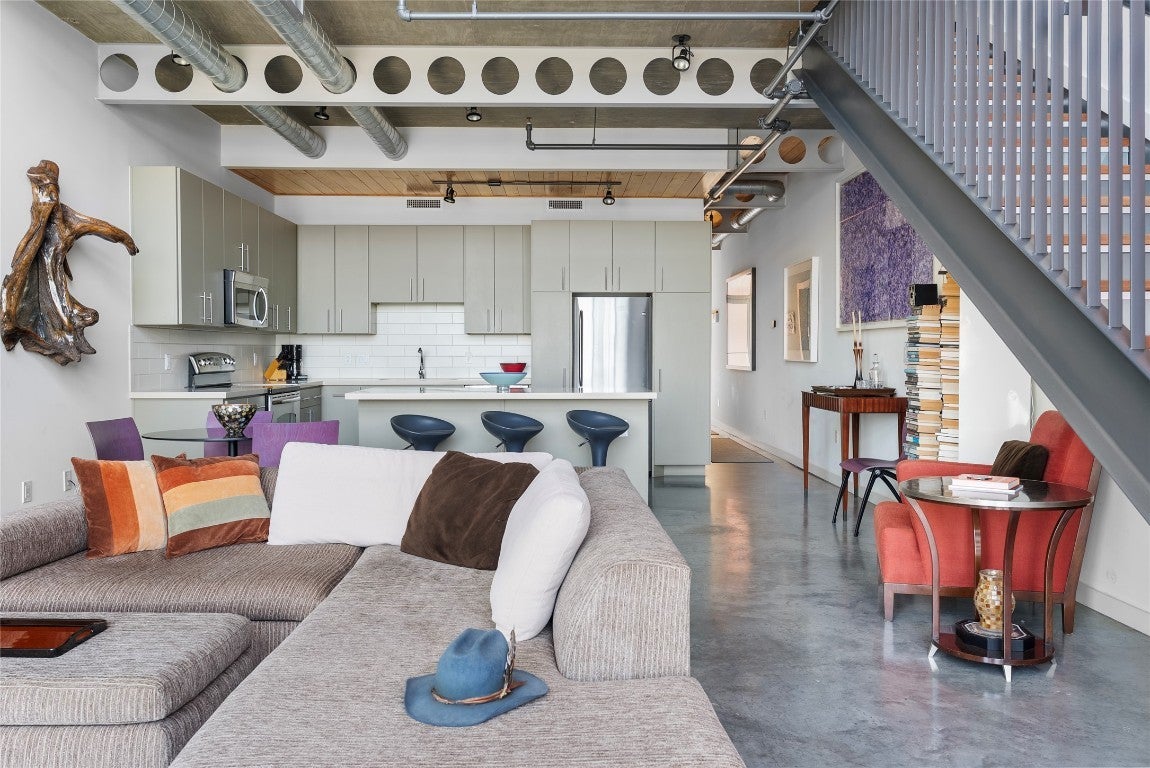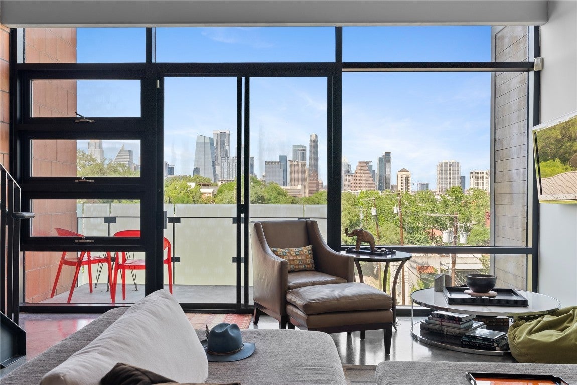 Modern loft living in the heart of South Congress, designed by iconic Austin architect Dick Clark. This two story residence offers true lock and leave convenience with panoramic downtown views, a private rooftop terrace, and two reserved parking spaces. Soaring ceilings, exposed ductwork, concrete and wood finishes, and floor to ceiling windows define the open industrial aesthetic. The main level features an open kitchen and living space filled with natural light, ideal for everyday living and enjoying the skyline. A spacious guest bedroom with en suite bath is privately located on this level. Upstairs, a flexible room features European style bunk beds that fold up and convert into a desk, creating a highly functional setup for work or guests. A second floor hallway leads to the light filled primary suite with dual vanities, walk in shower, and generous storage. The crown jewel of the home is the private rooftop deck, perfect for entertaining, relaxing, or enjoying sweeping downtown views. Located just steps from South Congress favorites including Perla’s, June’s, Guero’s, the Continental Club, and premier shopping. This is urban Austin living at its best, ideal as a primary residence, second home, or turnkey city retreat.