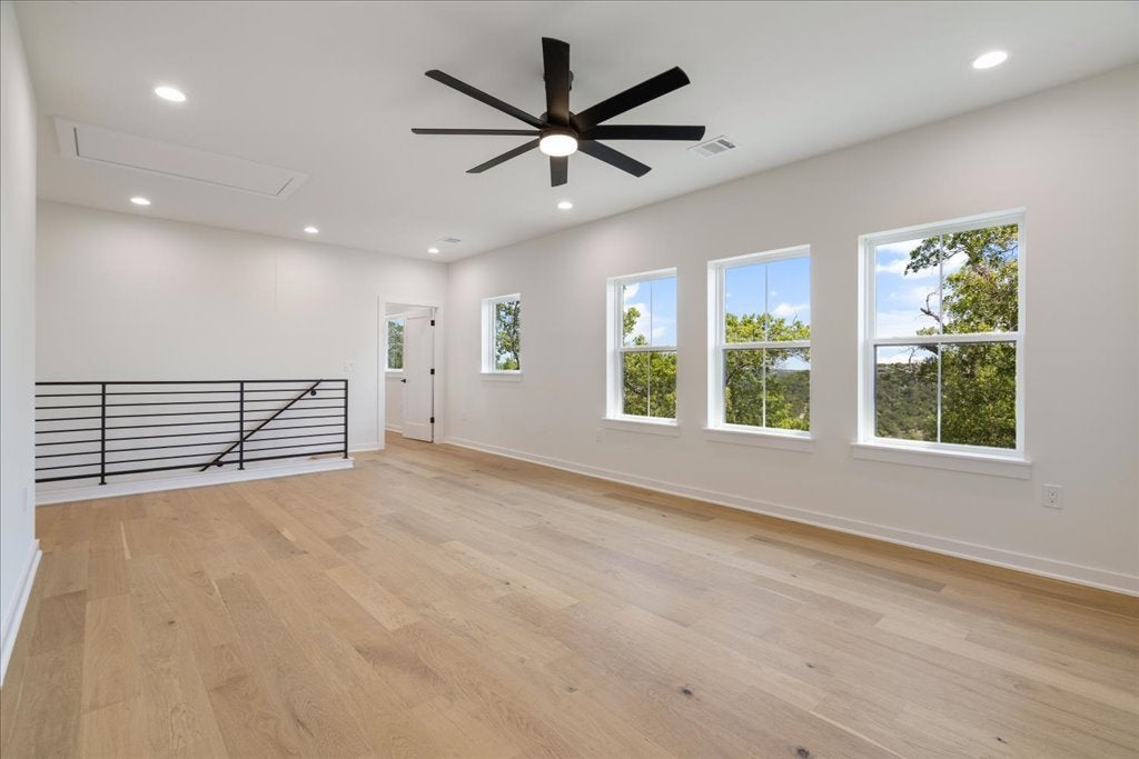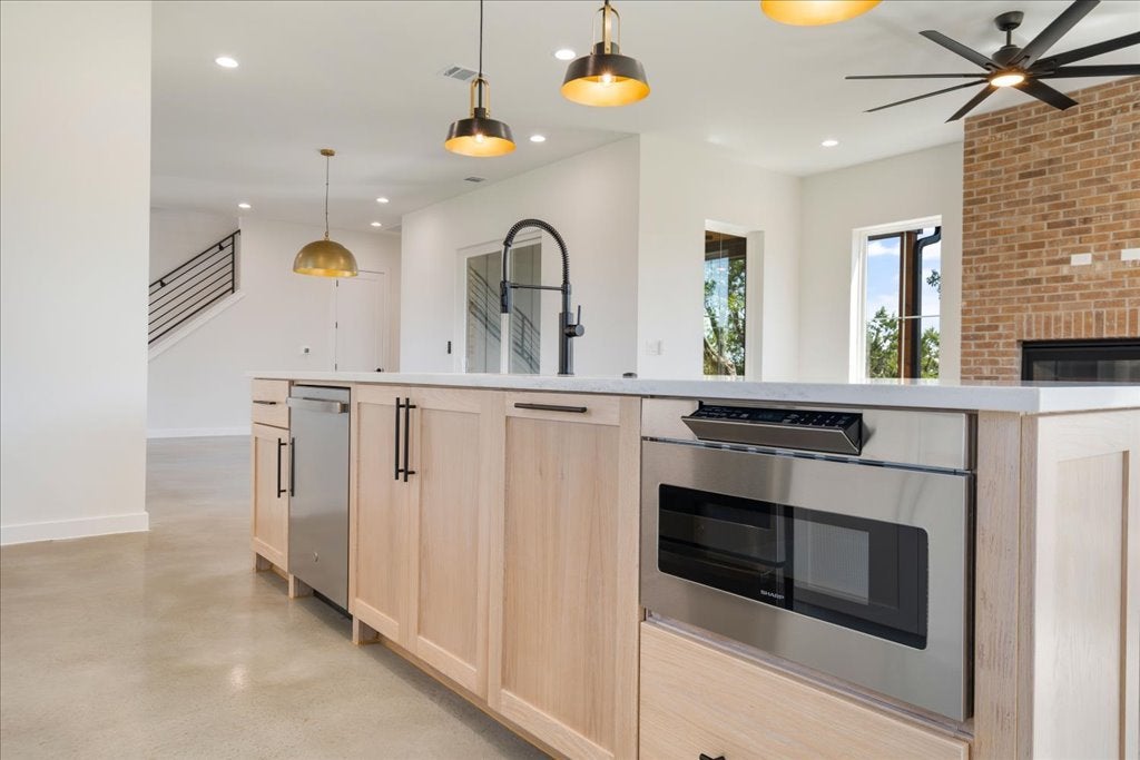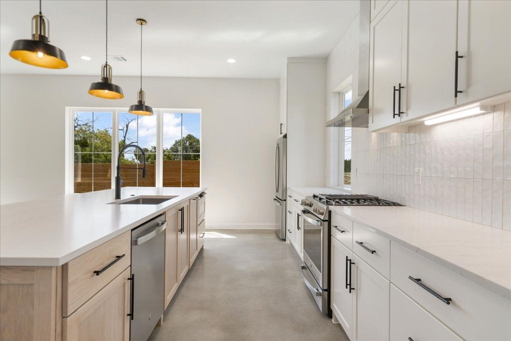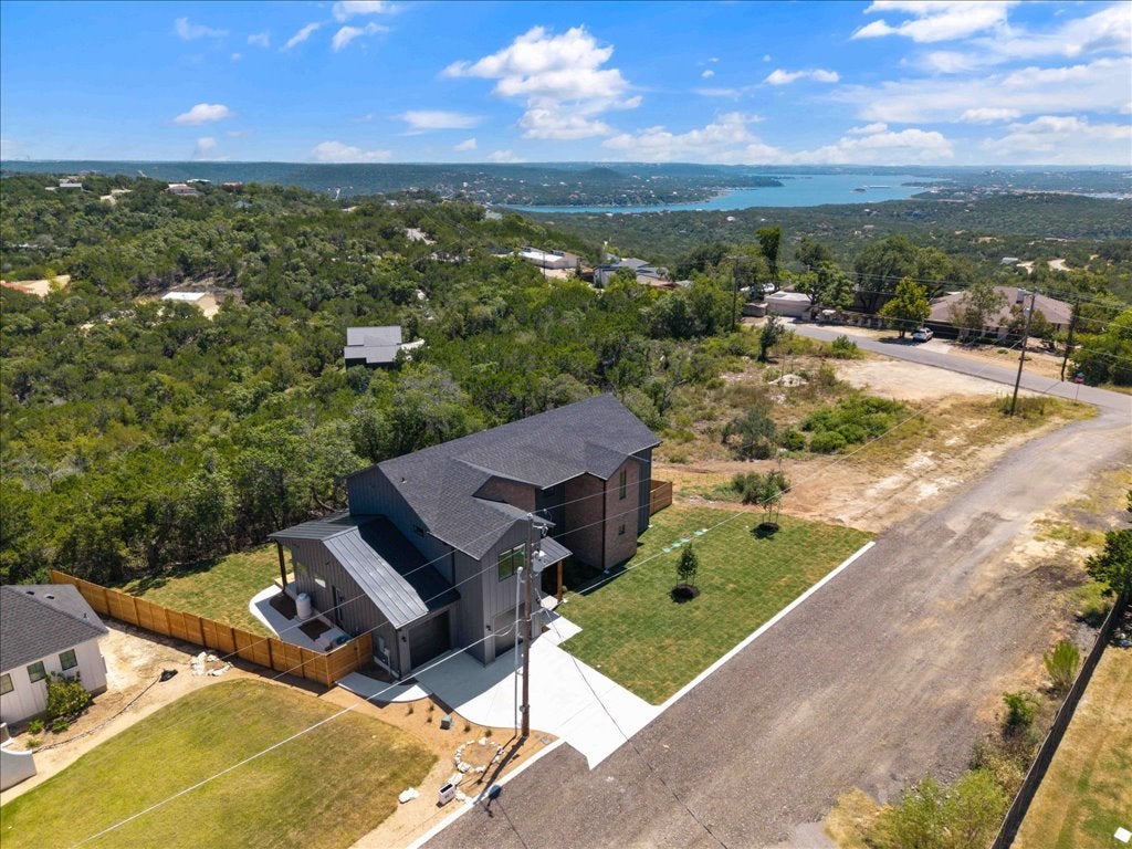 Welcome to 8609 Nina Lane, a modern farmhouse where contemporary design meets the serenity of the Hill Country. This brand-new 4-bedroom, 3.5-bath, 3,093 sq. ft. home offers refined craftsmanship, natural finishes, and sweeping views. The open-concept living area is anchored by a striking floor-to-ceiling gas fireplace, framed by walls of windows that flood the space with light. The chef’s kitchen—with quartz countertops, custom cabinetry, and an oversized island and large walk in pantry—flows seamlessly into dining and living areas, creating the perfect setting for gathering with family and friends. Polished concrete floors downstairs provide a sleek, durable foundation, while engineered hardwood floors upstairs bring warmth and character. The primary suite offers a peaceful retreat, views for days, a spa inspired bath featuring dual vanities, soaking tub, and an extra large walk-in shower. A highlight of this home is the downstairs Junior Suite with its own private patio, walk-in closet with stackable washer/dryer hookup, and a private ensuite bathroom—ideal for multigenerational living or offering guests comfort and privacy. Upstairs, a versatile loft adds room for a media area, playroom, or office, along with two guest bedrooms with a shared bathroom and a large walk in Laundry Room with a view upstairs side by side washer dryer hookup.! Inspire Vinyl – White with Black laminate exterior LowE Argon filled Single hung, sash style, easy open for exterior cleaning from inside the home Outdoors, enjoy canyon sunset views from the back patio and partial Lake Travis views from the front, capturing the very best of Jonestown living. Designer finishes and organic modern details tie the home together, offering both sophistication and comfort. Just minutes from Lake Travis, hiking trails, and the conveniences of Cedar Park and Austin, this home perfectly blends relaxation and accessibility.