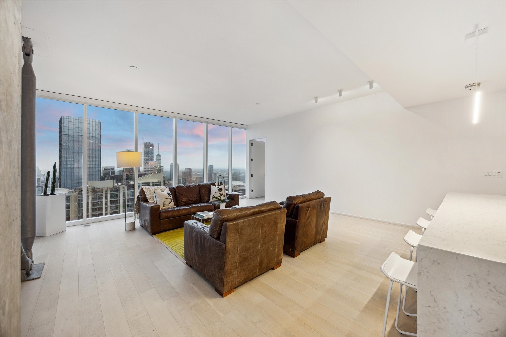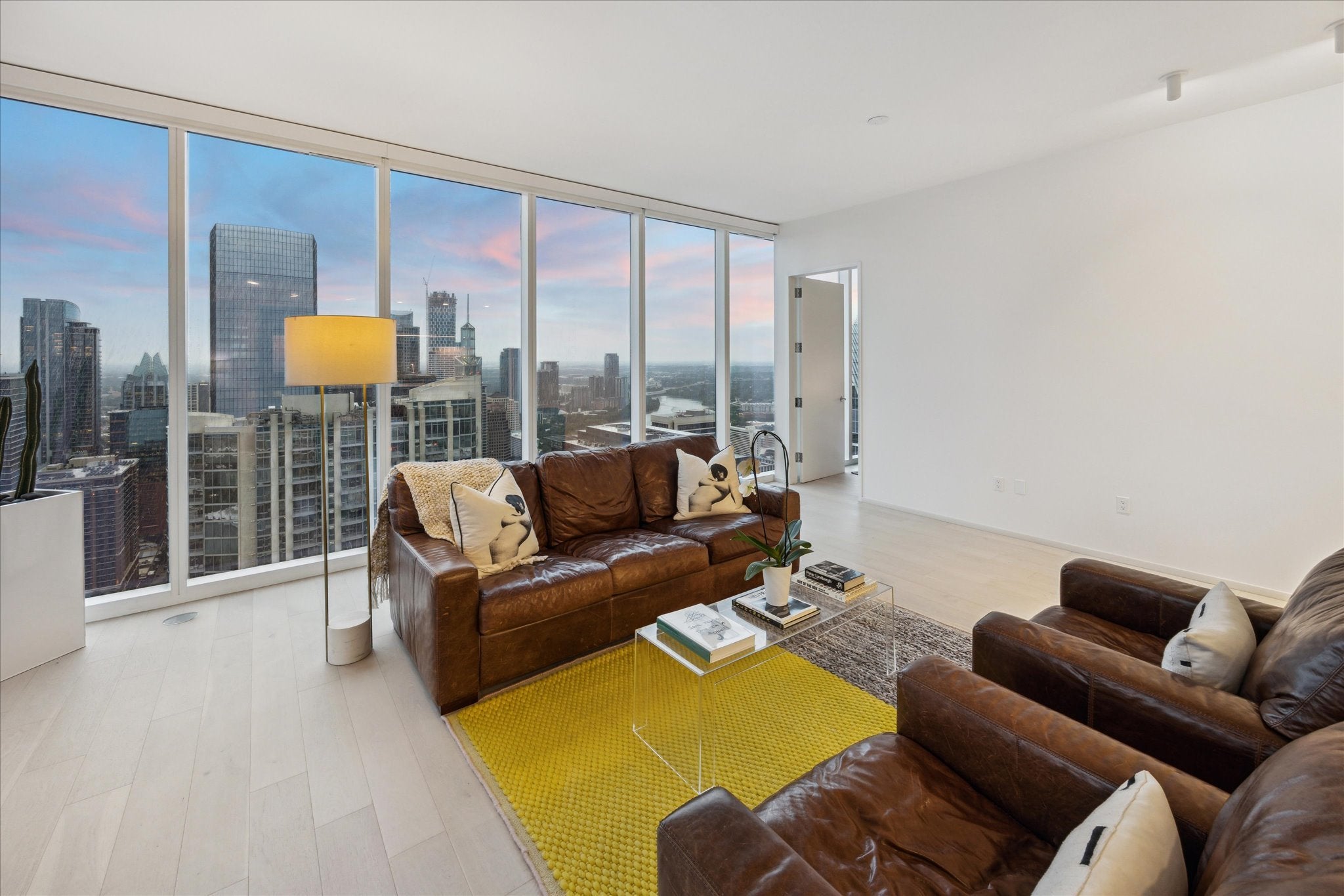 This spectacular northeast corner residence offers stunning, panoramic views of the city skyline, Lady Bird Lake, the Capitol, and the Hill Country through walls of glass that fill the space with natural light. Located in the heart of downtown Austin, this expansive 2-bedroom plus study floorplan is ideal for working from home or entertaining in style. The open-concept kitchen features premium stainless steel appliances, a Sub-Zero refrigerator and under-counter Sub-Zero wine fridge, built-in oven, gas cooktop with vent hood, and overlooks a spacious living area framed by breathtaking views. The primary suite includes a spa-like bathroom with dual vanities, a soaking tub, walk-in shower, and a custom-designed walk-in closet. Additional highlights include wide-plank white oak floors, automated solar shades, designer lighting, a private covered balcony, and two reserved parking spaces. Residents enjoy access to an impressive amenity package spanning two full floors. Plus, you're steps away from Trader Joe’s, Whole Foods, and the best of downtown dining, shopping, and entertainment.