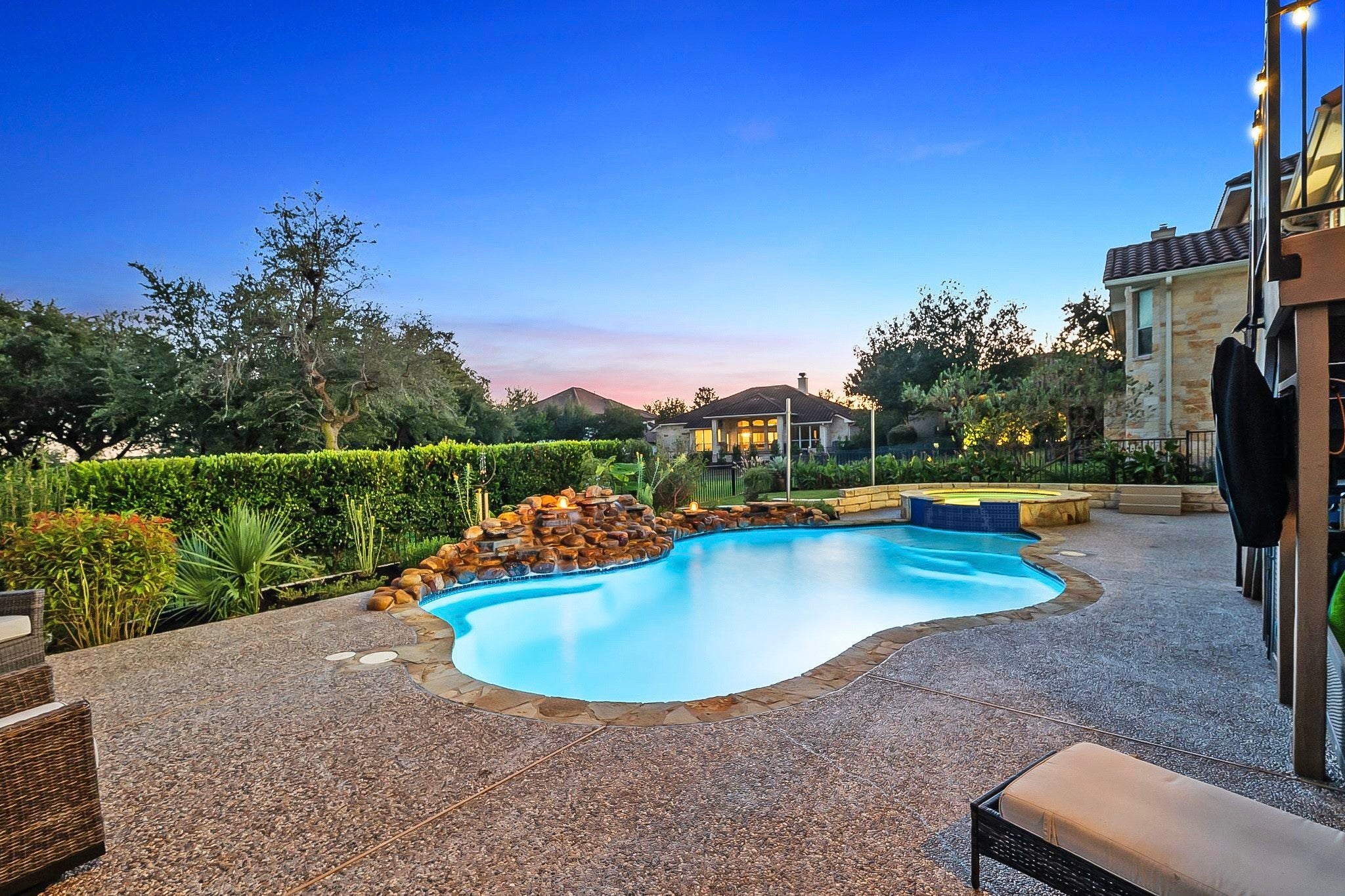 Discover elevated living in Falconhead with expansive GOLF COURSE views, a beautiful saltwater POOL and SPA, and thoughtfully designed outdoor living areas. Extensively upgraded with all new Andersen and Pella windows, high-end fans, remote-control shades, water softener and purification system, and major pool equipment improvements-this home offers true move-in-ready value in one of Lake Travis ISD’s most desirable communities. Enjoy a welcoming covered front porch overlooking mature landscaping, a spacious covered back porch with remote-control shades, and multiple poolside lounging and entertaining areas-all overlooking Falconhead’s 13th hole. Inside, natural light pours through the new windows, illuminating warm hardwood and tile floors on the main level and the newly added wood staircase leading to the second floor. The refreshed kitchen feels bright and current with white painted cabinetry, a center island, and a new dishwasher and refrigerator, all opening seamlessly to the family room. The main-level primary suite features an updated spa-style bathroom and custom closet, plus a dedicated study/home office with no carpet on the entire first floor. Upstairs you’ll find a spacious game/media room with wood floors, three secondary bedrooms (all with new carpet), and an additional office nook-ideal for homework, gaming, or a second workstation. The pool has been meticulously maintained, and the charming butterfly garden adds to the outdoor appeal. With minimal ongoing maintenance needed, this home is ideal for those who want to enjoy the Falconhead lifestyle from day one. Residents enjoy easy access to Falconhead Golf Course, two neighborhood parks, and miles of hike-and-bike trails. With quick access to both Hwy. 620 and Hwy. 71, this centrally located pocket of Lake Travis ISD is known for some of the lowest property tax rates and HOA fees in the district while still being minutes from golf, dining, shopping, and Lakeway/Bee Cave conveniences.