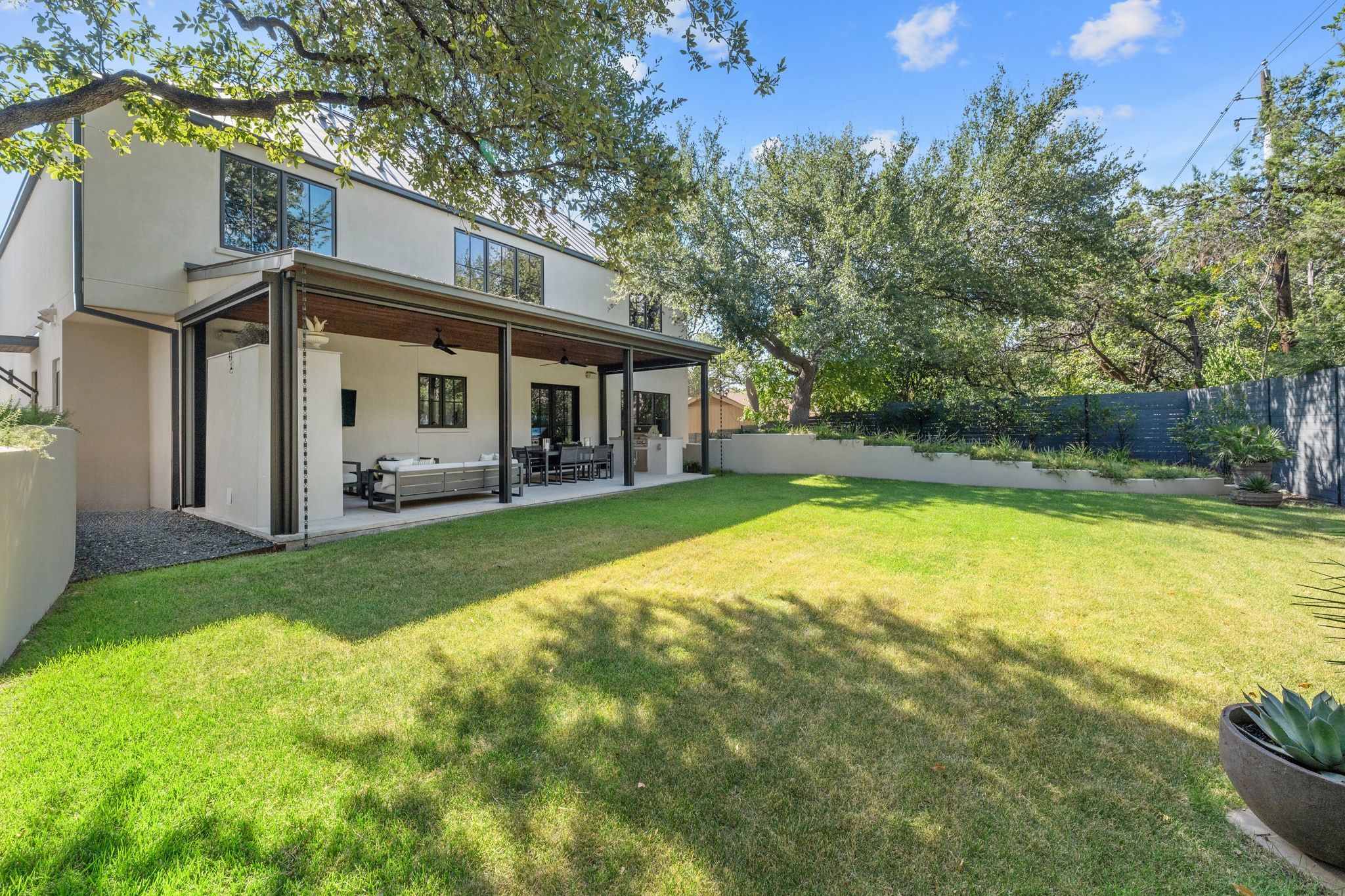 Masterfully designed and built by Paul and Maureen Christen, this modern residence is located in the heart of Westlake—within walking distance to Cedar Creek Elementary, Hill Country Middle School, and Westlake High School. The four-bedroom, four-bath layout is defined by open living spaces, elevated ceilings, and refined finishes throughout. The main level includes a flexible guest suite or office, offering privacy for visitors or dedicated space to work from home. French doors open to a wonderful outdoor kitchen and living area, featuring electric patio screens, complemented by a private, flat backyard with ample room for a future pool. Upstairs features a secondary living area, generous primary suite and two additional well-appointed bedrooms—each offering an en-suite bath and spacious walk-in closets. Located in acclaimed EANES ISD, with close proximity to downtown Austin—this turnkey home is perfect for even the most discriminating buyer.