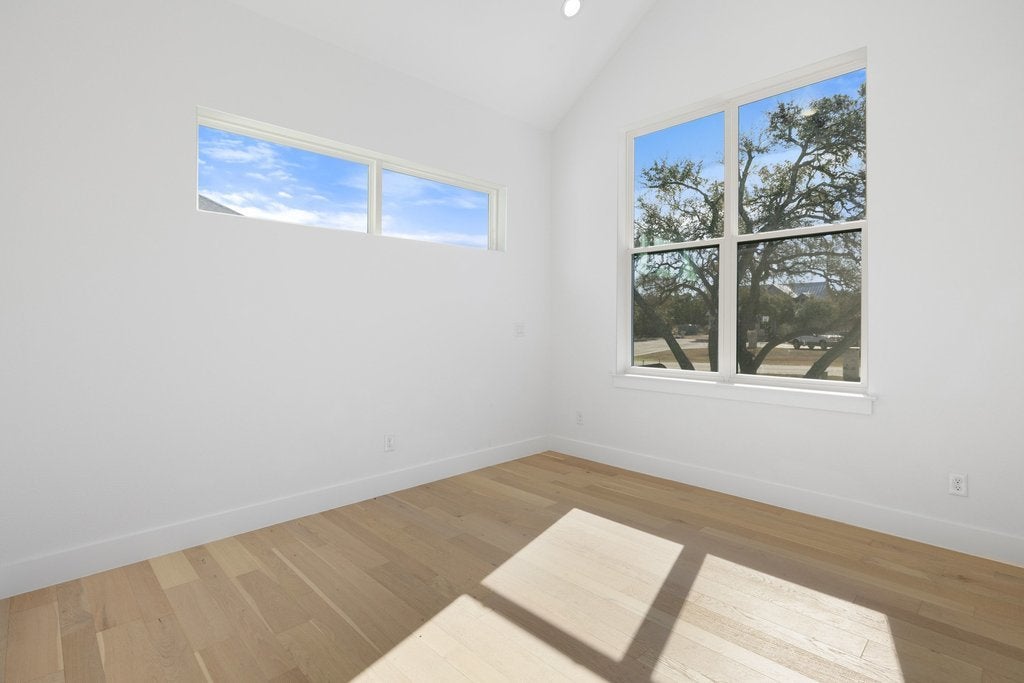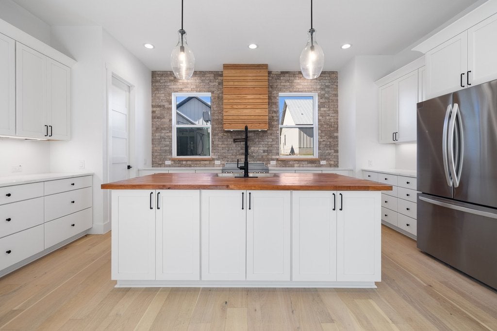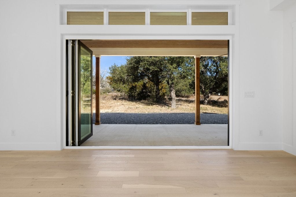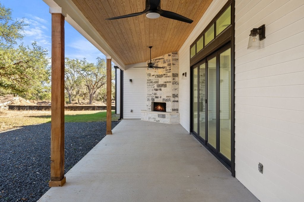 Welcome to 43 War Bonnet in Wimberley Springs — a thoughtfully constructed new build by River Hutchinson Homes, offering elevated craftsmanship, structural integrity, and refined Hill Country living. Designed by Blair Austin Studio, this 4-bedroom, 4 bathroom home with dedicated media room spans approximately 2,822 square feet of conditioned space with an additional covered rear porch and garage, creating over 3,700 square feet under roof with both functionality and architectural presence in mind. The seamless flow from the main living area to the covered back porch with an accordion folding door, creates effortless indoor-outdoor living ideal for entertaining. Built with 2x6 exterior framing and spray foam insulation at exterior walls and roof deck, the home prioritizes energy efficiency and long-term performance. A durable black metal roof, custom craftsman mahogany front door, and steel structural columns add both strength and architectural distinction. Interior finishes reflect quality and durability, including hardwood flooring throughout, custom cabinetry, quartz countertops in kitchen and baths, and a substantial butcher block island designed for gathering. The appliance package includes a ZLINE range, built-in microwave, dishwasher, stainless steel fridge and designer plumbing fixtures. Bathrooms feature frameless glass enclosures and thoughtfully selected tile work. Additional highlights include a Majestic 42” wood-burning outdoor fireplace, insulated garage, sound-insulated interior walls at key locations, and a layout designed for privacy and everyday livability. A rare opportunity to own a design-forward, high-performance home in one of Wimberley’s most sought-after communities.