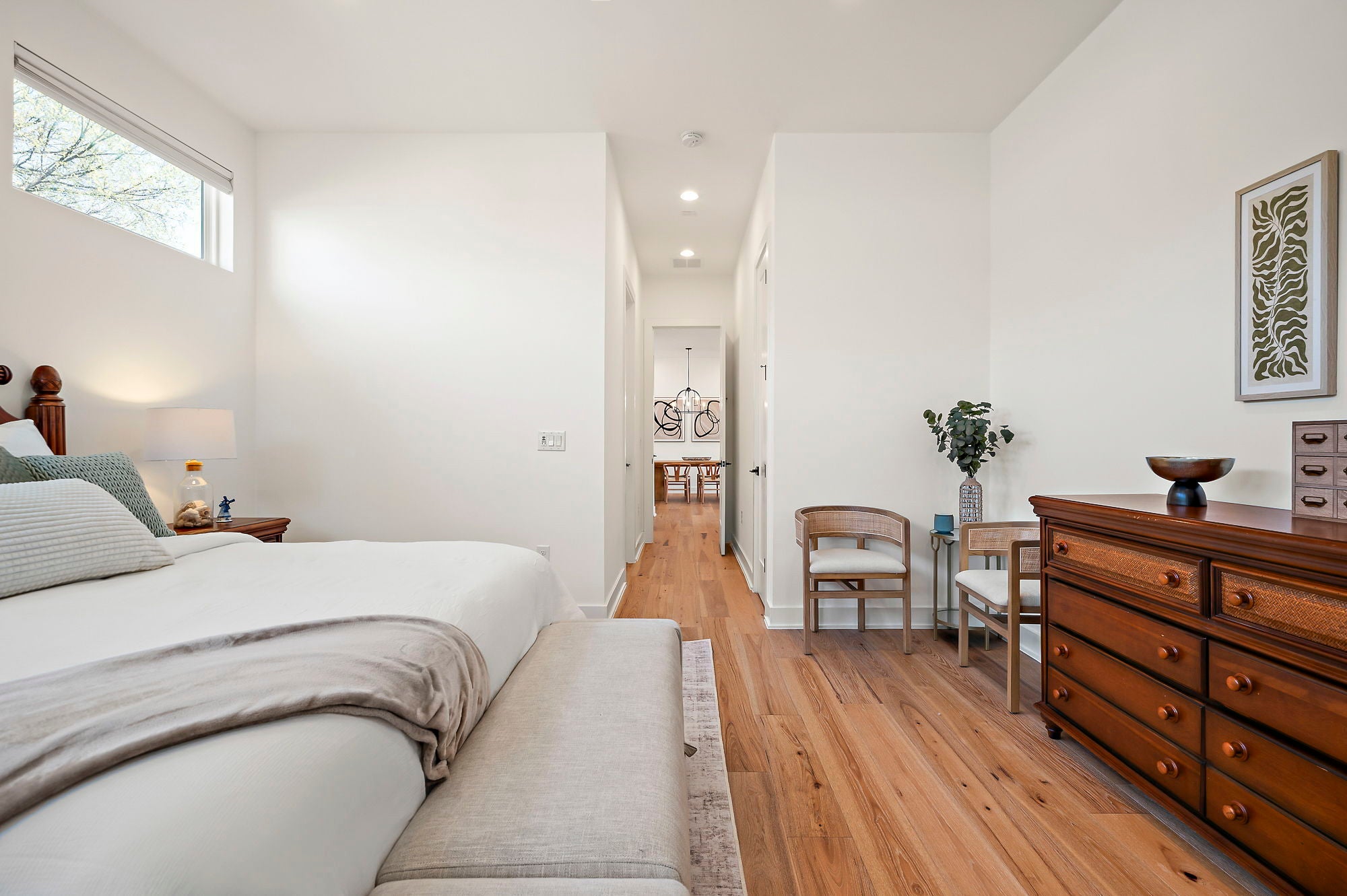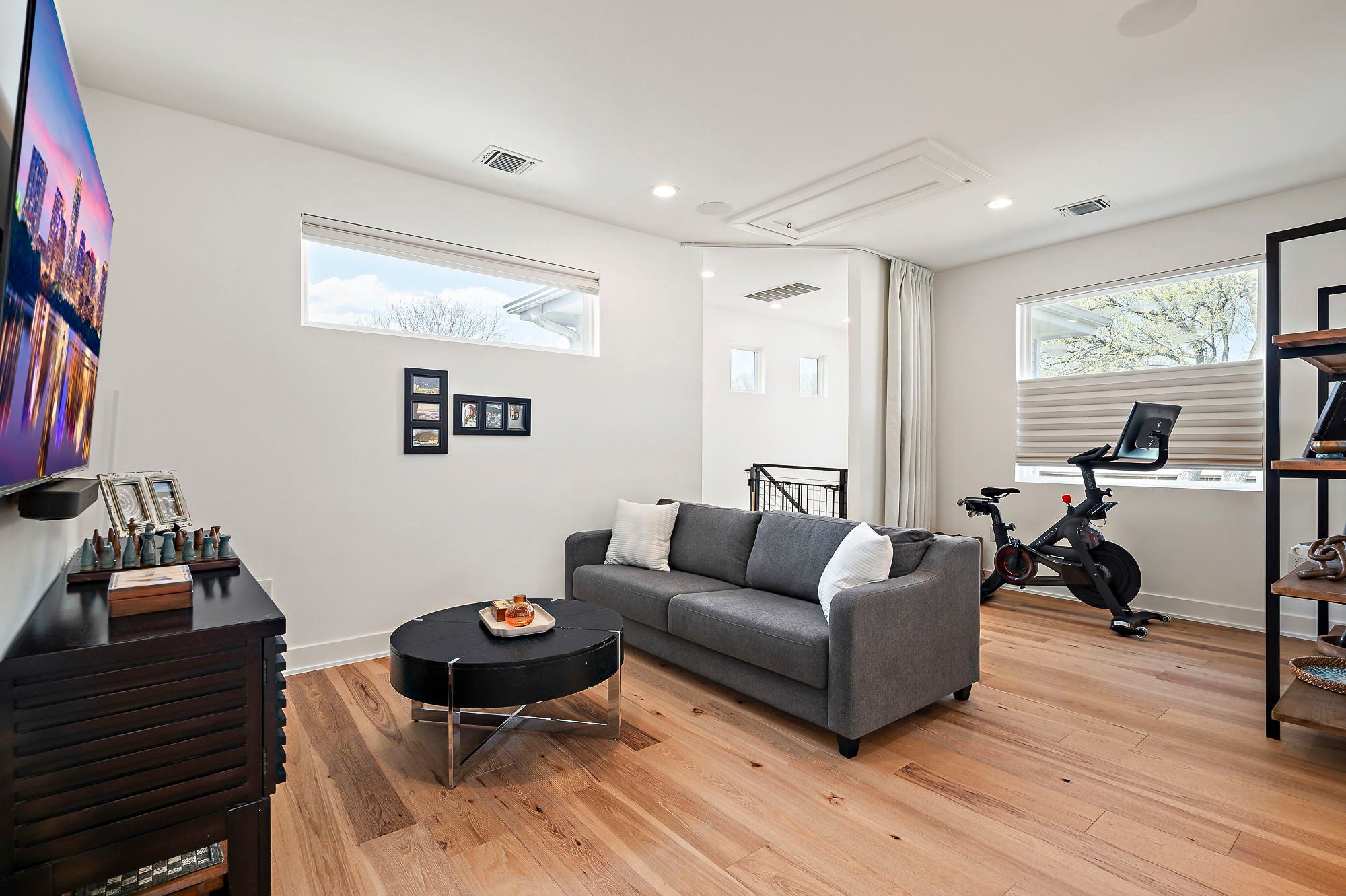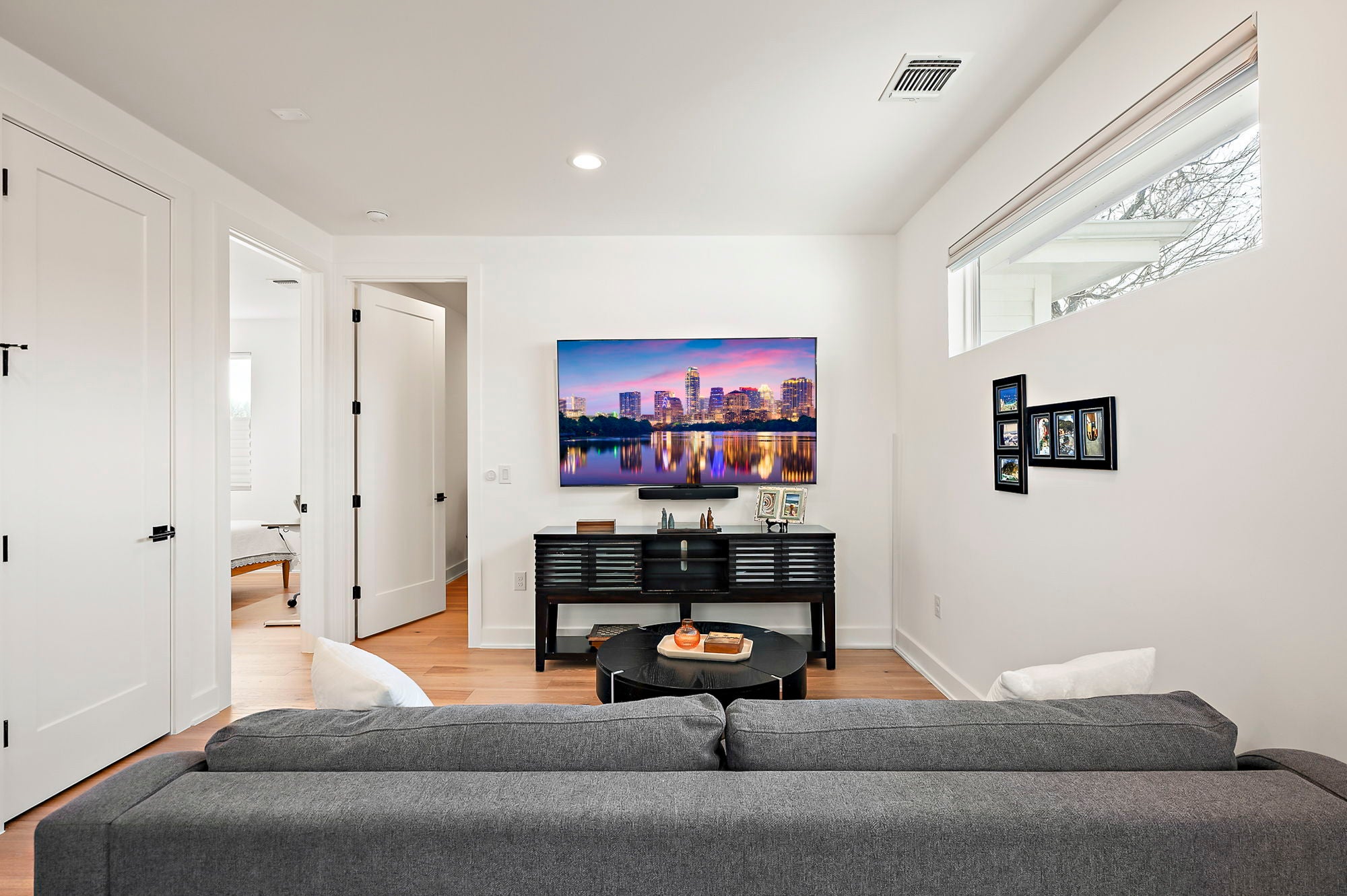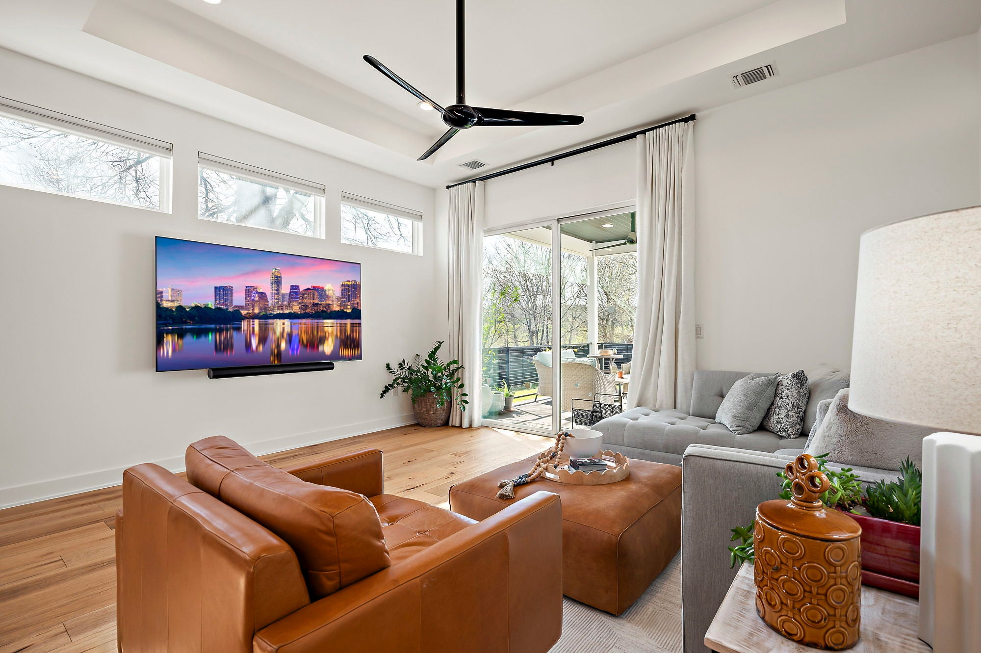 Built by Paradisa, this newer-construction 4-bedroom home with a loft and 3 full bathrooms blends modern design with everyday livability. Natural light moves easily across wood and tile floors, drawing you into the open living space where a tray ceiling and expansive sliding glass doors create a seamless connection to the outdoors. The layout feels deliberate — open where you want connection, defined where you want privacy. The kitchen anchors the home with a substantial quartz island, shaker cabinetry, and stainless appliances — equally suited for weeknight dinners or a house full of guests. The primary suite is privately positioned on the main level and offers a generous walk-in closet and a spa-like bath with dual vanities and a rainfall shower. A second bedroom and full bath downstairs provide flexibility for guests or a dedicated office. Upstairs, a versatile second living area (loft) connects two additional bedrooms and a full bath — ideal for media, work, or play. Technology is integrated without being intrusive: Hunter Douglas automated blinds, Sonos audio, and security cameras offer convenience at the touch of a button. Out back, a covered patio overlooks a fenced yard that partially backs to the Little Walnut Creek greenbelt — a rare combination of privacy and open views. Easy access to 183, just a few minutes to Mueller, and approximately six miles to downtown Austin, this home offers modern comfort with access to everything.