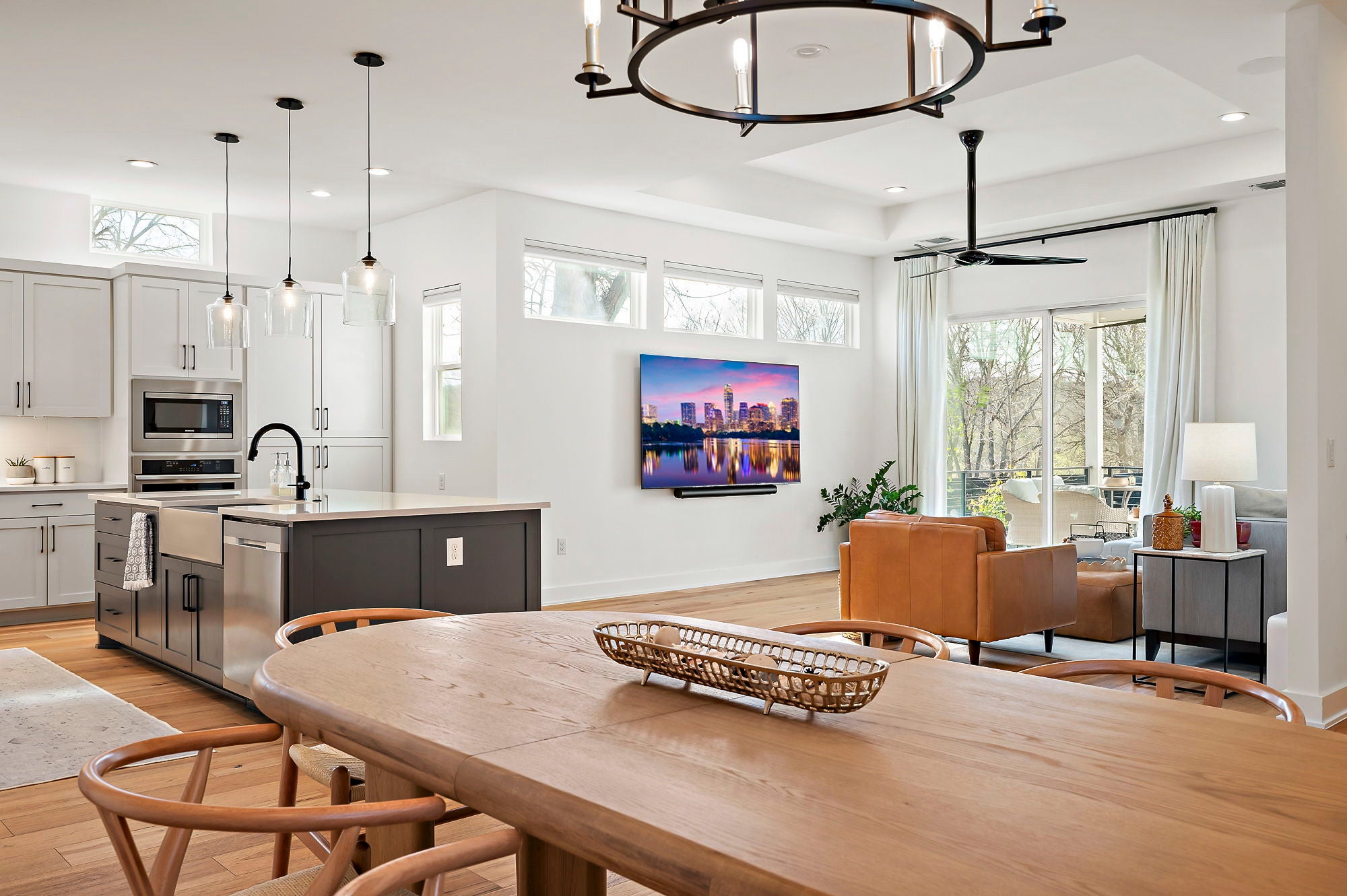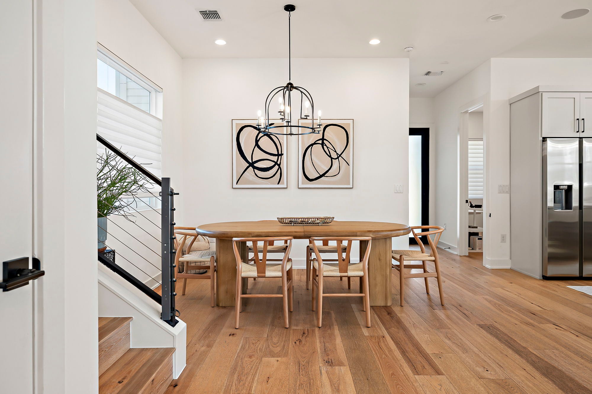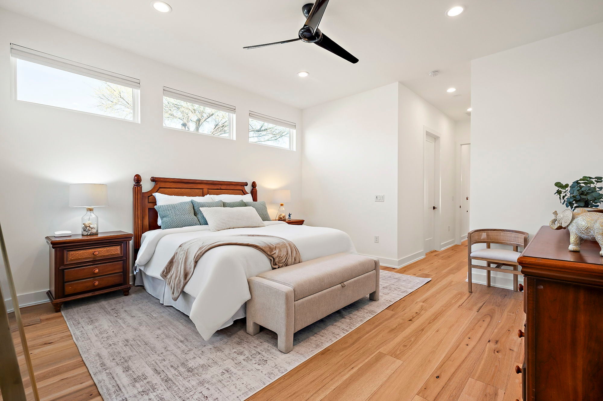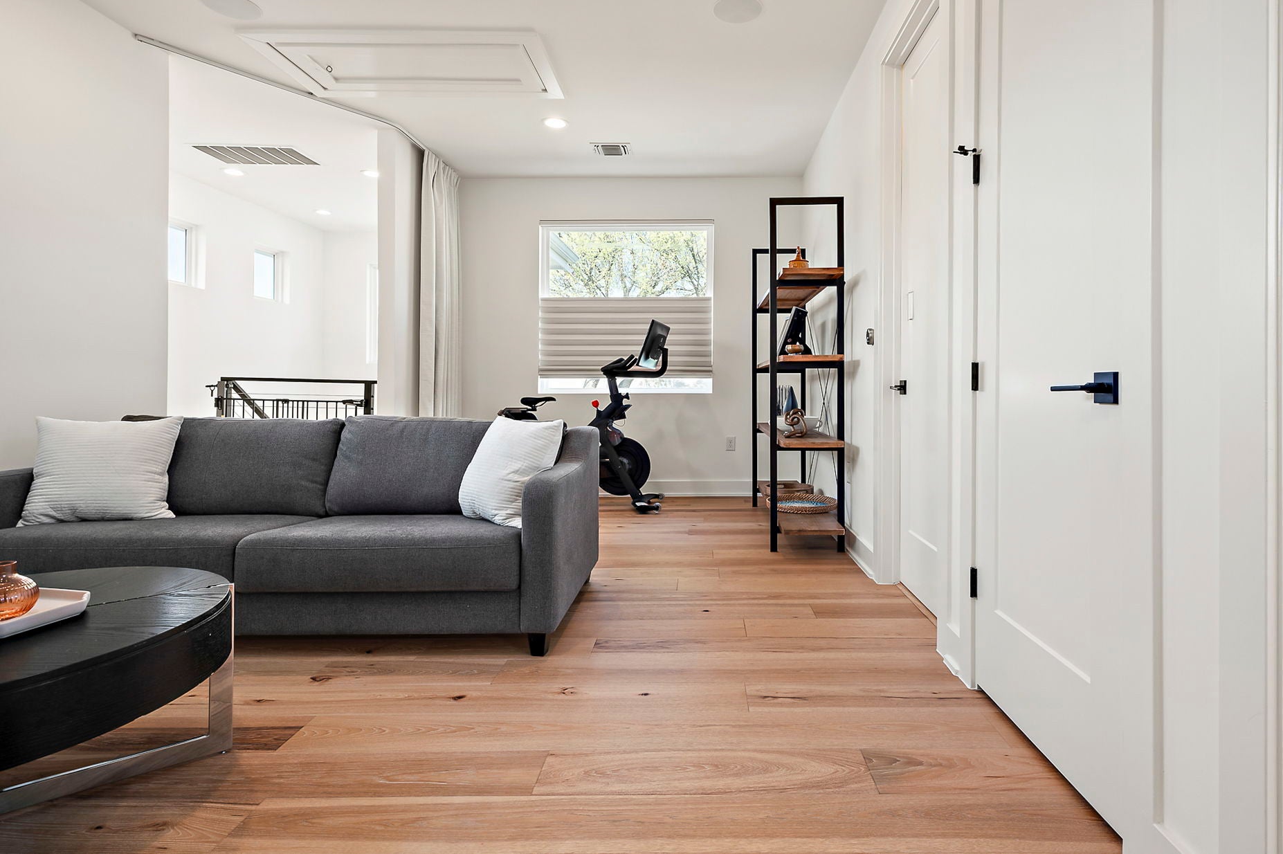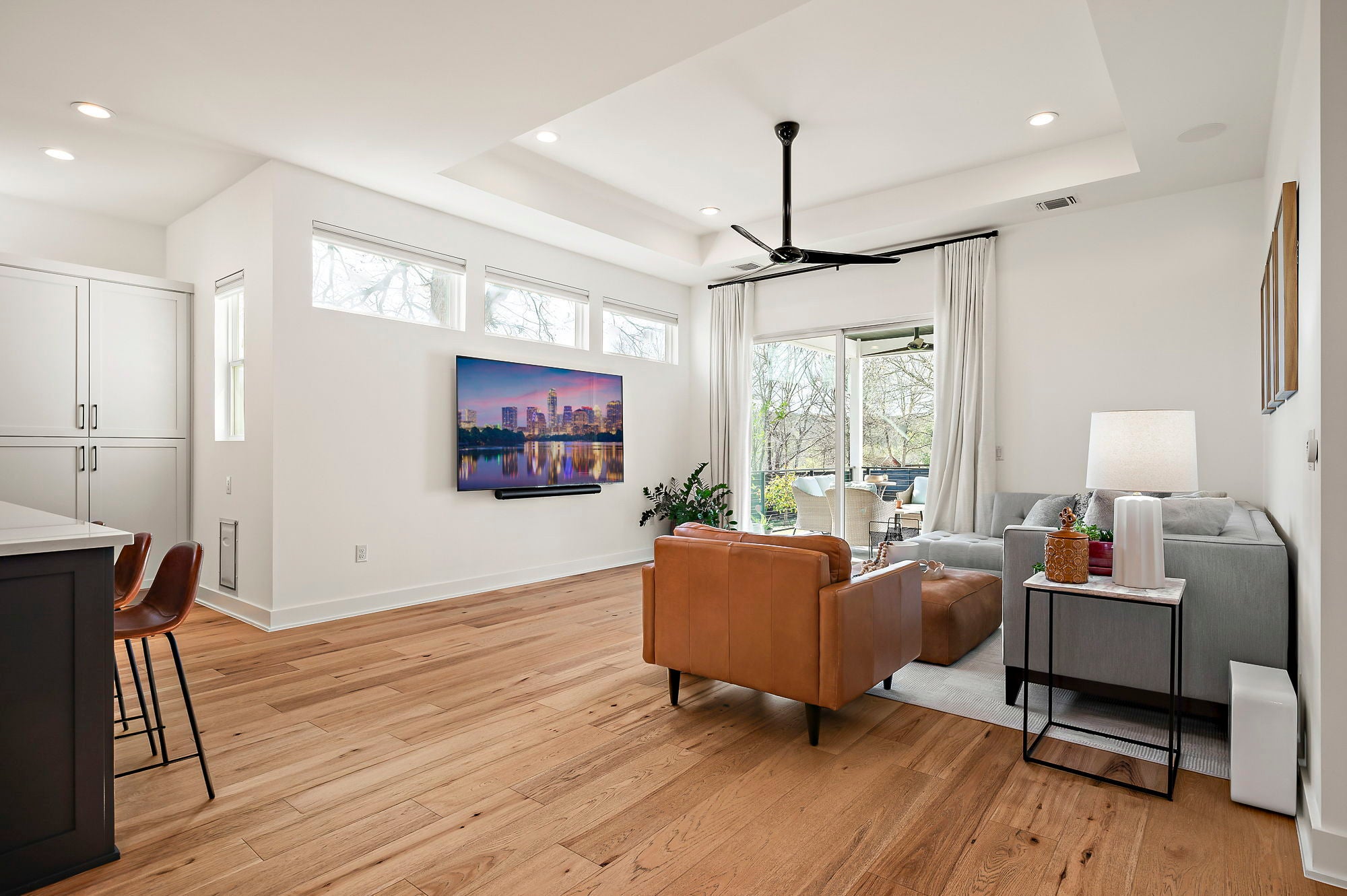 Built by Paradisa, this newer-construction 4-bedroom home with a loft and 3 full bathrooms blends modern design with everyday livability. Natural light moves easily across wood and tile floors, drawing you into the open living space where a tray ceiling and expansive sliding glass doors create a seamless connection to the outdoors. The layout feels deliberate — open where you want connection, defined where you want privacy. The kitchen anchors the home with a substantial quartz island, shaker cabinetry, and stainless appliances — equally suited for weeknight dinners or a house full of guests. The primary suite is privately positioned on the main level and offers a generous walk-in closet and a spa-like bath with dual vanities and a rainfall shower. A second bedroom and full bath downstairs provide flexibility for guests or a dedicated office. Upstairs, a versatile second living area (loft) connects two additional bedrooms and a full bath — ideal for media, work, or play. Technology is integrated without being intrusive: Hunter Douglas automated blinds, Sonos audio, and security cameras offer convenience at the touch of a button. Out back, a covered patio overlooks a fenced yard that partially backs to the Little Walnut Creek greenbelt — a rare combination of privacy and open views. Easy access to 183, just a few minutes to Mueller, and approximately six miles to downtown Austin, this home offers modern comfort with access to everything.