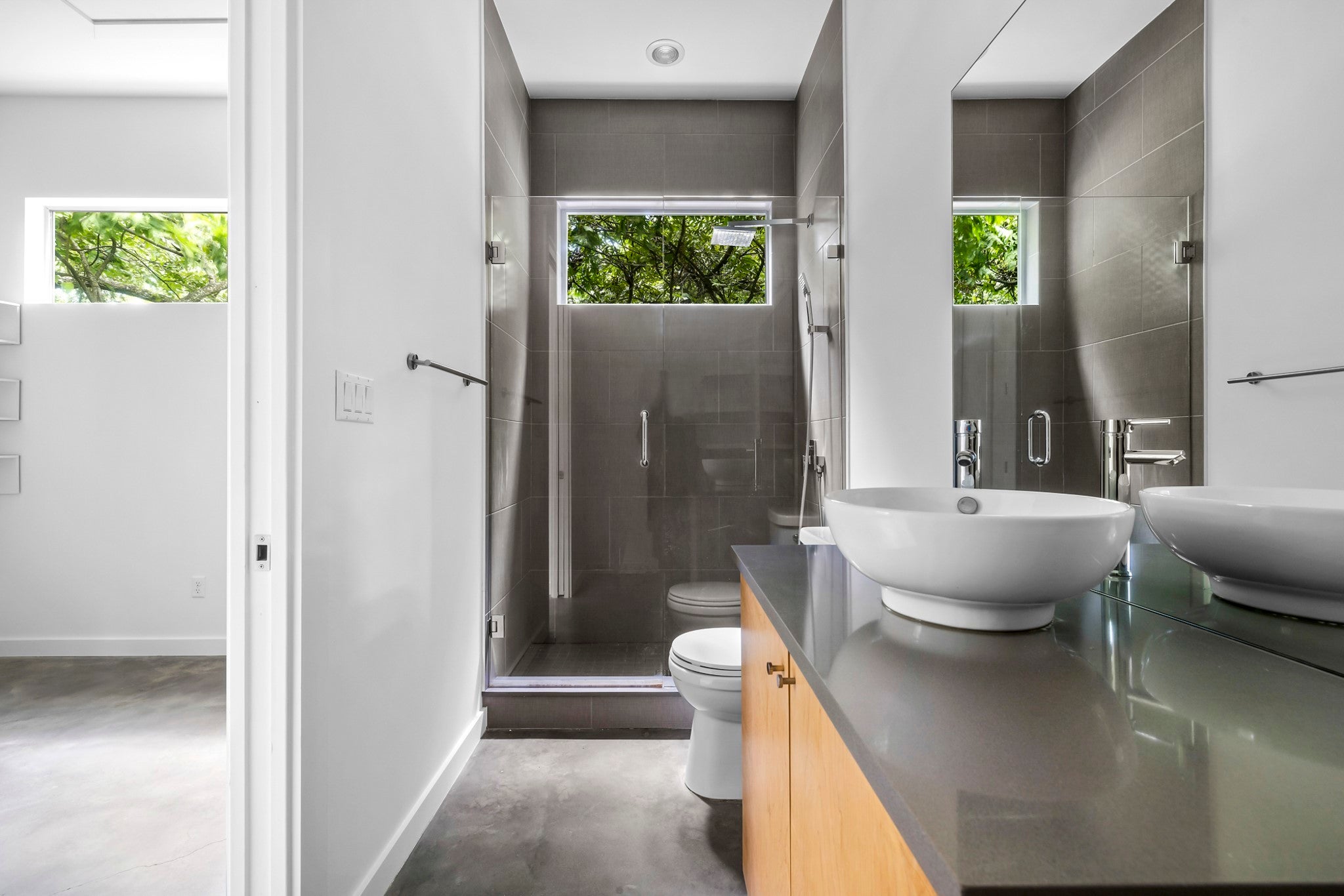 Discover a modern-style duplex designed by renowned architect Steve Zagorski, located in the heart of the highly sought-after Bouldin neighborhood in Austin, Texas. This freshly painted and spruced-up residence at 1302 South 5th Street, Unit A, Austin, TX 78704, epitomizes sophisticated urban living. The beautiful interior showcases a meticulous finish with hardwood and concrete floors, providing a sleek and contemporary ambiance. Large windows flood the space with natural light, creating a warm and inviting atmosphere throughout. The stylish kitchen is a culinary delight, featuring Kitchen-Aid stainless steel appliances, custom cabinetry, silestone countertops, and elegant European fixtures. The duplex boasts three spacious bedrooms, each with its own ensuite bath, ensuring privacy and comfort for all residents. The treetop upstairs master suite is a serene retreat with an attached bath and a spacious walk-in closet. Enjoy the private, shaded yard accessed via a side deck, perfect for relaxing or entertaining guests. Additionally, Unit B is also available for sale, offering a partial city view. Don't miss this unique opportunity to own a stunning home in one of Austin's most vibrant neighborhoods.