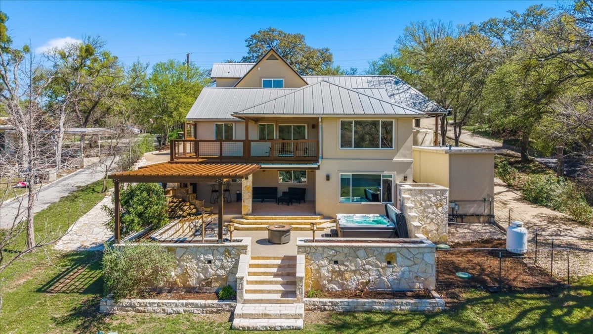 Welcome to your private Pedernales River retreat, a completely remodeled 5-bedroom, 5-bathroom luxury home offering 3,634 sq ft of impeccable living, breathtaking river views, and stunning Texas sunsets every single evening. Built in 2001 and fully reimagined to like-new condition, this property features rolling drivable waterfront access, sells completely furnished, and is truly turn-key and ready from day one. What truly sets this home apart is the self-contained guest suite featuring its own kitchenette and two large beds, perfect for generating rental income, hosting extended family, or capitalizing on short-term rental opportunities. With few deed restrictions, a low tax rate, and excellent VRBO potential, this home is as smart an investment as it is a dream residence. No detail was overlooked in this masterful renovation. Enjoy travertine floors, Venetian plaster walls, Arcusstone surfaces inside and out, granite countertops, solid wood built-in cabinetry, vaulted ceilings, a wet bar, and a dedicated entertainment room. The primary suite features a spacious walk-in closet and a soaking jetted tub, while a superior 24-gauge standing seam metal roof, exceptional insulation, and quality construction throughout ensure lasting comfort and peace of mind for decades to come. Outdoors, a gentle grassy slope leads to the Pedernales River with a private boat dock, expansive stone patios, a pergola, jacuzzi, fire pit, and a full outdoor game and grilling area with ceiling fans, all framed by mature native Texas trees and lush native landscaping. A beautifully finished garage with interior entrance, circle driveway with stone pavers, stone planter boxes, and ample additional parking complete this extraordinary package. Private, quiet, and unlike anything else on the market. Conveys: furniture, accessories, dock, boat, and hot tub. Rare riverfront luxury at an exceptional value.