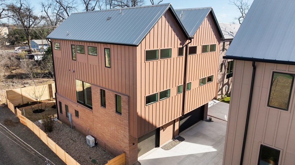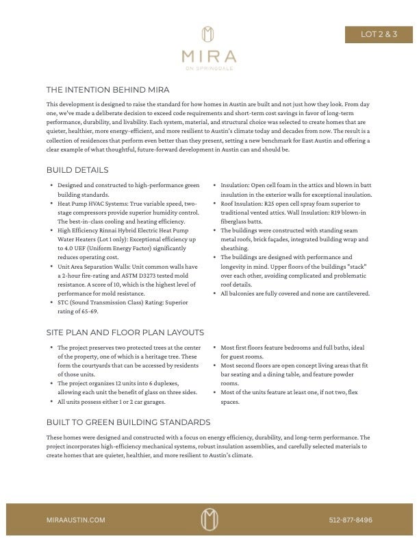 $100,000 in flex cash. 4.99% rate buydown available. Introducing Mira – a curated collection of twelve thoughtfully designed luxury townhomes in the heart of East Austin. With clean architecture, brick-accented facades, standing-seam metal roofs, & tasteful interiors, Mira offers modern living scaled to feel personal. Each three-story home is thoughtfully composed with flexible layouts, abundant natural light, & premium finishes throughout. This home features 3 bedrooms, 3.5 baths, 1 flex/office space, a private 1-car garage, & 9ft ceilings throughout. The first level includes a guest suite with full bath & covered entry porch. The second level offers open-concept living, dining, & kitchen areas, plus a powder bath & flex space that is great for an office or a kids' playroom. The third floor includes a generous primary suite with his & hers closet, double vanity sink, and soaking tub, an additional guest bedroom, full bath, and in-unit laundry. Interior highlights include LG STUDIO appliances, premium quartz countertops, Delta fixtures, luxury wood flooring, Daltile tile, West Elm pendants, Hunter ceiling fans, designer cabinetry, and artisan tile flooring. Most homes include private yards, under-stair storage, and smart home features. Ideally located in the Springdale corridor just minutes from both downtown & Austin-Bergstrom International Airport, Mira puts you amid vibrant murals, indie galleries, & live music—plus a serious culinary lineup of beloved eateries, coffee shops, & breweries. If you appreciate thoughtful architecture, flexible layouts, & walkability to everything that makes this neighborhood special, you’re in the right place. With only 10 residences available, this is a rare opportunity to own a new construction home in one of the city’s most vibrant neighborhoods. HOA fee estimated, subject to change.