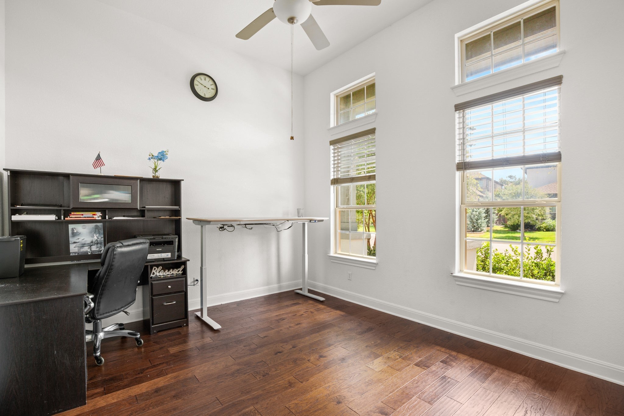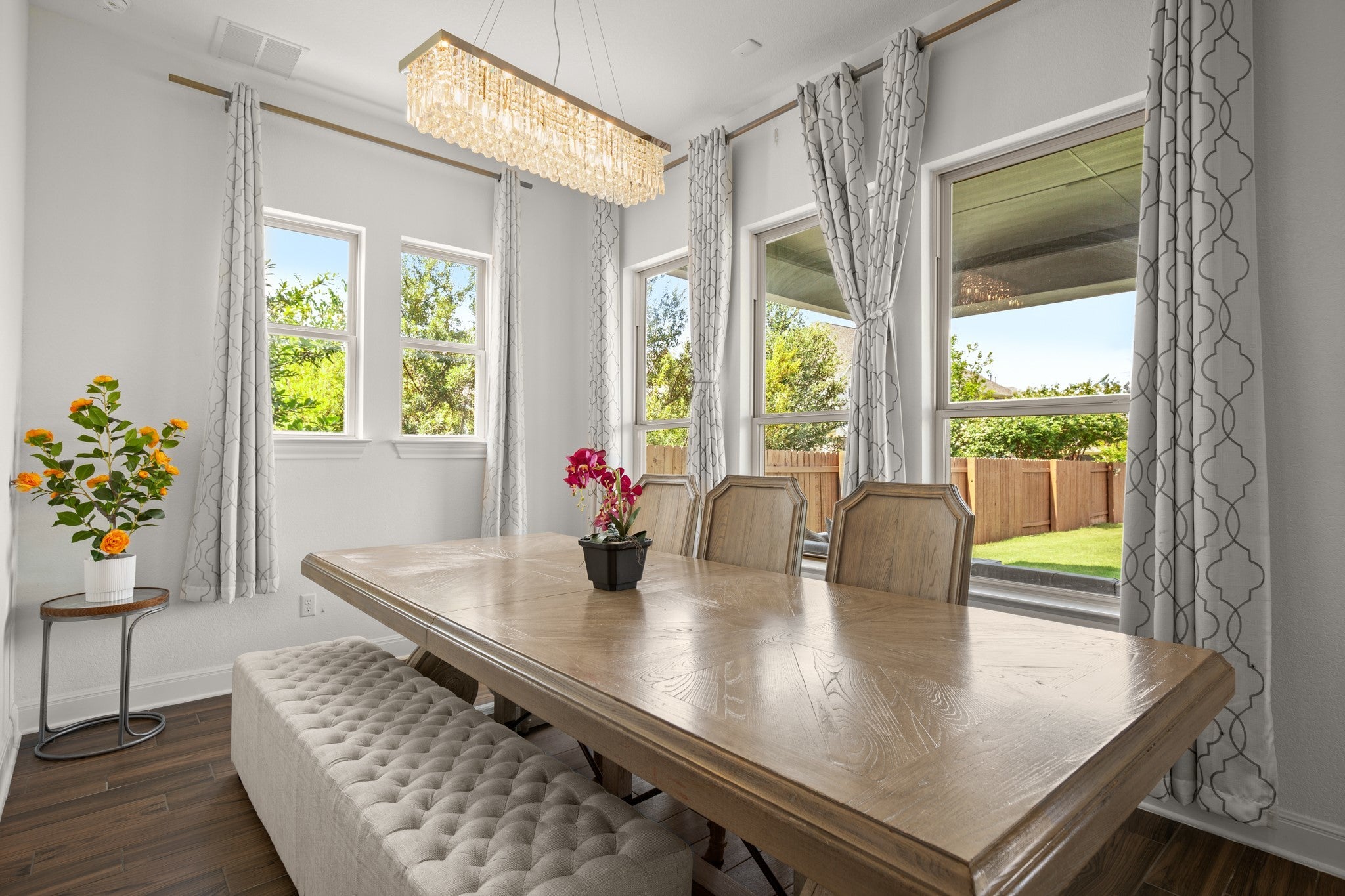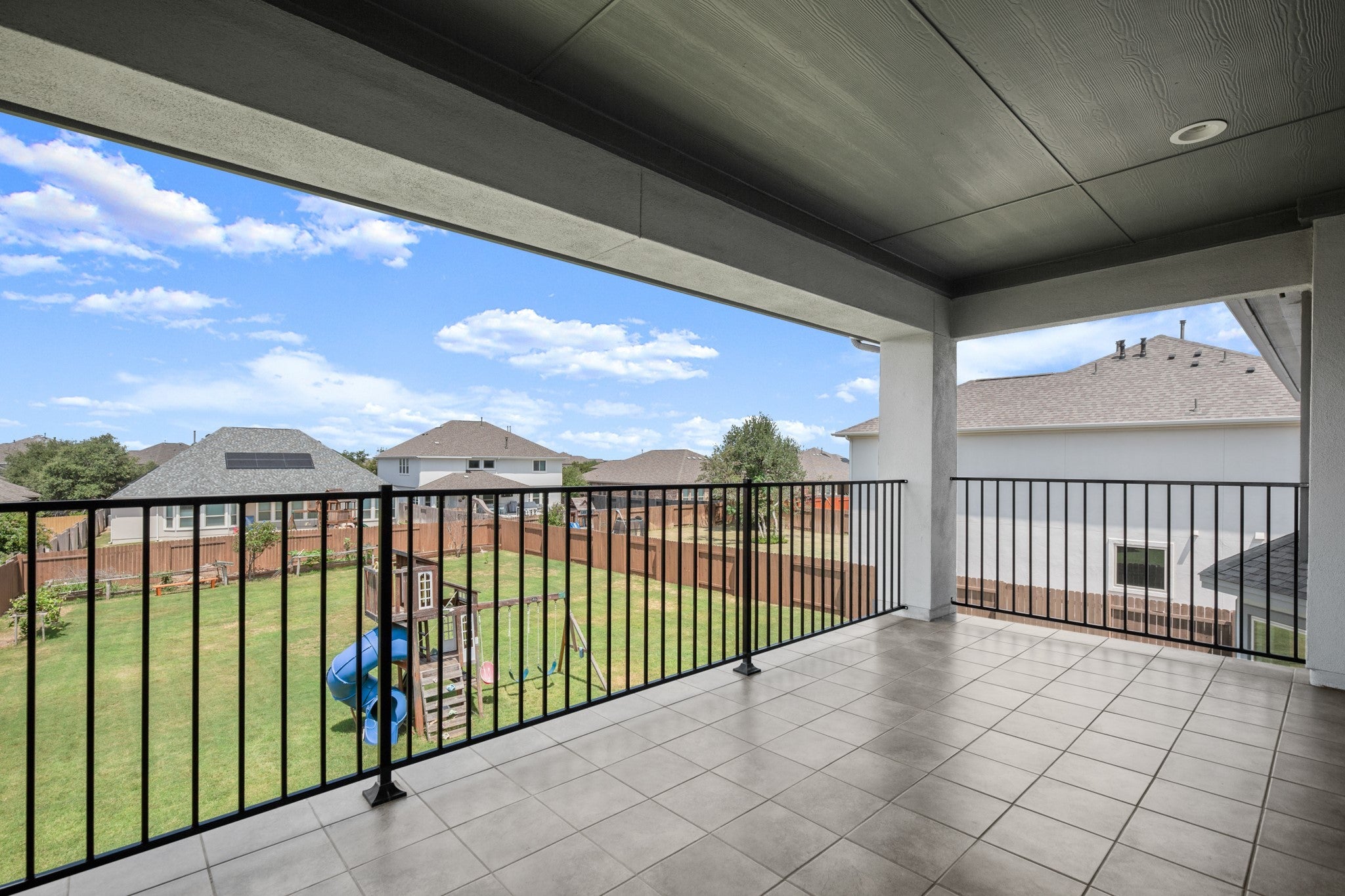 The Bluffs at Crystal Falls – Where Luxury Meets Lifestyle. Tucked away on a quiet cul-de-sac in the sought-after Bluffs at Crystal Falls, this beautifully designed 5-bedroom, 4.5-bath home blends modern elegance with everyday comfort. Set on a spacious 0.3-acre lot, the backyard offers a blank canvas ready for your dream outdoor retreat. The entry foyer is framed by a private home office with French doors and an elegant formal dining room, leading to a dramatic rotunda with a grand staircase rising to the second floor. At the heart of the home, a stunning two-story great room features soaring ceilings, stacked windows that flood the space with natural light, and a cozy corner fireplace. The open layout flows seamlessly into the gourmet island kitchen, complete with timeless cabinetry, Omega Stone quartz countertops, built-in stainless steel appliances, cafe counter seating, a pantry, and a generous dining area overlooking the backyard. The main floor includes a secluded primary suite and a guest bedroom, both with ensuite baths - ideal for guests or multi-generational living, plus a convenient half bath. Upstairs offers three additional bedrooms, two full baths, a spacious game room, and a fully equipped media room with screen and projector that convey. An upgraded upstairs balcony adds even more value and charm. Energy-efficient solar panels provide immediate cost savings, while additional upgrades include a whole-home water filtration system, under-sink RO system, and automatic irrigation with rain sensor and wireless monitoring. Top rated Leander ISD schools for educational excellence. Residents enjoy Crystal Falls’ exceptional amenities, including two resort-style pools, tennis courts, an 18-hole disc golf course, fishing pond, scenic trails, and more - all with easy access to major roadways, dining, shopping, and entertainment. This isn’t just a home - it’s a lifestyle. Schedule your showing today!