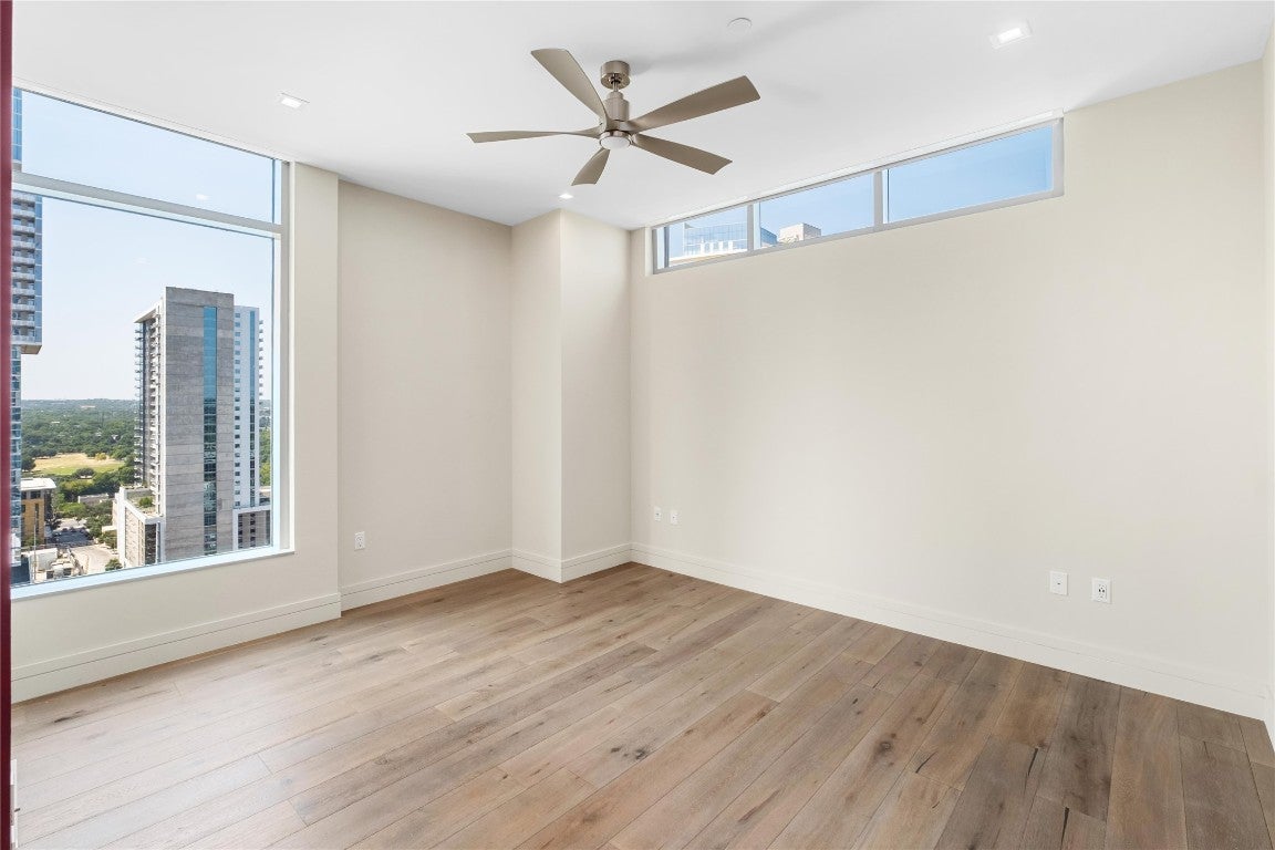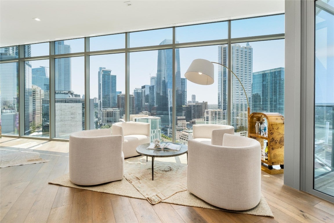 Coveted C1 floor plan at the prestigious Fifth & West—offering exceptional scale, privacy, and design pedigree at the best value per foot in the tower. This 3-bedroom + study, 3-bath residence showcases sweeping southeast-facing views of the Austin skyline and Lady Bird Lake through floor-to-ceiling, UV-filtering windows. Designed for both entertaining and everyday living, it features two private terraces, a chef’s kitchen with a 10-ft quartz waterfall island, custom Italian cabinetry, Miele appliances, and a walk-in pantry. The dedicated study and sunlit primary suite include dual walk-in closets and a spa-inspired bath. Wide-plank white oak floors, motorized shades, Hansgrohe and Kohler fixtures, and keyless smart-home technology enhance the refined interior. Includes full-size laundry room, two premium parking spaces, and private storage. Fifth & West residents enjoy resort-style amenities including 24-hour concierge, pool, yoga and fitness studio, guest suites, pet park, and conference room. Designed by an award-winning team, this residence delivers the best of downtown living—panoramic views, thoughtful design, and timeless sophistication.