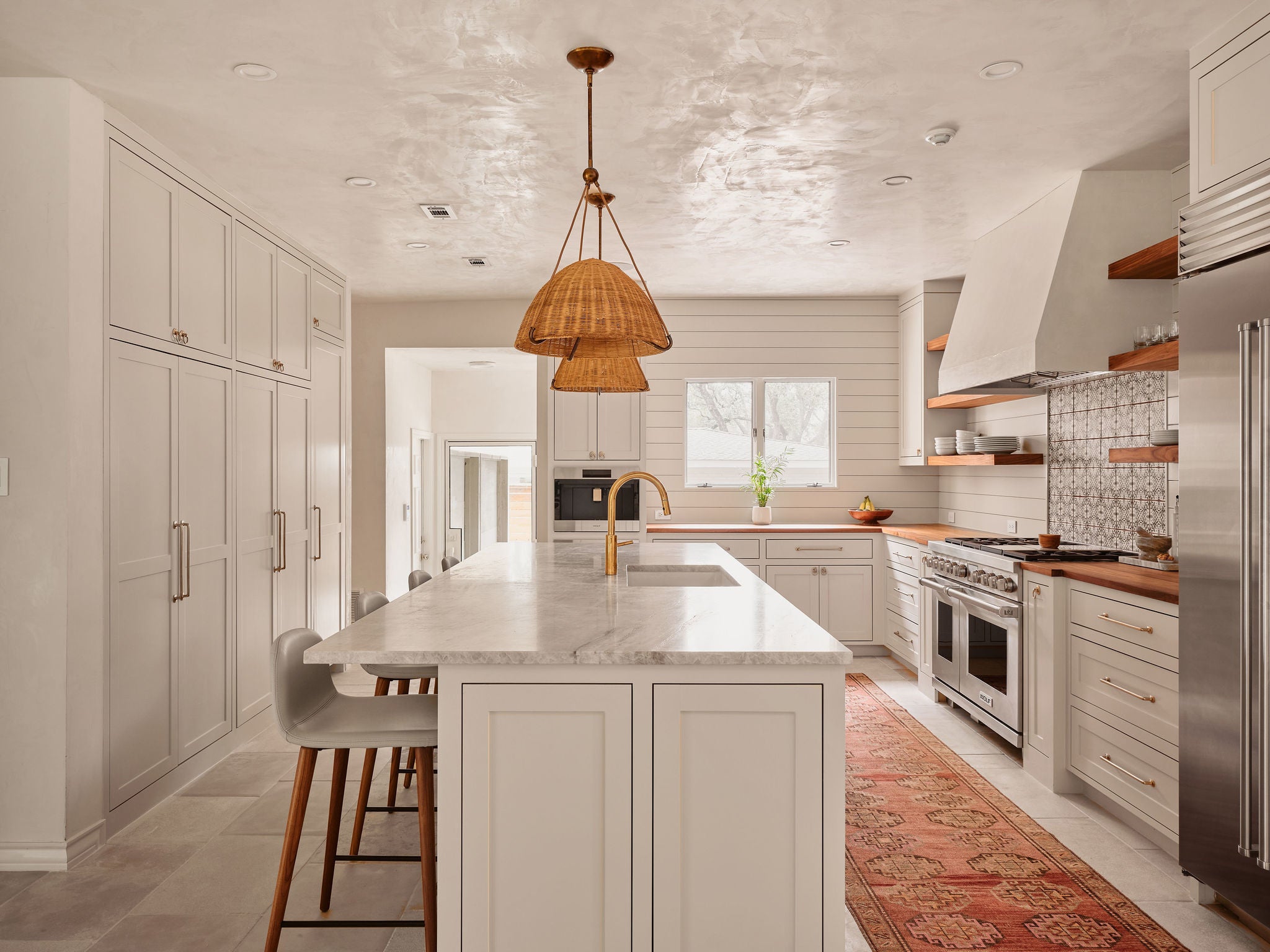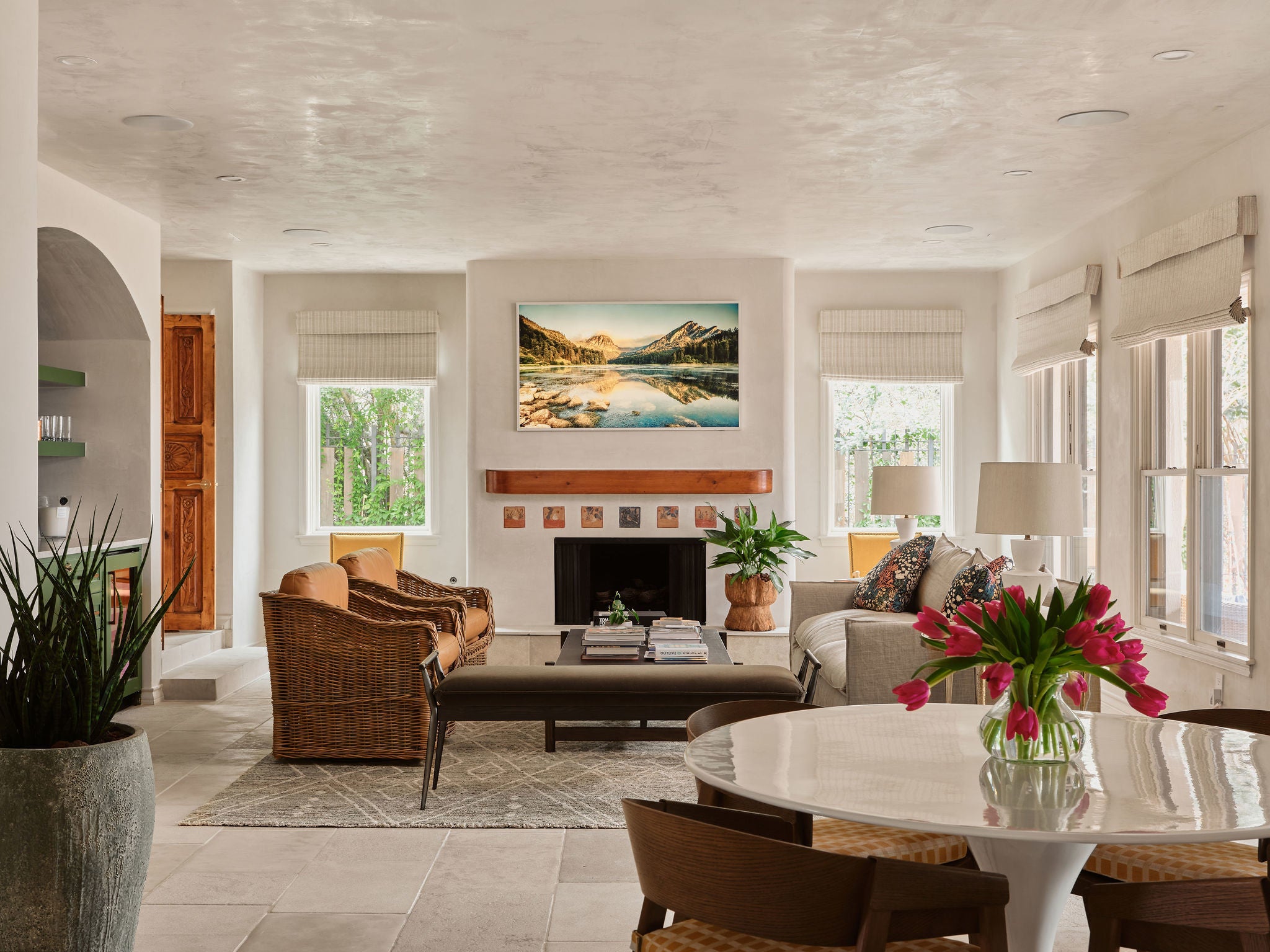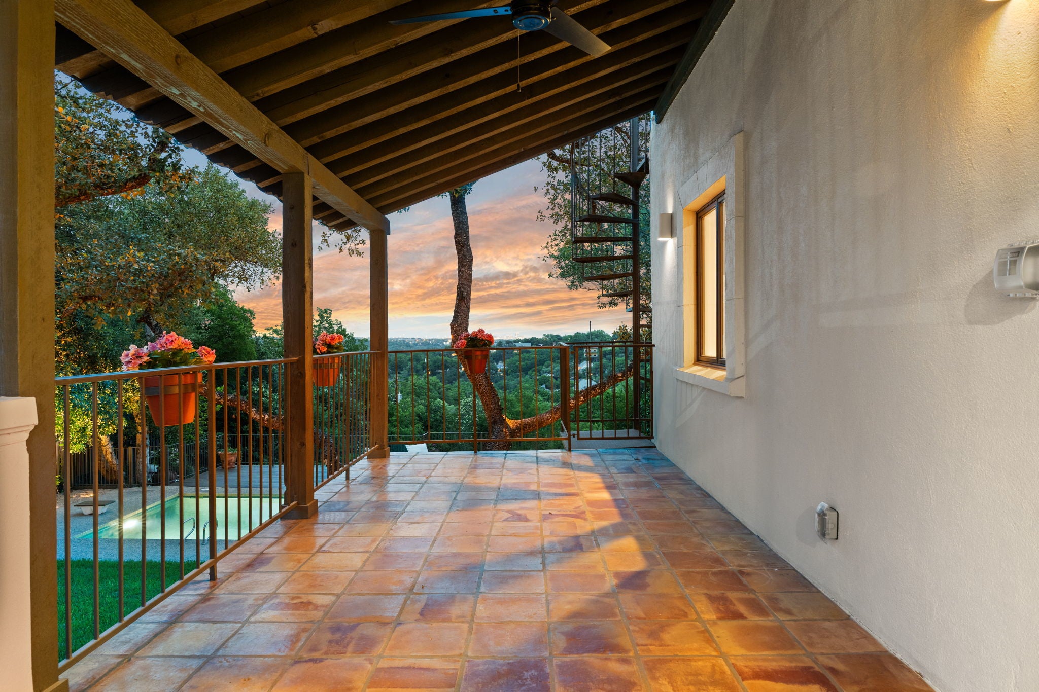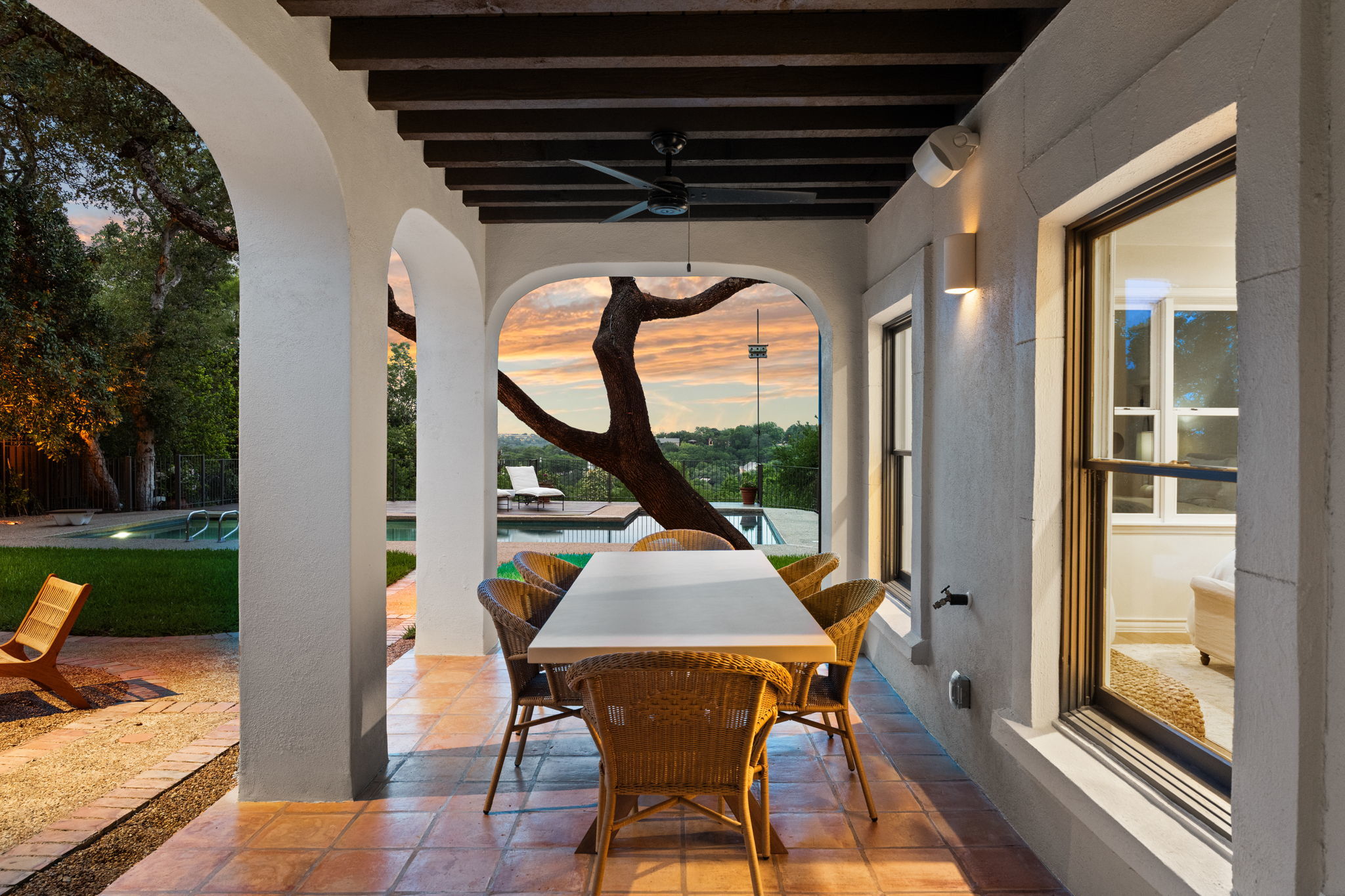 Tranquil living awaits in this meticulously renovated four-bedroom, three-and-a-half-bathroom home featuring significant architecture, designer interior finishes, hill country views, and over a half-acre of landscaped, poolside outdoor space in Austin’s desirable Highland Park neighborhood. Towering trees, custom striped awnings and an arched entry welcomes you into this sanctuary filled with thoughtful details. Handsome plaster walls, hand-carved interior doors, and Moroccan limestone flooring effortlessly work together exuding a warm and inviting palate. Whether entertaining larger gatherings or more intimate settings, the layout works perfectly. Upon entering the foyer, navigate to the formal dining room, the book lined study/library, or the expansive great room. Rich walnut countertops, woven rattan pendants, open shelving and a gathering center island define the kitchen, which seamlessly flows to the family room with a sitting fireplace and bar center complete with hand cut tiles. Head outdoors where arched openings, beamed ceilings and patinaed Saltillo tile open to the private back yard showcasing the views. A must see is your own nature trail down to the ravine at the back of the property. The home’s accommodations begin with the relaxing main-floor owner’s suite overlooking the verandas and private setting. On the upper level, you’ll find three additional secondary bedrooms, two bathrooms and two separate retreats. Enjoy either the impressive barrel-vaulted living space or head out to the expansive balcony to take in the views. A truly special property offering privacy, location and an unparalleled renovation.