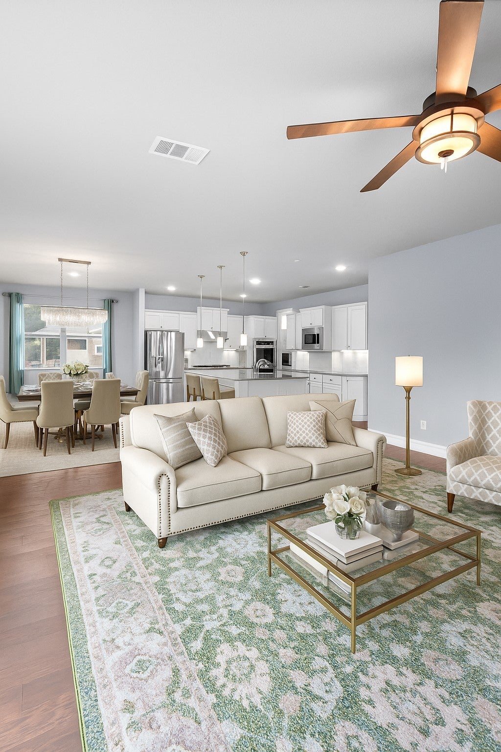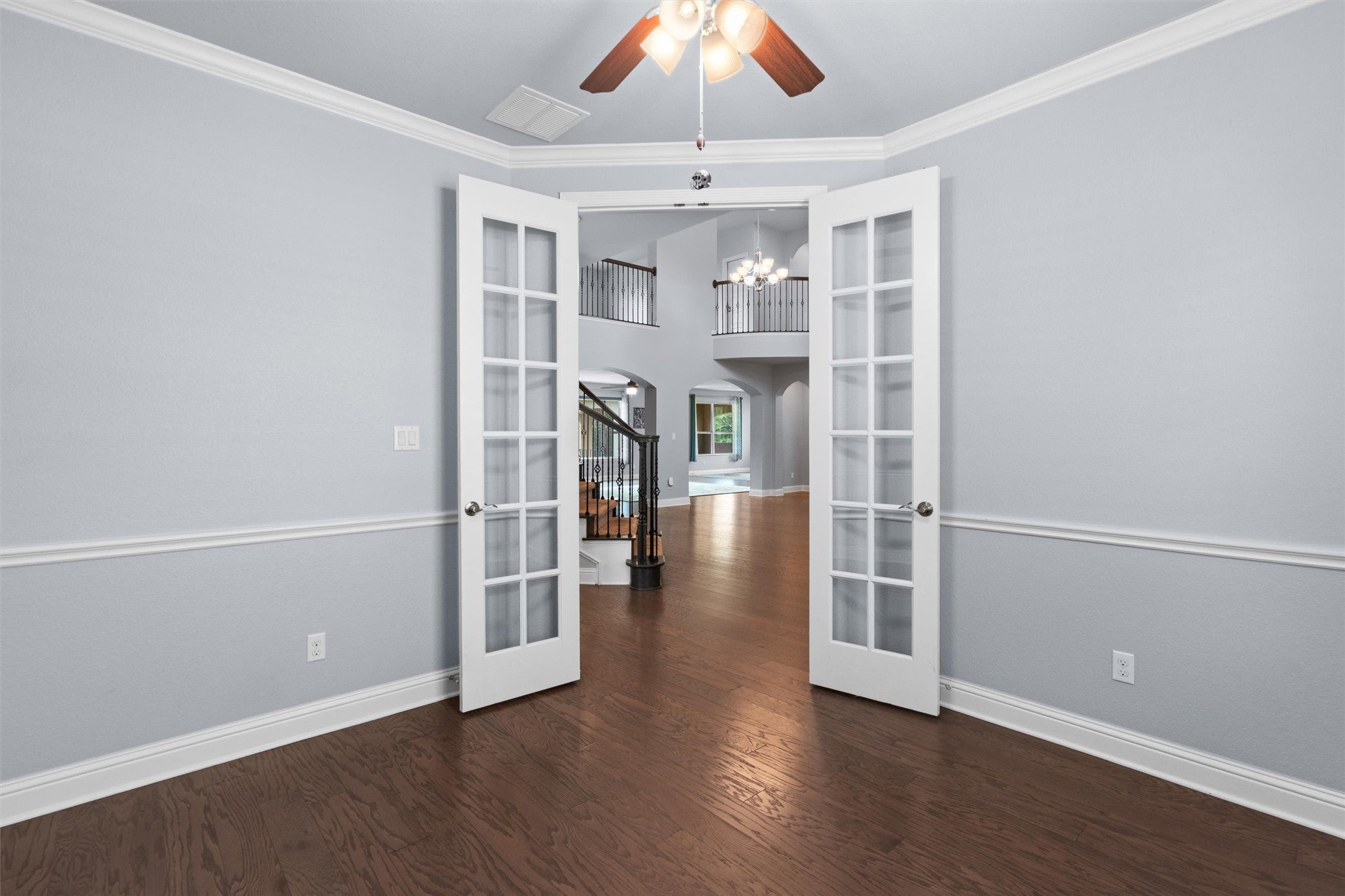 Seller will consider a carpet allowance with accepted offer. Located in the prestigious gated community of Abrantes, this 3,865 sq. ft. Stone/stucco home offers a perfect blend of elegance & comfort. A soaring two-story foyer and Living (or Dining) grand staircase, and warm wood flooring create a stunning first impression. The open-concept living, kitchen, and dining areas showcase breathtaking greenbelt views. Relax by the fireplace or entertain with ease. The chef’s kitchen boasts an oversized island, ample storage, stainless steel appliances,( SS Refrigerator conveys) quartz countertops, and elegant white shaker cabinetry. Large utility with built-in cabinets/ folding counter (Washer & Dryer convey). A bright & airy home office ensures productive workspace behind french doors plus a powder room is located just off the entry perfect for guests and entertaining. Situated on the main-floor, the primary suite is a private retreat with it's wall of windows overlooking the backyard & green space beyond, with a spa-like ensuite featuring dual vanities, a soaking tub, an oversized walk-in shower and large walk-in closet with organizational shelving. The versatile Second Floor draws you up the beautifully curved staircase where you'll find a spacious game room ideal for family game nights, three additional bedrooms, and two full baths (1 is a Jack/Jill) provide ample space for family or guests. The outdoor oasis begins when you step out onto the expansive covered back patio, perfect for outdoor dining and entertaining. With a .35-acre lot backing onto scenic trails, you’ll experience serenity just minutes from shopping, dining, and major roadways. Located within walking distance to top-rated schools from the Residents only private gate, this home offers an exceptional lifestyle. A small portion of the lot is designated in the 100 year flood plain, but elevation certificate shows all of the house is above the flood plain, so no flood insurance should be needed.