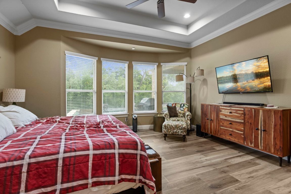 SUMMER TIME DREAM HOME Welcome to this stunning home in the highly sought-after Bridges at Bear Creek neighborhood! From the open floor plan and soaring ceilings to the backyard oasis with a sparkling pool & spa this home is designed for comfort and enjoyment. Outdoor living also includes a covered porch and gas grill, sprinkler system & pretty greenbelt views. The primary suite has a bay window overlooking the pool. Spa-like primary bath with an enormous custom closet with built-ins & direct laundry room access. Two spacious secondary bedrooms & a dual-vanity bath on the main level. Chef’s kitchen with breakfast bar, wine fridge, pantry, broom closet, and sunroom/breakfast nook. An office with french door, dining area, living area and a powder room complete the amenities on the main floor. Upstairs is a large bonus room and a large private bedroom with en suite bathroom. This home combines elegance, functionality, and endless possibilities—you may never want to leave!