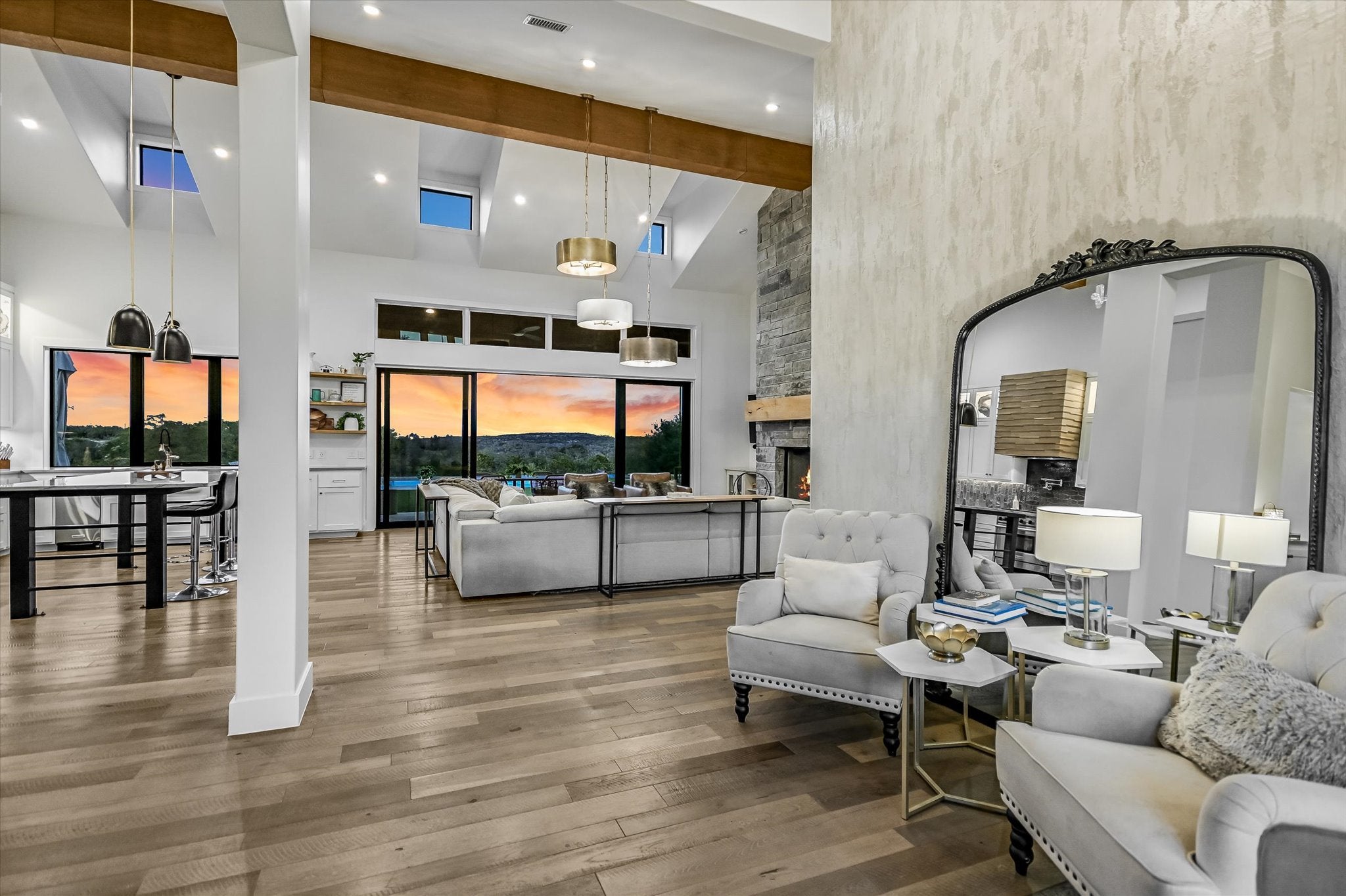 Owner Financing Possible— Unrestricted 42+ Acre Hill Country Masterpiece – Luxury Living Meets Endless Possibilities in Dripping Springs. Nestled in the heart of Texas Hill Country just outside vibrant Dripping Springs (11 Mins to Dripping Springs High School, Dripping Springs Middle School, and Walnut Springs Elementary School), this rare, unrestricted 68-acre estate offers privacy, luxury, and true freedom. Minutes from town’s distilleries, wineries, breweries, and top schools, yet worlds away with easy access to Austin (~30-45 min). The custom modern farmhouse boasts elegant stone and board-and-batten siding, a sleek metal roof, expansive windows, and seamless indoor-outdoor flow under a canopy of mature live oaks. Step outside to the resort-style pool overlooking rolling hills and breathtaking sunsets—perfect for entertaining or serene escapes. Equestrian enthusiasts will appreciate the established horse facilities: a spacious 4 stall barn with covered areas, tack room, Bumk Room w/ full Bathroom, 4.5-acre fenced turn-out pasture, and trailer storage, set amid open pastures ideal for grazing or riding. The standout party barn—with covered porch, 2 large roll-up doors, half-court basketball court and studio apartment—serves as an ideal event space, workshop, guest retreat, or hobby haven. A scenic wet-weather creek threads through the property, enhancing natural beauty and attracting wildlife, while gently rolling terrain, native grasses, and ancient oaks evoke authentic Texas ranch living. With no restrictions, envision your dream: expand the equestrian setup, add structures, start a vineyard, create a family compound, or simply enjoy the freedom of 42+ acres of prime Hill Country land. Stunning views, dramatic sunsets, abundant wildlife, and your private oasis in one of Texas’s most desirable areas. NEW SURVEY PURCHASED BY SELLERS. BUYER RESPONSIBLE FOR ALL DUE DILIGENCE. Also listed under MLS 2335875 for the purchase of the full 68 acres.