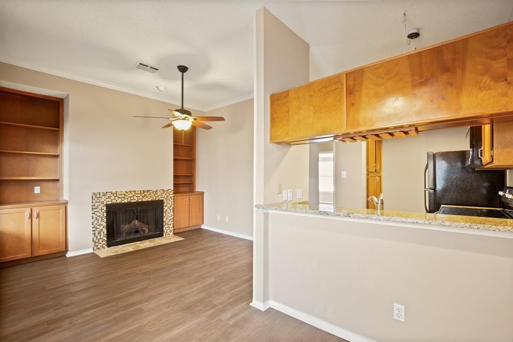 Available now for 2026 PRE LEASE! This condominium presents an attractive property in a desirable Austin area that's great for UT students! The kitchen offers a space for culinary exploration, featuring shaker cabinets complemented by stone countertops and detailed with crown molding, alongside a kitchen peninsula that provides a functional area for preparation and casual dining. In the living room, a fireplace creates a focal point for gatherings, framed by built-in shelves that offer opportunities for personalization, all enhanced by the elegance of crown molding. The bathroom is equipped with a double vanity, providing convenience and a touch of luxury for everyday routines. Some of the added benefits that come with this unit are the parking spot, and in unit washer and dryer for your convenience. Don't hesitate call for your tour today!