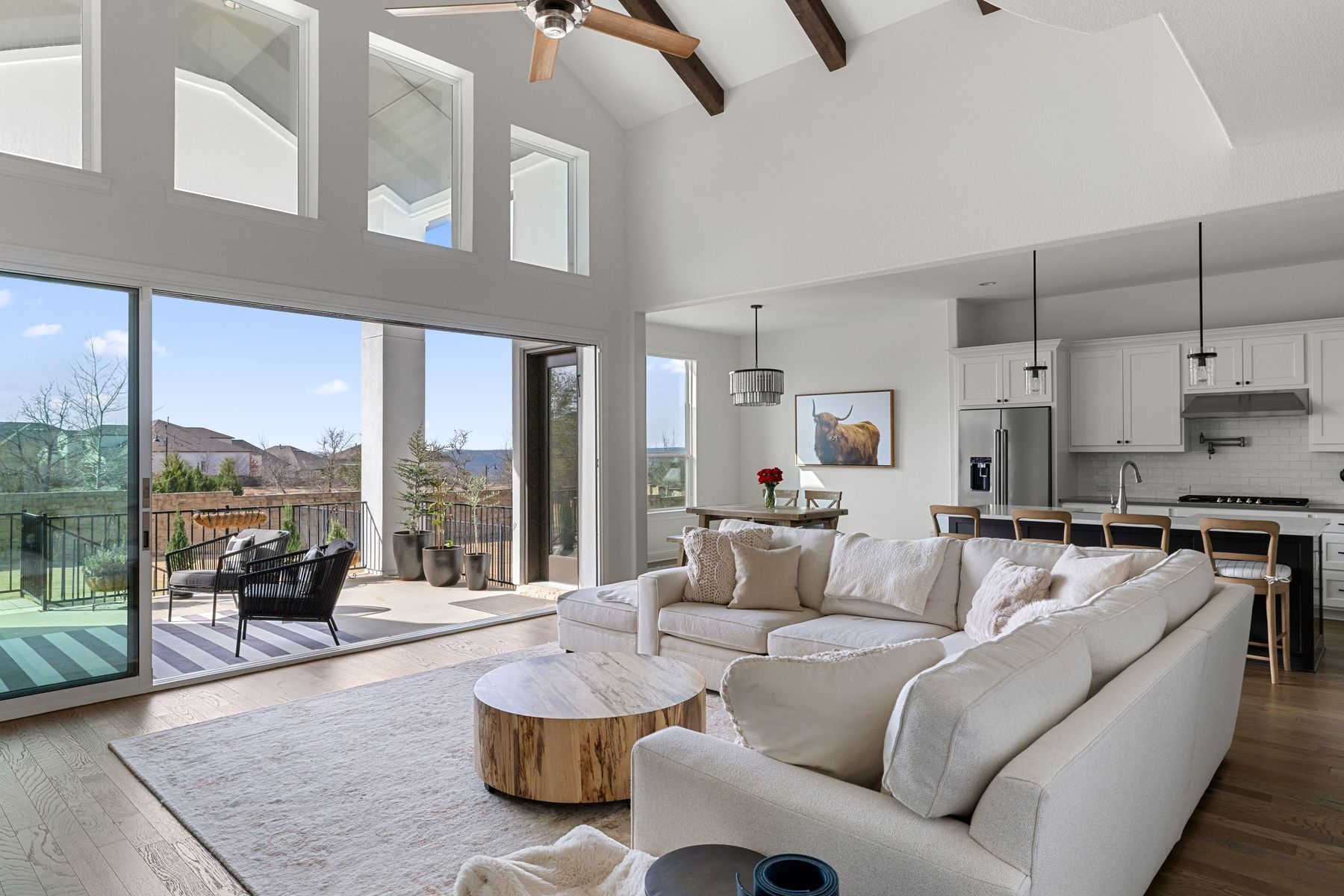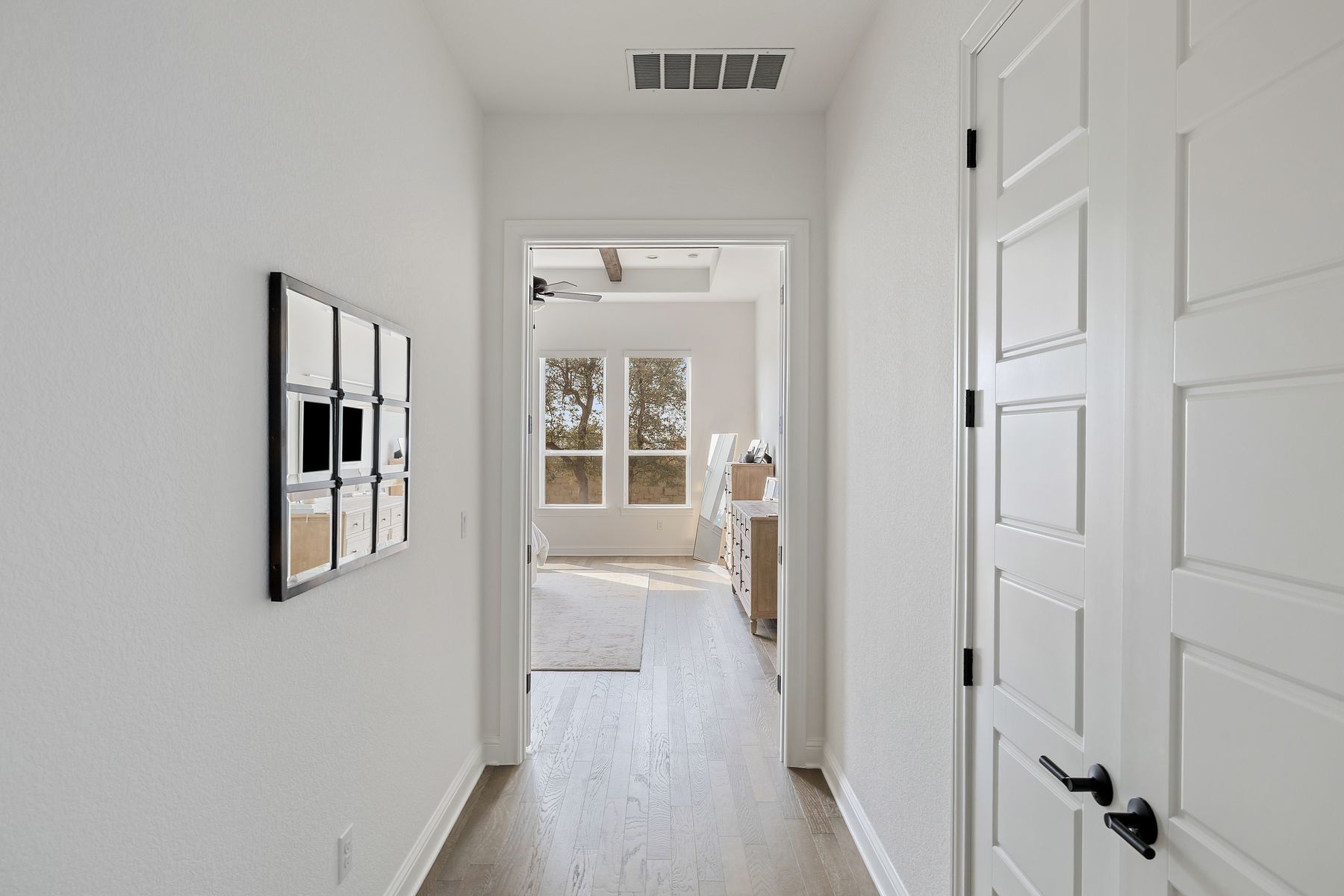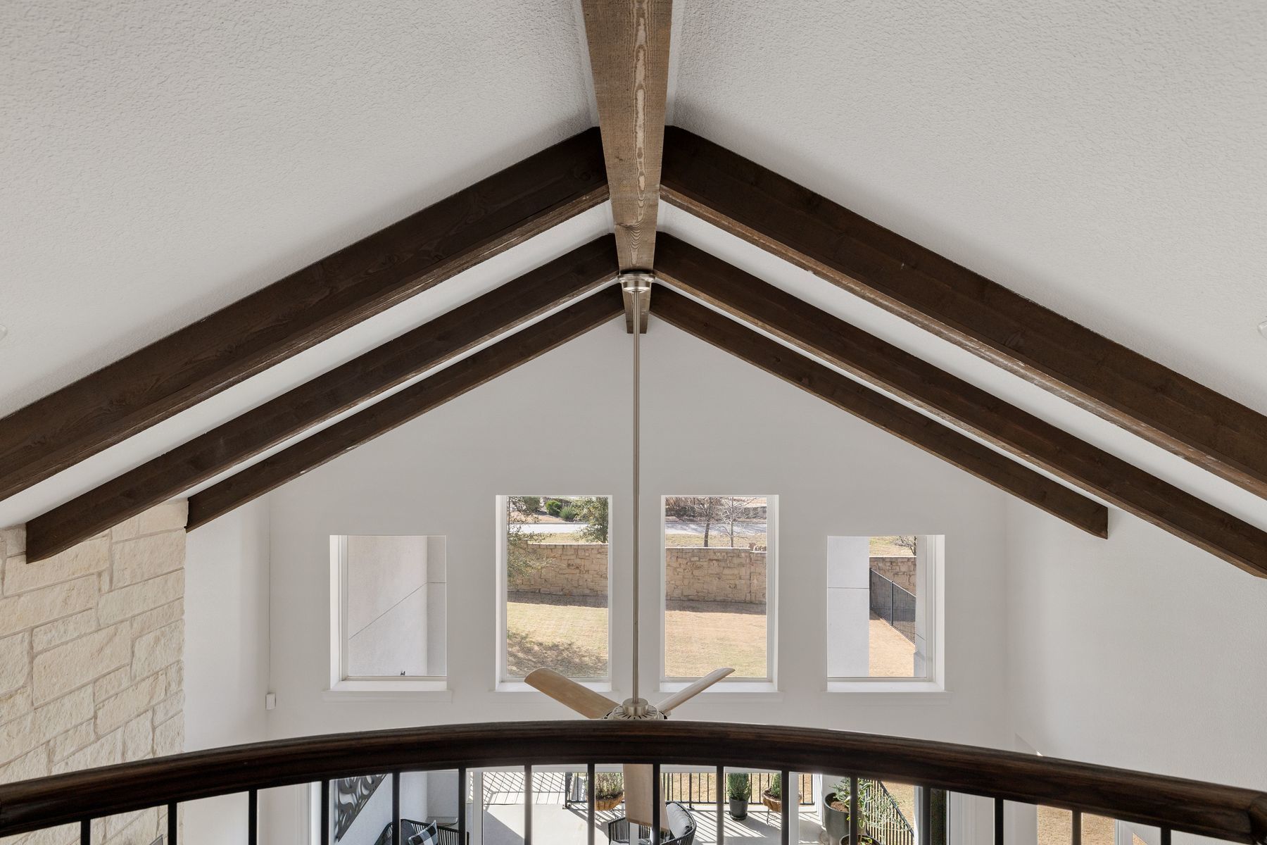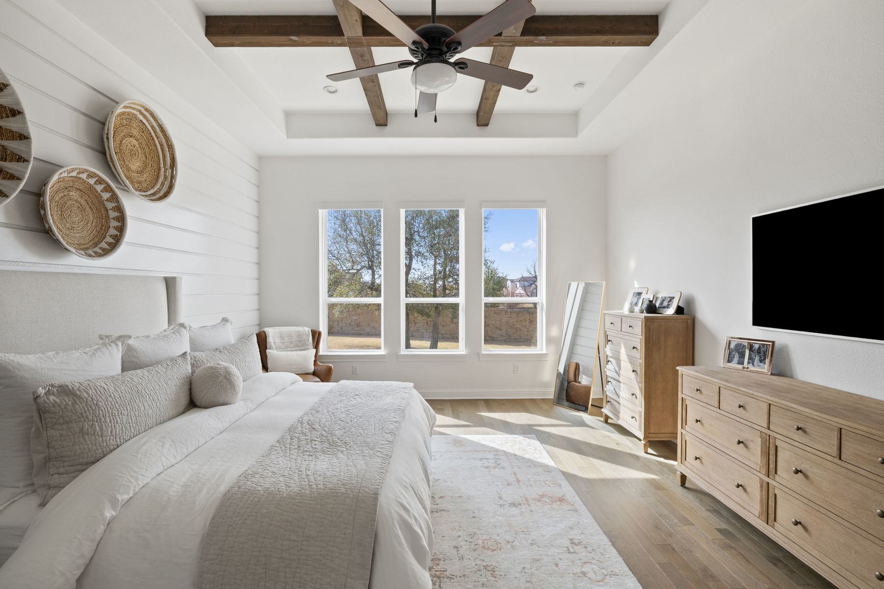 Exquisite north-facing 4-bedroom Toll Brothers Artisan showcasing refined design, elevated finishes, and nearly $120K in recent upgrades. Striking curb appeal leads to a dramatic entry with a sweeping staircase, statement lighting, and rich hardwood floors that anchor the open-concept living spaces. Designed for both grand entertaining and intimate gatherings, the elegant dining area flows seamlessly into a light-filled chef’s kitchen featuring an oversized island, breakfast area, and a rare walk-in wine cellar, a true conversation piece. Walls of windows invite natural light and create an airy, sophisticated ambiance. The thoughtfully designed floor plan offers two bedrooms on the main level and two upstairs, each with its own private ensuite bath, delivering exceptional flexibility for multi-generational living or long-term guests. The primary suite is a luxurious retreat with a spa-inspired bath, dual vanities, soaking tub, and walk-in shower. A dedicated custom office on the main floor provides an executive-level work-from-home space. Upstairs, a balcony overlooks the main living area and highlights stunning beamed ceilings, while a versatile flex space offers endless possibilities for media, fitness, or additional lounge space. Step outside to the covered back porch — ideal for morning coffee or evening unwinding. Located just off Hwy 1431 with convenient access to the Texas Hill Country, downtown Austin, and premier shopping and dining. Residents of Travisso enjoy resort-style amenities including a pool, fitness center, clubhouse, and scenic trails. Extensive recent enhancements include custom closets, fresh designer paint, automatic blinds, new carpet, new AC unit, updated fixtures, Tesla charger, whole-home surge protection, and new appliances - delivering a truly turnkey luxury experience.