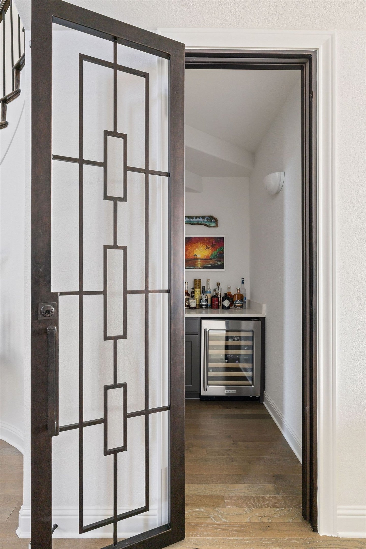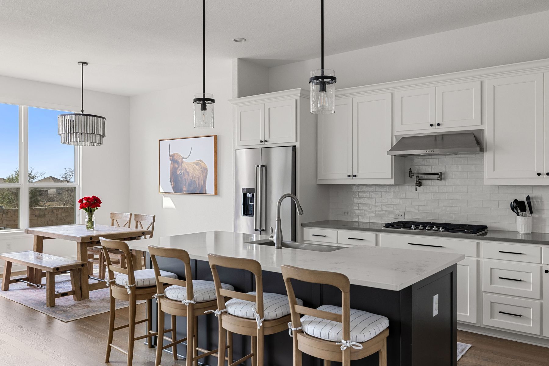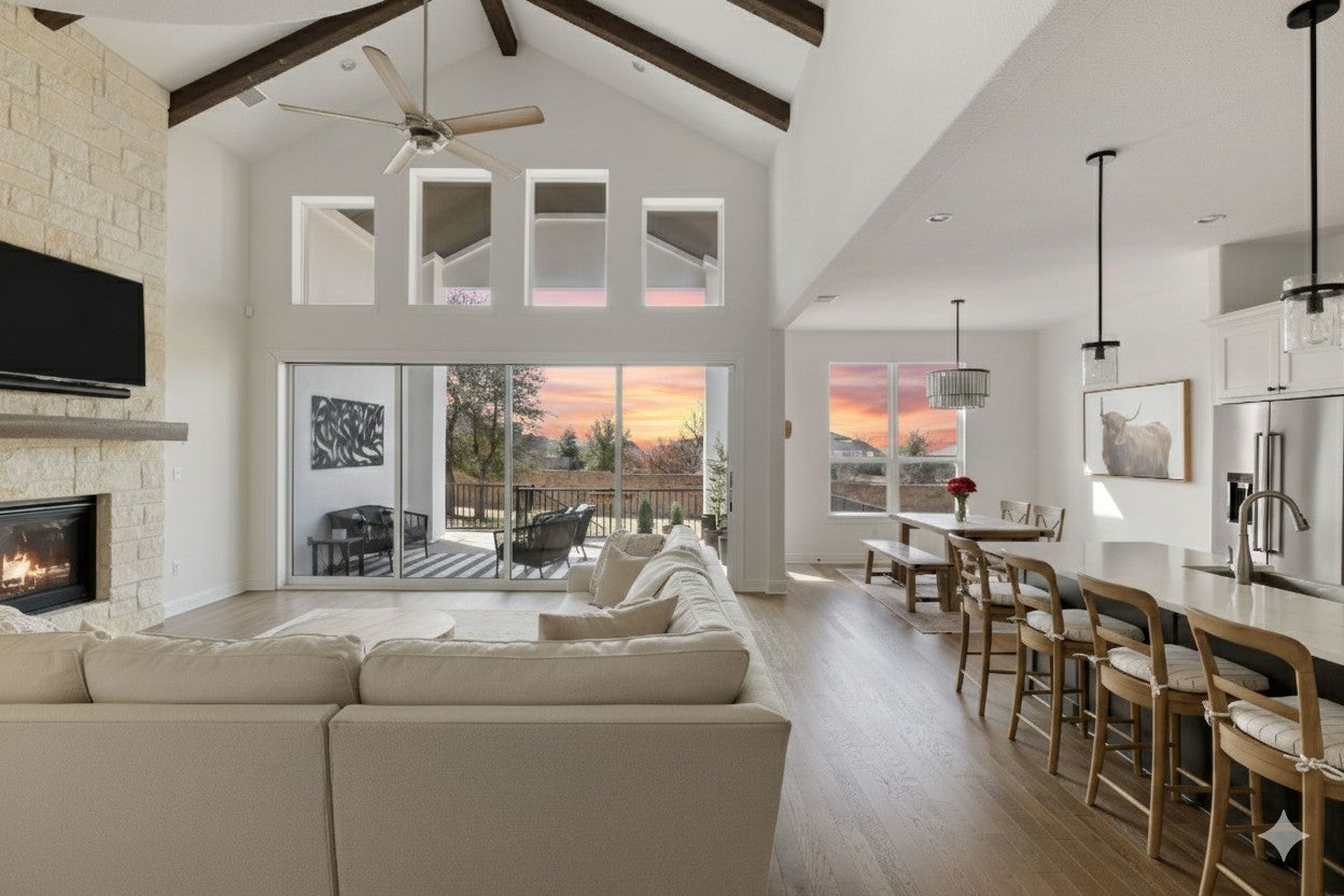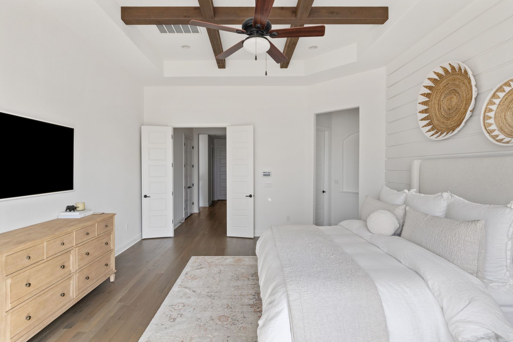 Exquisite north-facing 4-bedroom Toll Brothers Artisan showcasing refined design, elevated finishes, and nearly $120K in recent upgrades. Striking curb appeal leads to a dramatic entry with a sweeping staircase, statement lighting, and rich hardwood floors that anchor the open-concept living spaces. Designed for both grand entertaining and intimate gatherings, the elegant dining area flows seamlessly into a light-filled chef’s kitchen featuring an oversized island, breakfast area, and a rare walk-in wine cellar, a true conversation piece. Walls of windows invite natural light and create an airy, sophisticated ambiance. The thoughtfully designed floor plan offers two bedrooms on the main level and two upstairs, each with its own private ensuite bath, delivering exceptional flexibility for multi-generational living or long-term guests. The primary suite is a luxurious retreat with a spa-inspired bath, dual vanities, soaking tub, and walk-in shower. A dedicated custom office on the main floor provides an executive-level work-from-home space. Upstairs, a balcony overlooks the main living area and highlights stunning beamed ceilings, while a versatile flex space offers endless possibilities for media, fitness, or additional lounge space. Step outside to the covered back porch — ideal for morning coffee or evening unwinding. Located just off Hwy 1431 with convenient access to the Texas Hill Country, downtown Austin, and premier shopping and dining. Residents of Travisso enjoy resort-style amenities including a pool, fitness center, clubhouse, and scenic trails. Extensive recent enhancements include custom closets, fresh designer paint, automatic blinds, new carpet, new AC unit, updated fixtures, Tesla charger, whole-home surge protection, and new appliances - delivering a truly turnkey luxury experience.