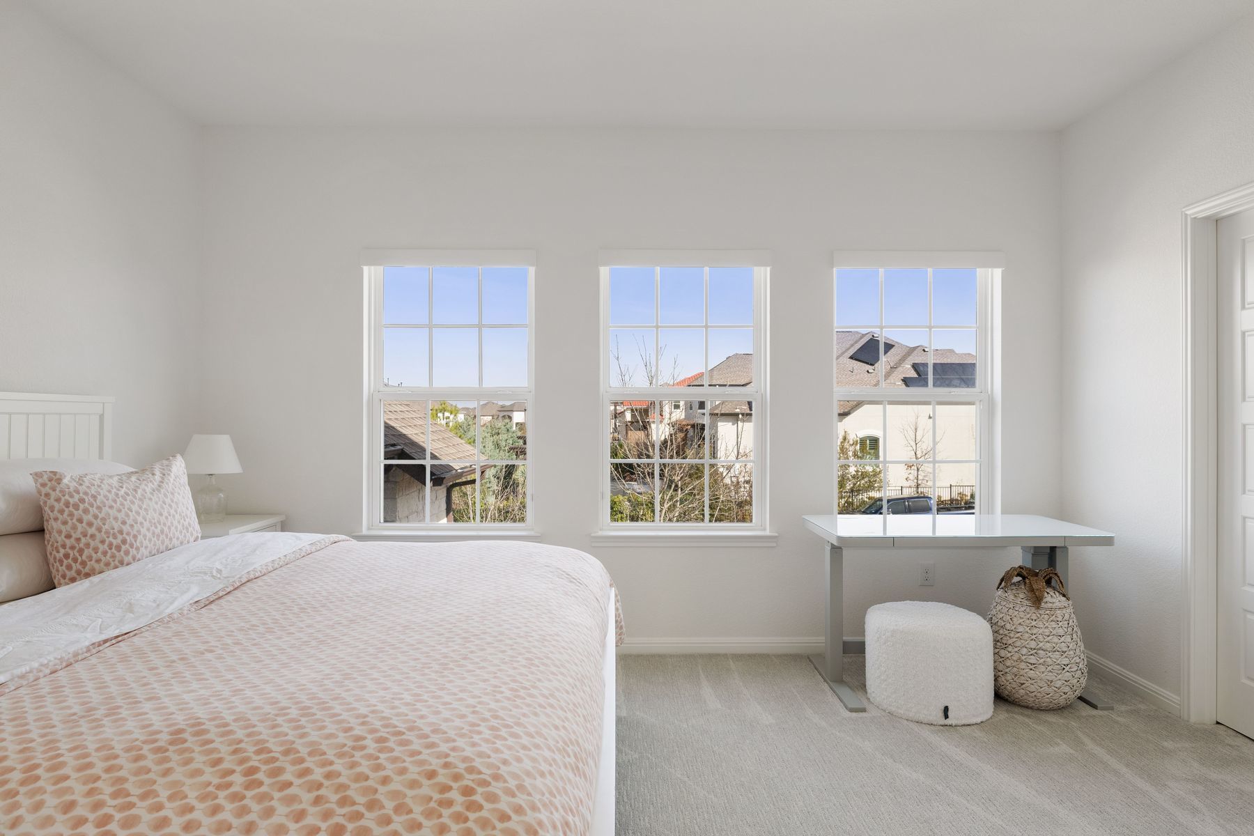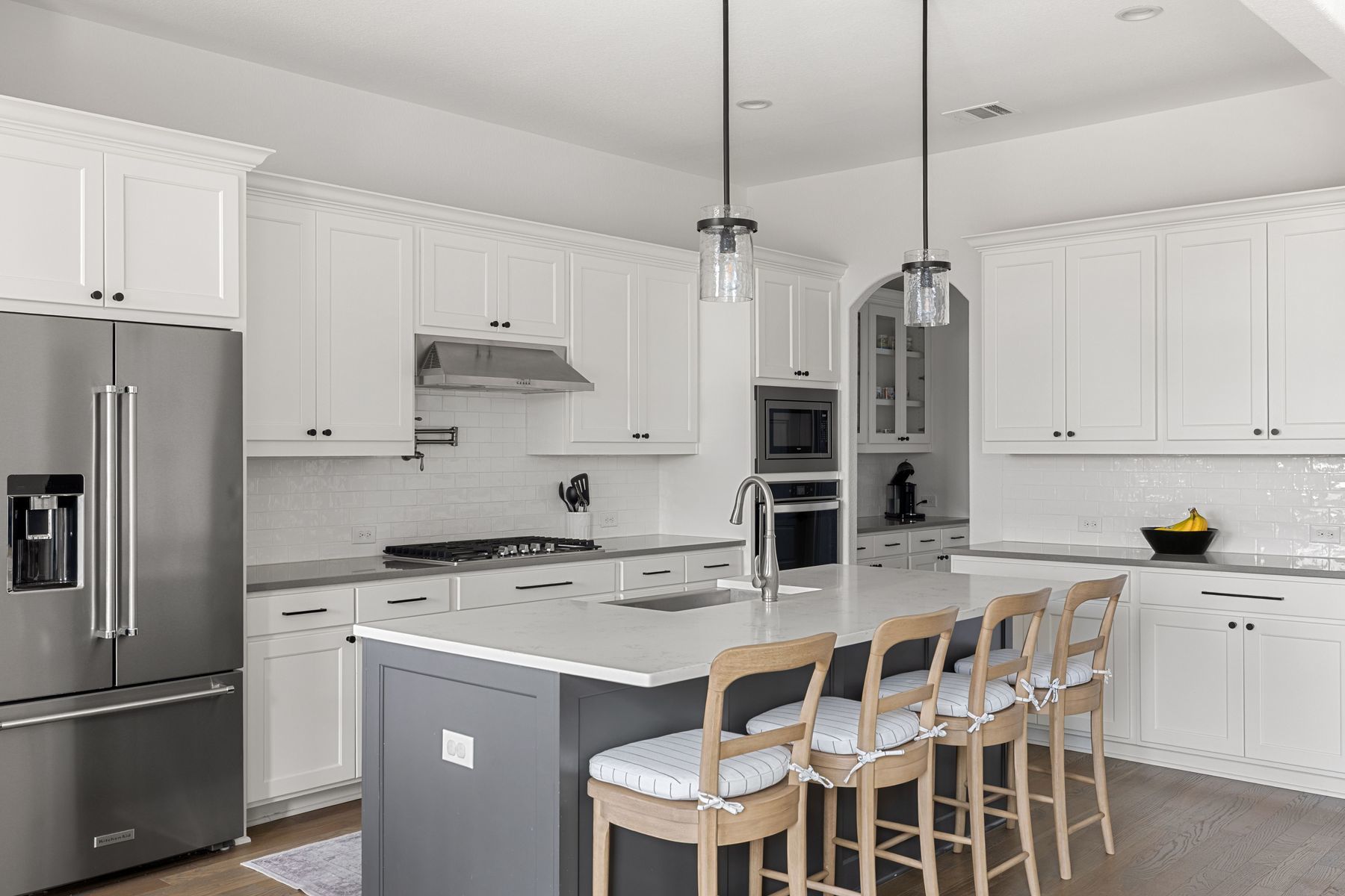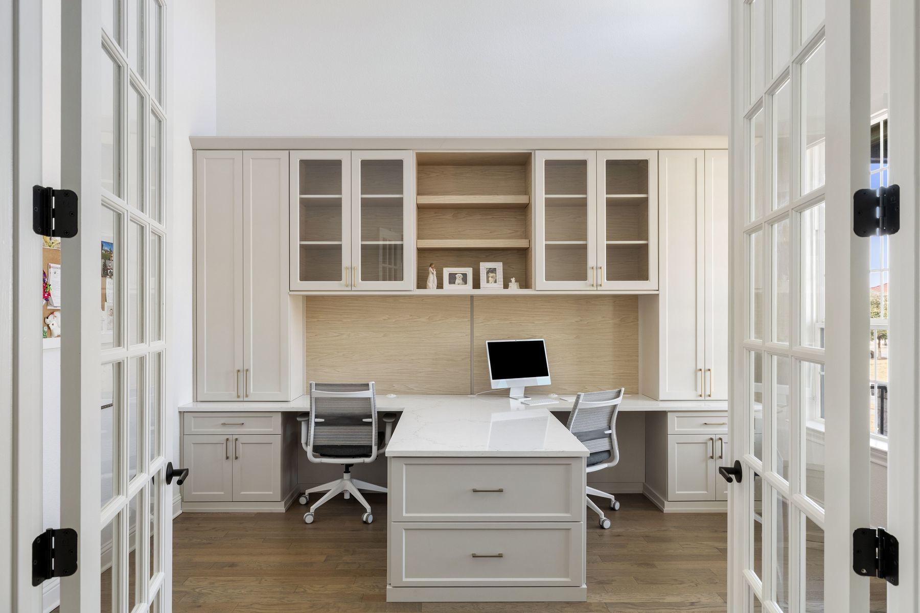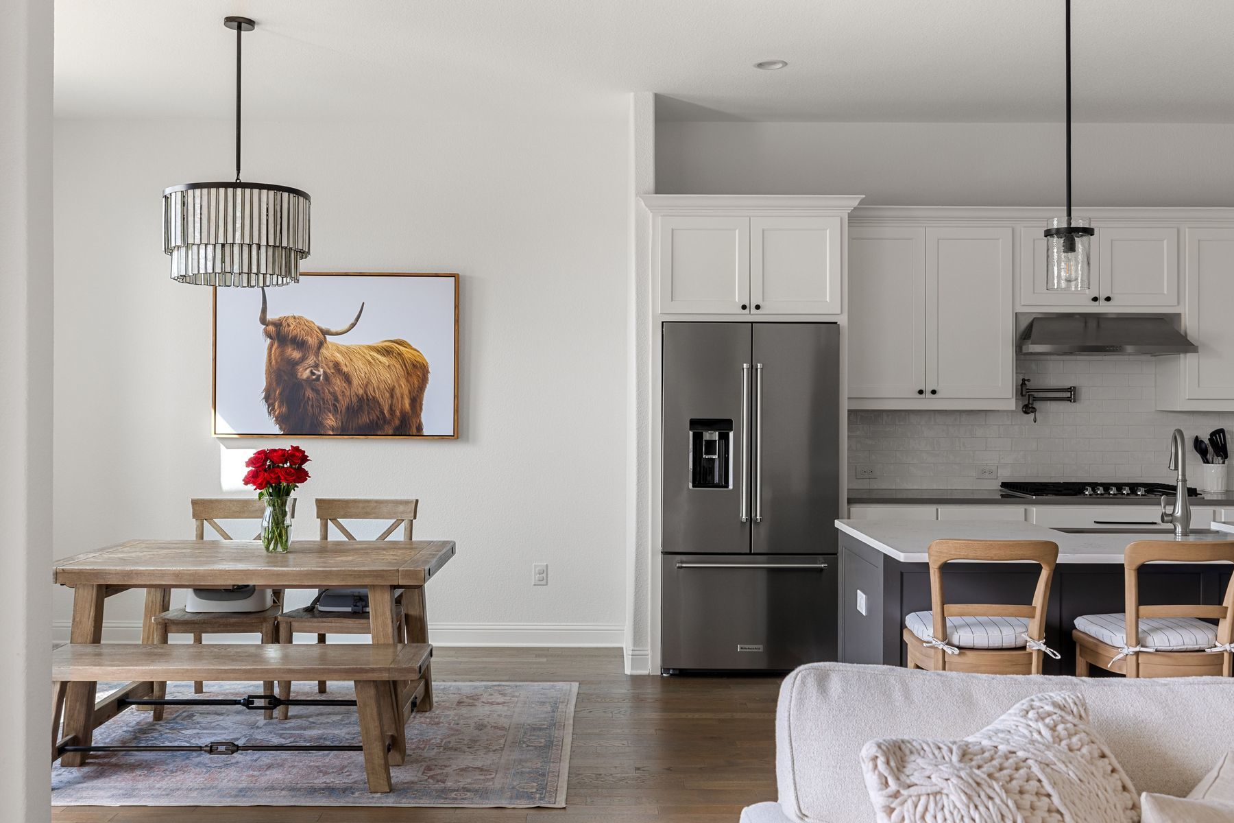 Exquisite north-facing 4-bedroom Toll Brothers Artisan showcasing refined design, elevated finishes, and nearly $120K in recent upgrades. Striking curb appeal leads to a dramatic entry with a sweeping staircase, statement lighting, and rich hardwood floors that anchor the open-concept living spaces. Designed for both grand entertaining and intimate gatherings, the elegant dining area flows seamlessly into a light-filled chef’s kitchen featuring an oversized island, breakfast area, and a rare walk-in wine cellar, a true conversation piece. Walls of windows invite natural light and create an airy, sophisticated ambiance. The thoughtfully designed floor plan offers two bedrooms on the main level and two upstairs, each with its own private ensuite bath, delivering exceptional flexibility for multi-generational living or long-term guests. The primary suite is a luxurious retreat with a spa-inspired bath, dual vanities, soaking tub, and walk-in shower. A dedicated custom office on the main floor provides an executive-level work-from-home space. Upstairs, a balcony overlooks the main living area and highlights stunning beamed ceilings, while a versatile flex space offers endless possibilities for media, fitness, or additional lounge space. Step outside to the covered back porch — ideal for morning coffee or evening unwinding. Located just off Hwy 1431 with convenient access to the Texas Hill Country, downtown Austin, and premier shopping and dining. Residents of Travisso enjoy resort-style amenities including a pool, fitness center, clubhouse, and scenic trails. Extensive recent enhancements include custom closets, fresh designer paint, automatic blinds, new carpet, new AC unit, updated fixtures, Tesla charger, whole-home surge protection, and new appliances - delivering a truly turnkey luxury experience.