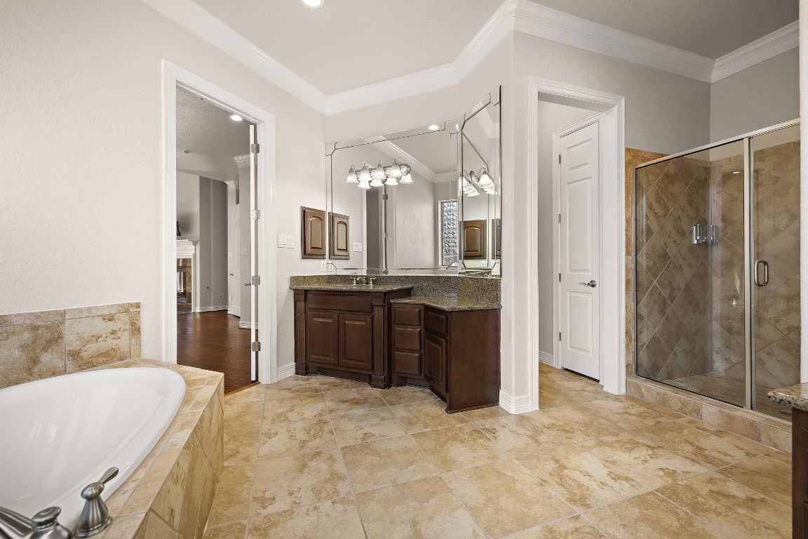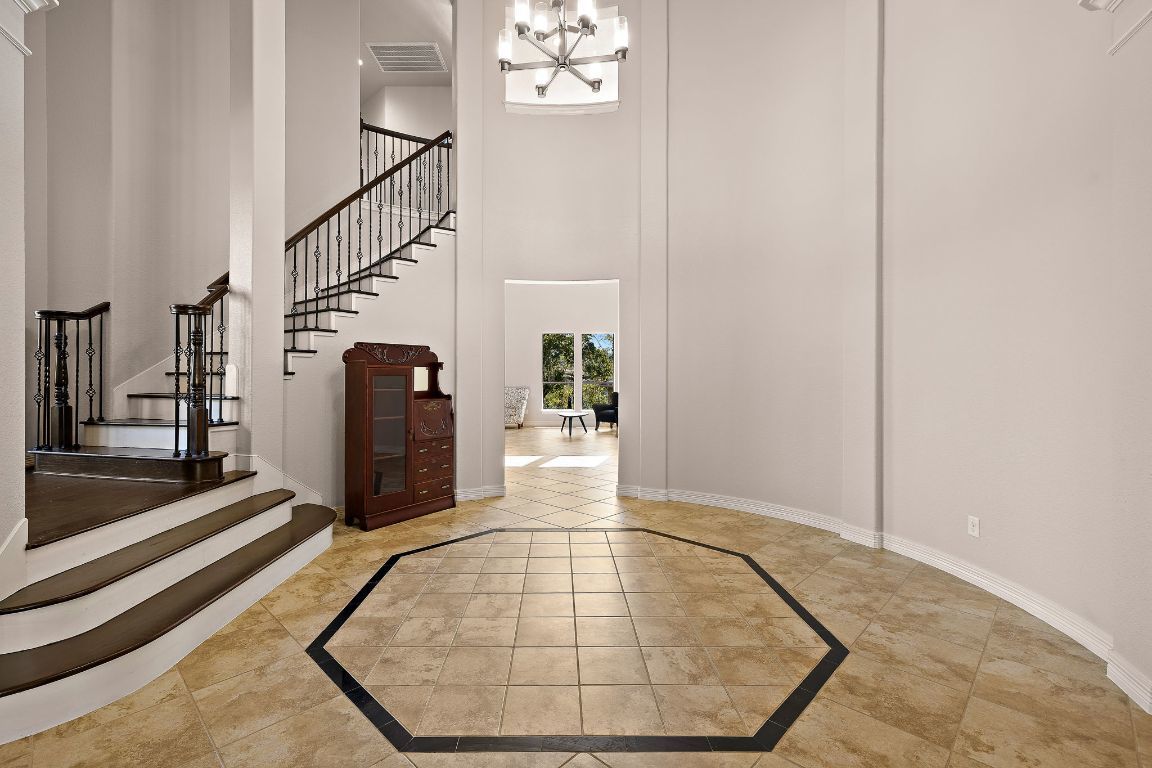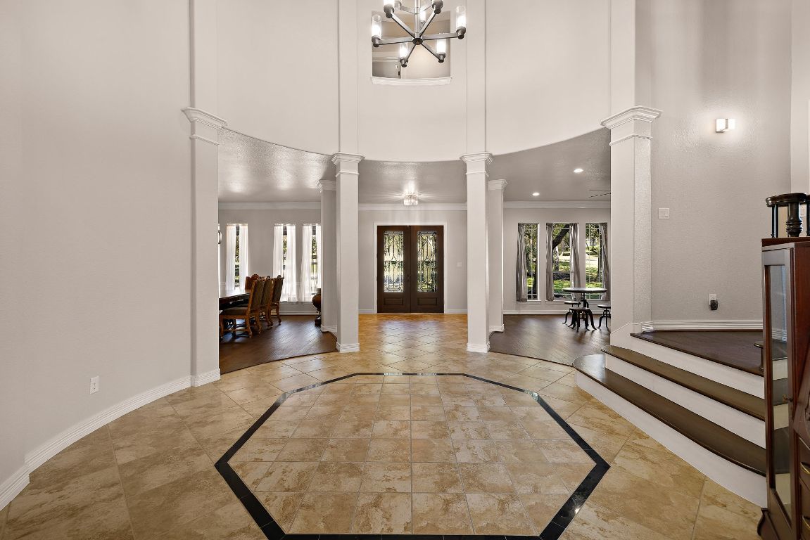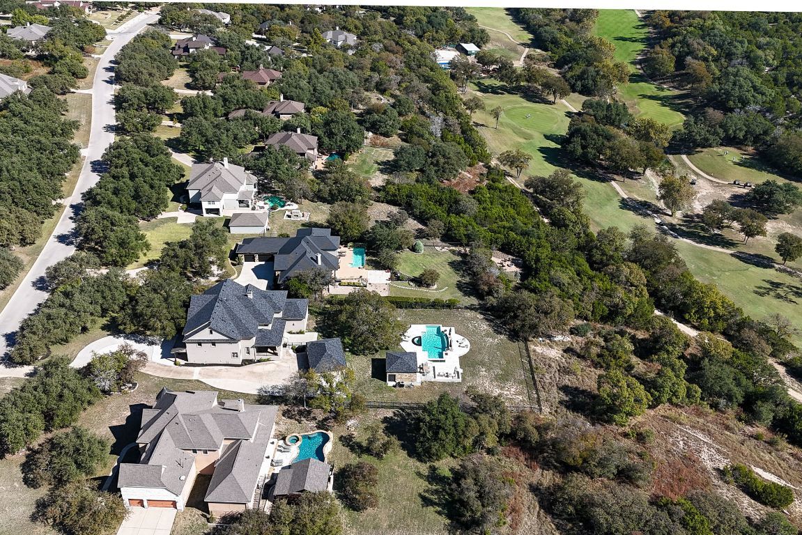 Experience the perfect blend of elegance and comfort in this stunning 5-bedroom home on 1.4 acres of beautifully landscaped land with no rear neighbors and breathtaking views. Upon entering the home and stepping into the rotunda, it’s designed for both entertaining and everyday living. This home features 3 spacious living areas, a media room, a dedicated office, high ceilings in several areas, 3.5 baths, 2 grand staircases, and smart televisions. Additionally, there are ceiling fans throughout (including patio and pool area), recessed lighting, and both HVAC’s have been recently replaced! Enjoy engineered hardwood and tile flooring throughout—no carpet anywhere! The primary suite offers a relaxing retreat with a designated seating area and fireplace, dual vanities, a large walk-in shower, and a garden jacuzzi tub. There are several walk-in closets for storage. The insulated and climate-controlled 3-car garage provides year-round comfort and functionality. Step outside to your private oasis complete with an oversized heated and chilled sport-bottom, faux infinity-edge pool, festive programmable pool lighting for entertaining, auto-filler/drainer for low-maintenance, gas-heated hot tub, and a fully-equipped outdoor kitchen complete with a refrigerator and its own bathroom/changing room. The outdoor area features multiple seating areas, travertine decking, an outdoor shower, and stunning views. Three cozy fireplaces—in the living room, primary bedroom, and on the back porch—create inviting spaces indoors and out. With high-quality interior paint throughout and thoughtful upgrades in every detail, this home combines sophistication and warmth in a truly exceptional setting.