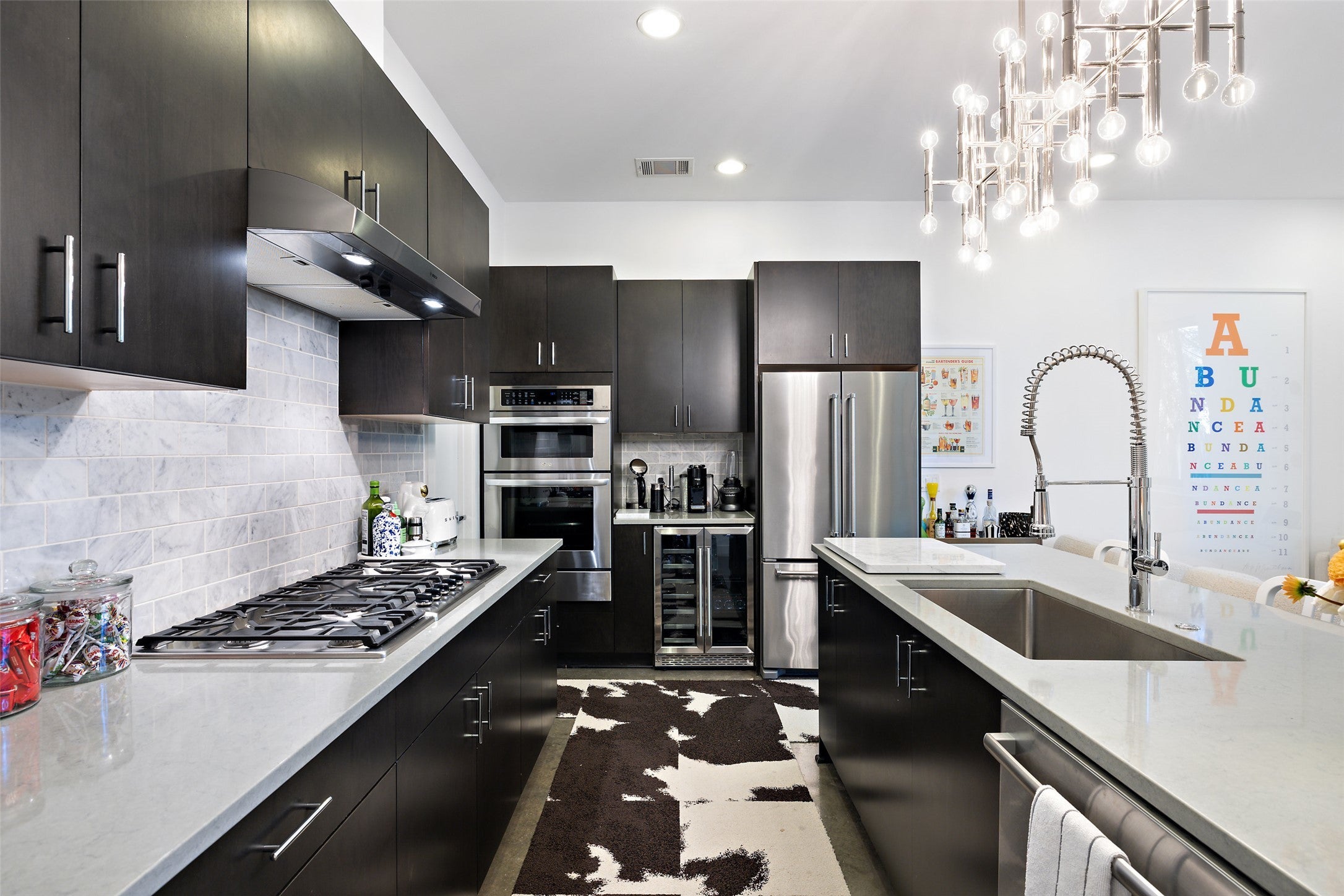 - Built-In Gas Range, Built-In Oven, Dryer, Dishwasher, Disposal, Microwave, Refrigerator, Wine Refrigerator, Washer