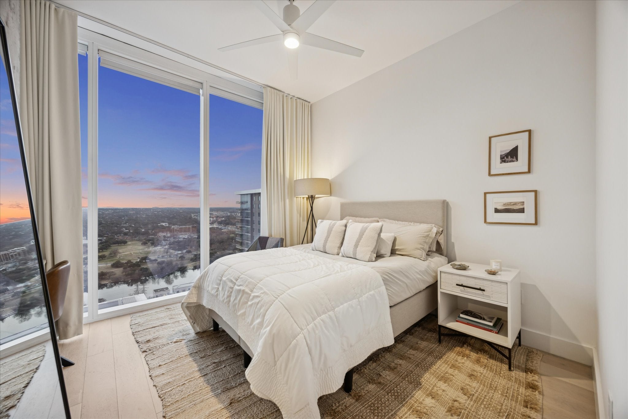 One-of-a-kind, custom 2-bedroom residence with breathtaking lake views from the 28th floor. The only unit in the building featuring this reimagined floor plan, this home has been thoughtfully redesigned to maximize space, storage, and luxury living. The primary suite offers an expanded walk-in closet with a custom white oak closet system, created by combining the original closet and utility space for exceptional functionality. The spa-inspired primary bath showcases dramatic Dekton slab walls, upgraded countertops, and warm brass finishes for a sophisticated, designer feel. The kitchen is equally impressive, featuring striking White Fusion countertops, a live oak slab dining table, customized cabinet inserts, and elevated finishes throughout. Smart living upgrades include a Legrand lighting system, motorized shades, and bonus custom storage solutions. Two premium parking spaces convey. Perfectly positioned with direct access to Shoal Creek and the Lady Bird Lake Hike & Bike Trail, this residence offers effortless walkability to Trader Joe’s, Whole Foods, and some of Austin’s best dining and entertainment. Residents enjoy two full floors of resort-style amenities including a pool, yoga studio, state-of-the-art fitness center, theater, dog park, outdoor terrace, club and conference rooms, guest suites, bike storage, and 24-hour concierge service.