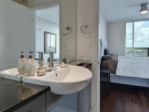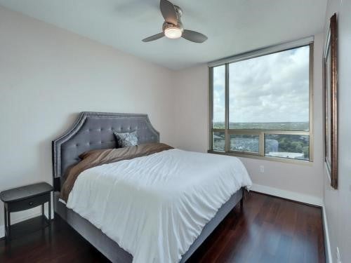This beautifully furnished condo offers breathtaking views of the lake and Hill Country through expansive floor-to-ceiling windows that fill the open-concept space with natural light, perfectly complementing the warm wood floors. Enjoy modern comforts with a 50-inch smart TV, modem, and Wi-Fi router already in place. The sleek kitchen features stainless steel appliances, granite countertops, and a stylish tiled backsplash. Facing southwest, the unit includes two premier reserved parking spaces on level P2. Just one block from Whole Foods and within easy walking distance to top downtown dining, shopping, entertainment, and the scenic Lady Bird Lake hike-and-bike trail, the location is unmatched. Starbucks, Trader Joe’s, and Lifetime Fitness are also just steps away. Located in Spring Condos, a Green Building Certified community, residents enjoy premium 5th-floor amenities including a resort-style pool, fully equipped gym, guest suites, a private kitchen and dining lounge, and a community recycling program—all designed for both comfort and sustainability. Pre-wired fiber internet, nightly valet trash service, 24-hour concierge, and secured card access to the building, amenities, and parking garage. This condo offers the perfect blend of upscale living, eco-conscious features, and unbeatable convenience in the heart of Austin.