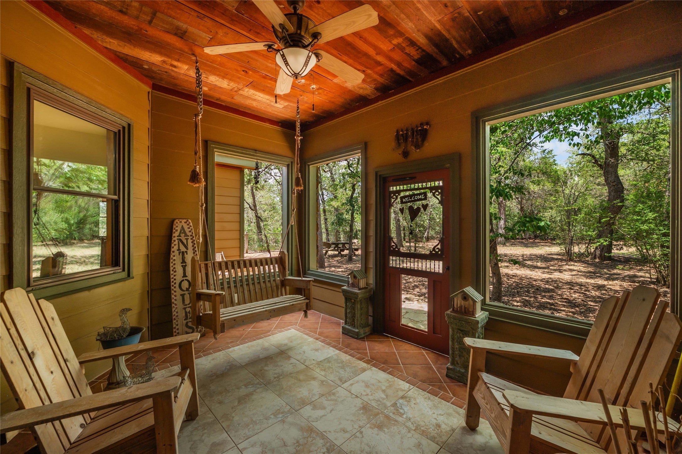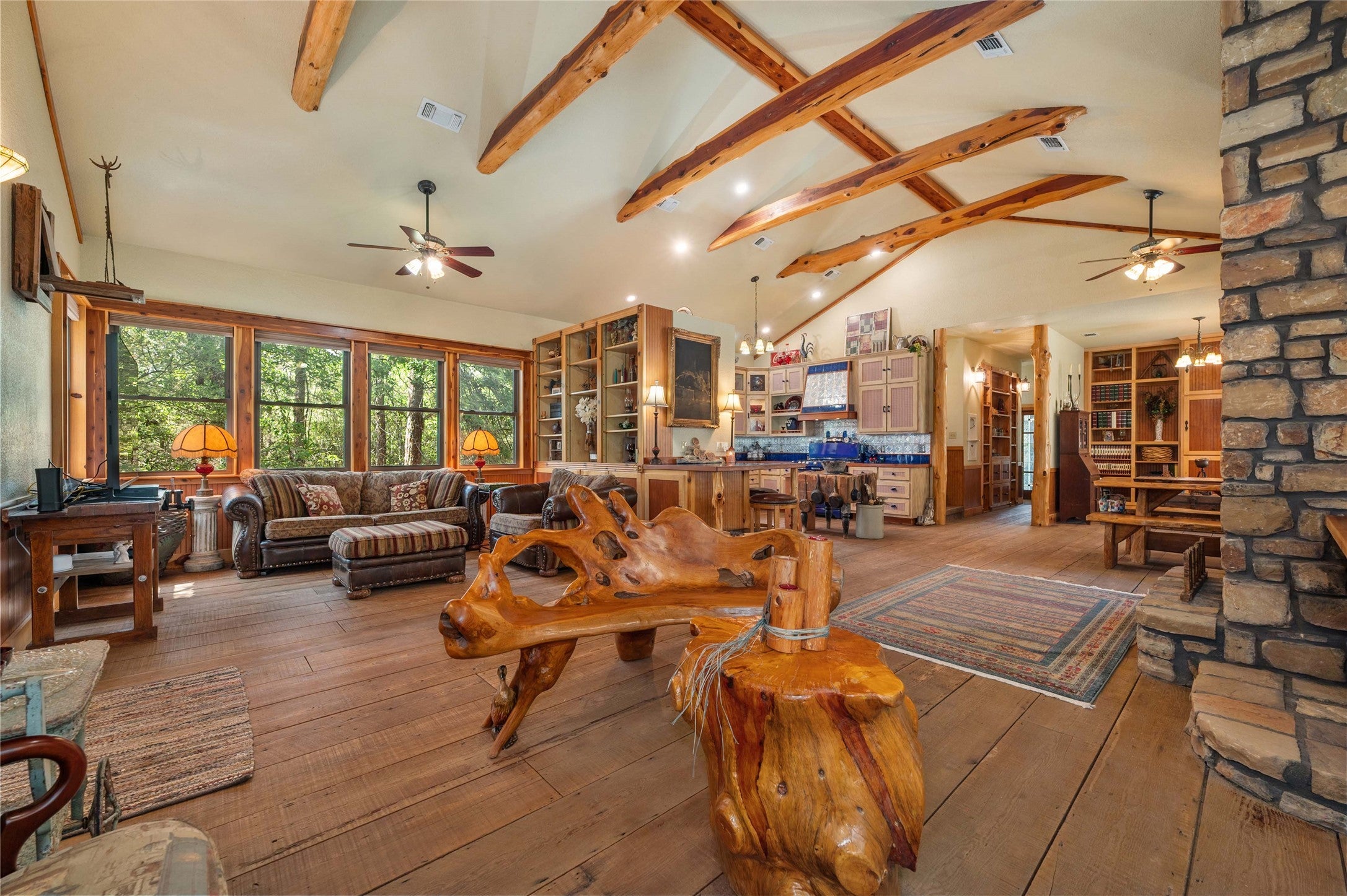 Experience the essence of Texas country living on this serene and secluded 23.45-acre retreat near charming Bastrop. Tucked among a mature tree canopy, this private estate offers a unique blend of heritage and craftsmanship. The custom-built two-story cabin evokes central Texas history with reclaimed wood flooring sourced from a historic Walburg cabin, an original 1950s stove from the Pfluger family homestead, and hand-stripped Bastrop pine columns harvested onsite to support the cathedral ceiling. These authentic details are seamlessly integrated with modern conveniences to create a residence that is both timeless and functional. The cabin is the heart of the property serving as the main dwelling and offering the primary bedroom along with another secondary bedroom and 2.5 baths all on the main level. Additional main level areas include a management center, laundry room, dedicated office/library space, a charming kitchen and large living space with foyer entry. Upstairs is one large open bedroom and bathroom originally intended to serve as a bunkroom that can accommodate multiple sleepers. A separate barndominium provides additional living space ideal for a guest house, rental opportunity, or multigenerational living, complete with an entertainment area. This flexible space offers 2 bedrooms and 2 baths with 2 separate living areas and an open kitchen to living on the main level. With 6 garage bays on property—including a dedicated RV space with hookups—there is ample room for your toys, gear, equipment and adventure essentials. Outdoors, a thoughtfully designed pond supports native wildlife, including bass and ducks, enriching the land’s natural beauty. This one-of-a-kind property offers a slow and relaxed lifestyle, yet remains just a few miles from historic Bastrop, the Airport, COTA, Tesla, and the hustle and bustle of downtown Austin. Tractor may convey, see agent for details. MORE at BastropCountryCabin.com.