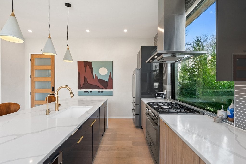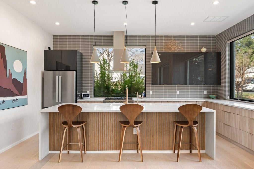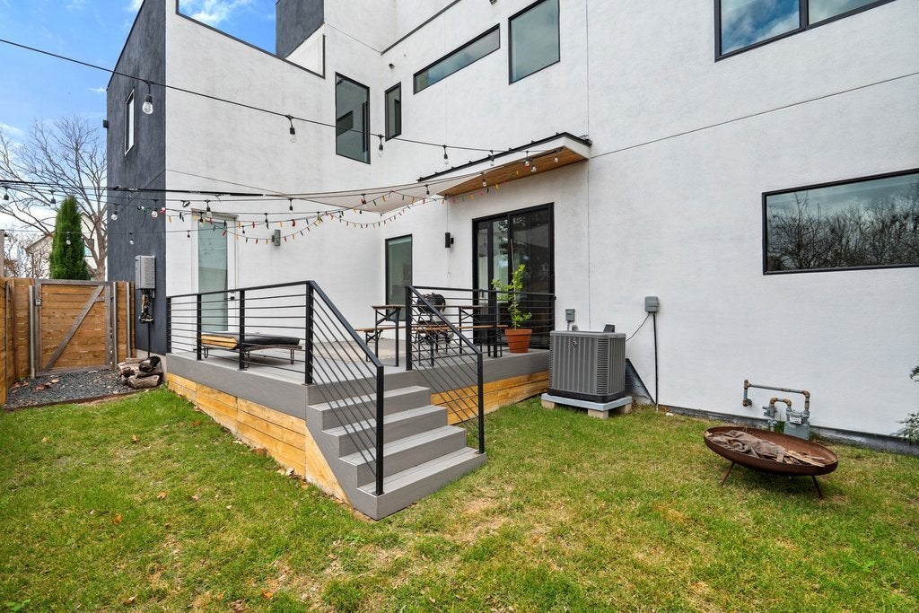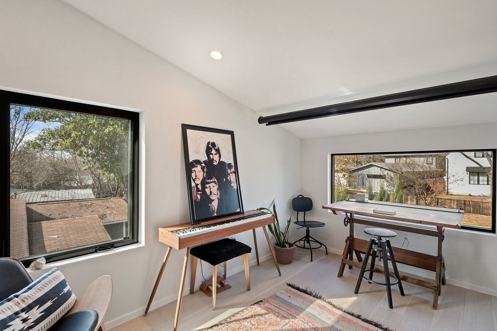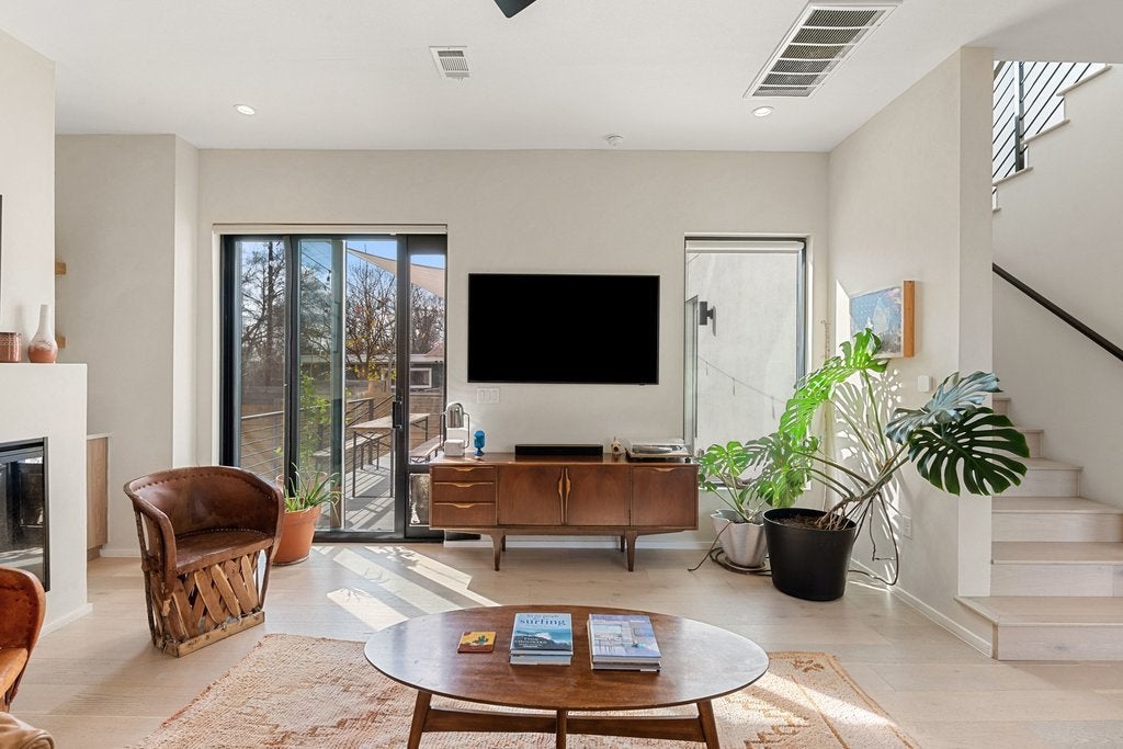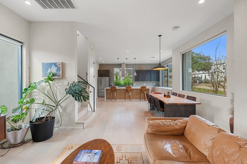 This beautifully appointed three-bedroom, two-and-a-half-bath residence with a dedicated office offers an exceptional blend of refined design and urban convenience, just minutes from Downtown Austin. Natural light fills the home through expansive picture-frame windows, complemented by a Saltillo-tiled entry and sophisticated lighting, including dimming pendants in the dining area and dimmers throughout the kitchen and living spaces. The open-concept floor plan is ideal for everyday living and entertaining, seamlessly connecting indoor and outdoor spaces. The living room features a sleek thermoelectric fireplace and roll-down privacy window treatments, while a private fenced yard and rear patio provide space for year-round enjoyment. The eat-in chef’s kitchen showcases Bertazzoni appliances, custom cabinetry, quartz countertops, and a striking waterfall island. Upstairs, the primary suite offers a serene retreat with designer tile selections, dual vanities, a spa-like walk-in shower, and a large walk-in closet. Locking closets add flexibility for short-term rental potential. Additional highlights include smooth drywall finishes, energy-efficient construction, a tankless water heater, and an attached one-car garage with no shared driveway, enhanced by elevated ceiling storage racks. Ideally located near South Congress, South First, South Lamar, Joe’s Coffee on Manchaca, and the emerging St. Elmo district, this home delivers luxury, versatility, and location in one compelling offering.
