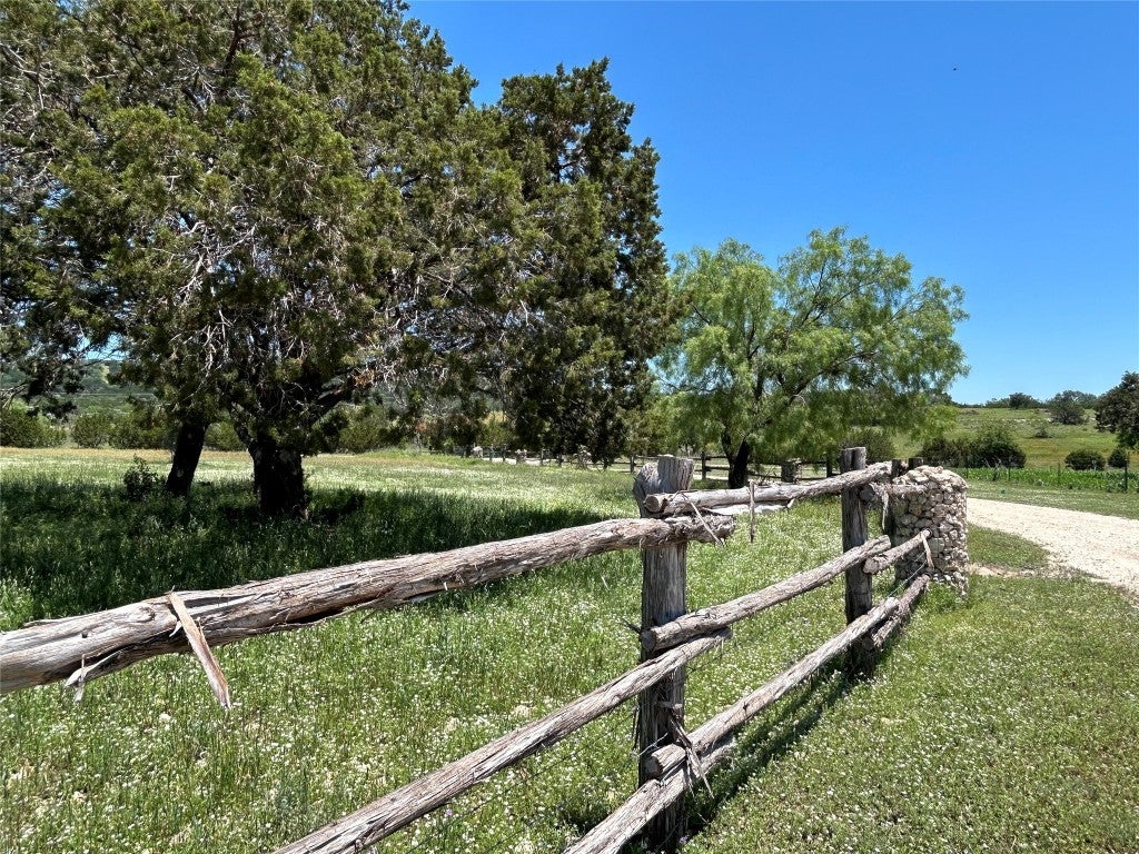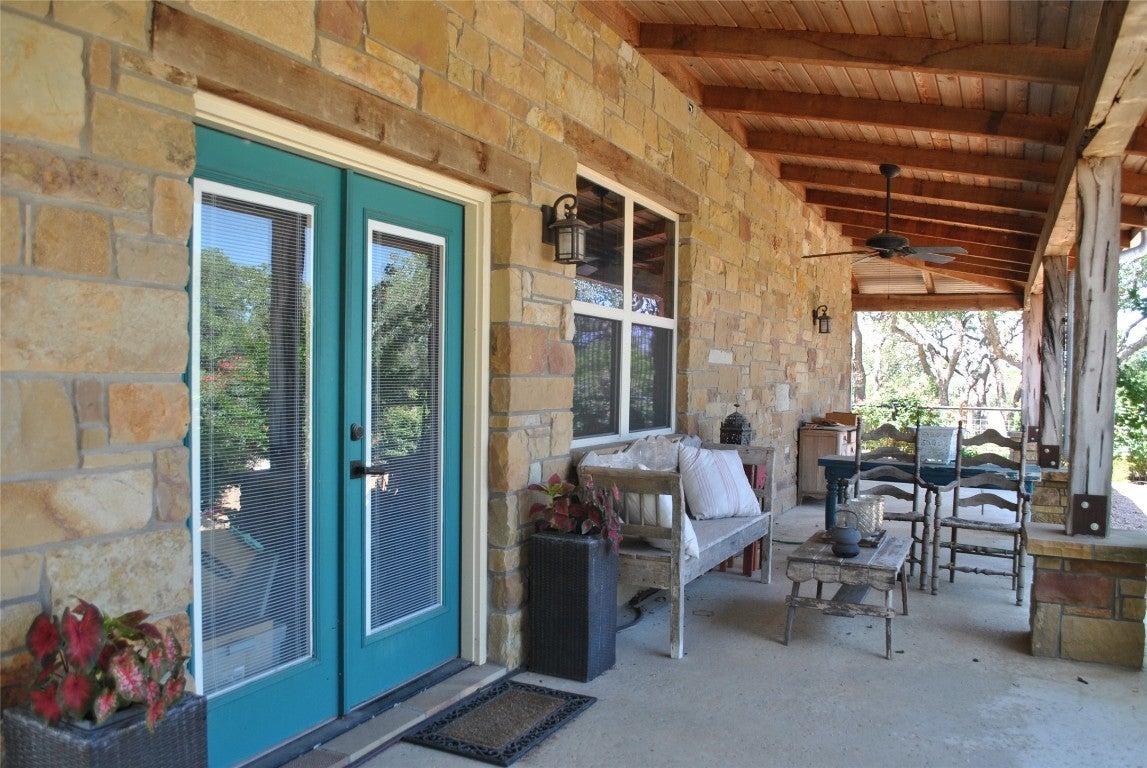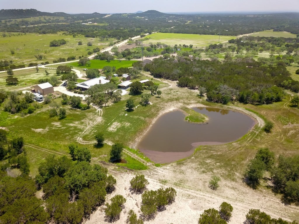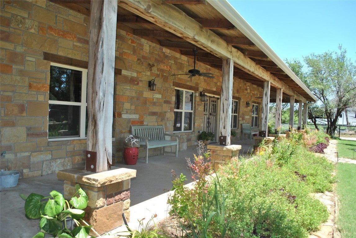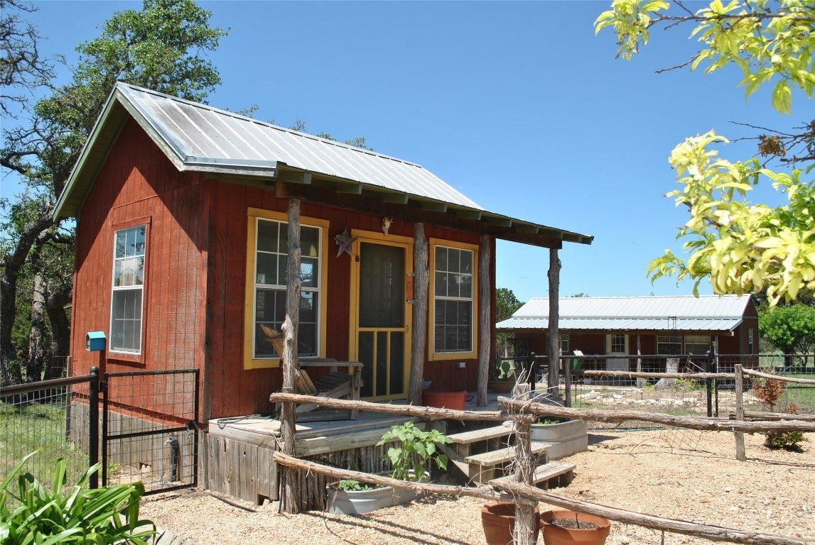 Welcome to Starkeeper Ranch! A wood rail post fence and crushed limestone drive lead to the custom home and multiple outbuildings. The 2,400 sq. ft. home is designed for entertaining. There are two bedrooms, two baths, and an office. The home features custom wood accents and tile finishes that evoke the charm of Taos, New Mexico. Living room has a recessed ceiling, a wet bar and wood-burning fireplace. The kitchen with a recessed ceiling has an oversized island, a large walk-in pantry, and an adjacent dining area with built-in cabinets. The primary bedroom ensuite, built in cabinets, two walk-in closets, two sinks in the bathroom, a walk-in shower, and a heated towel rack. The exterior of the home features native San Saba sandstone and a standing seam metal roof. The oversized porch wraps around the entire house and includes an outdoor shower. The front yard is landscaped with flagstone sidewalk, Tifway 419 Bermuda grass and native plants. The porch features eclectic patio furniture vignettes, adding a Round Top, Texas charm. Outbuildings include: - Covered patio - Quaint wood-frame casita with water and electricity, a kitchen and living space, but no bathroom - Large wood-frame building with water and electricity, a metal roof, and a covered porch - Wood and metal storage building - Small wood and metal building for the water well and pressure tank - Greenhouse There is a two-car carport with an attached storage area. North of the home is a large metal-frame shop barn with concrete floors, two overhead doors, a walk-through door, a loft, and a large overhang for tractors and implements. The barn is used as a woodshop and includes a custom-built office with insulated sheetrock walls, concrete floors, recessed lighting, wood trim, a sink, refrigerator, bathroom, and A/C and heat. The office has WiFi from the main house. Adjacent to the barn is an RV pad with electric and sewer hookups and a chain-link fenced area for a garden and plants.