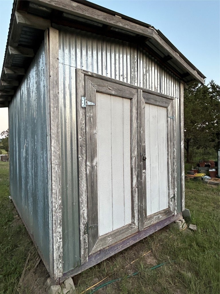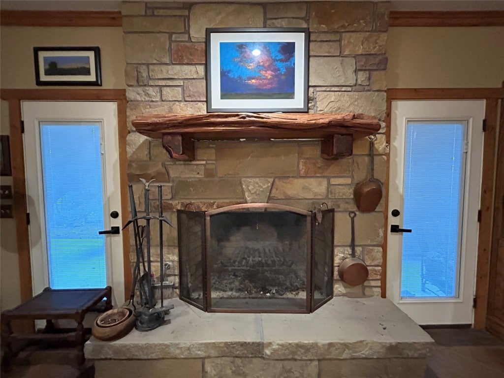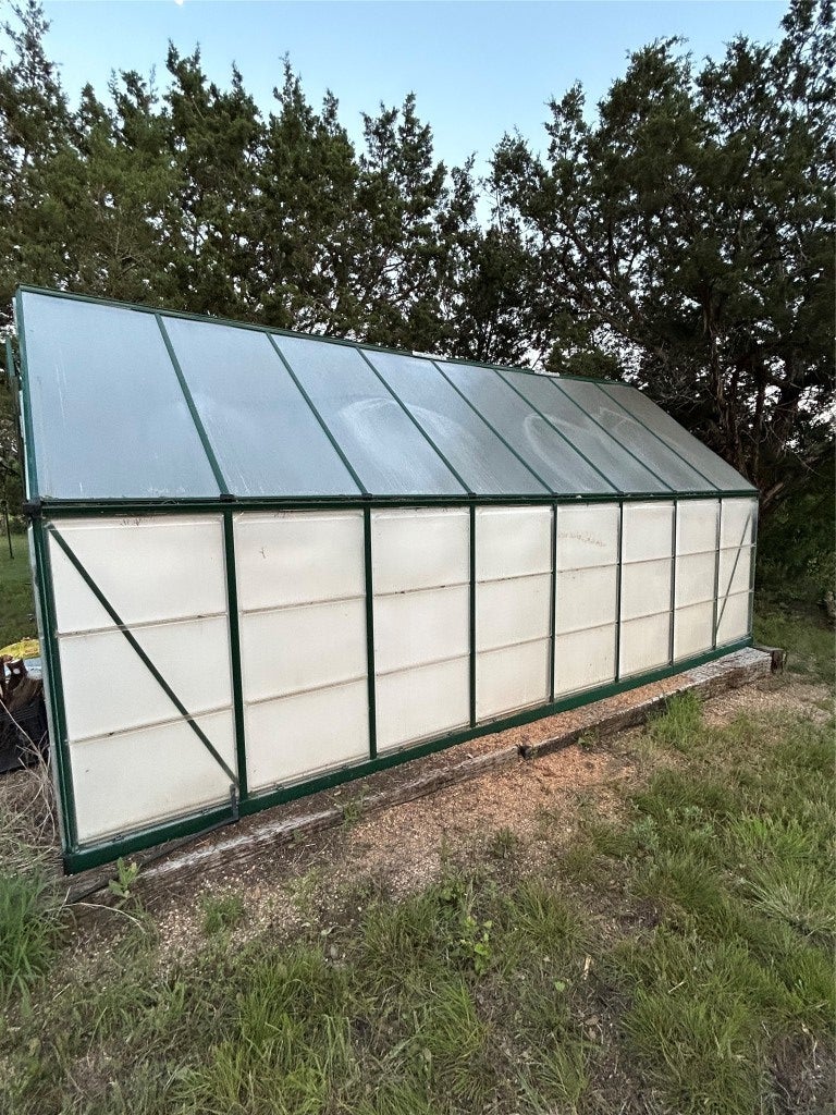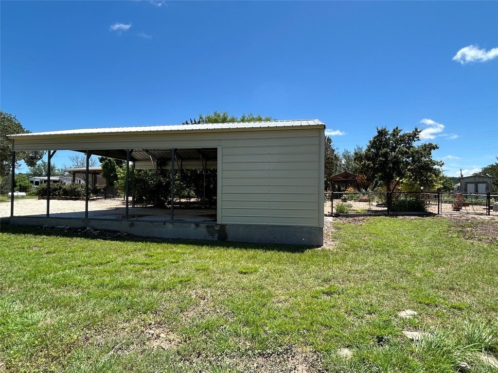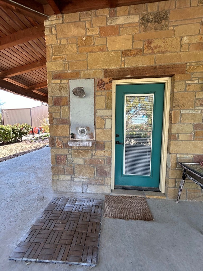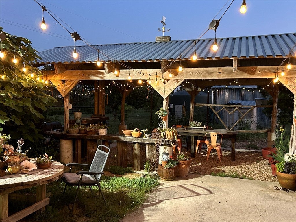 Welcome to Starkeeper Ranch! A wood rail post fence and crushed limestone drive lead to the custom home and multiple outbuildings. The 2,400 sq. ft. home is designed for entertaining. There are two bedrooms, two baths, and an office. The home features custom wood accents and tile finishes that evoke the charm of Taos, New Mexico. Living room has a recessed ceiling, a wet bar and wood-burning fireplace. The kitchen with a recessed ceiling has an oversized island, a large walk-in pantry, and an adjacent dining area with built-in cabinets. The primary bedroom ensuite, built in cabinets, two walk-in closets, two sinks in the bathroom, a walk-in shower, and a heated towel rack. The exterior of the home features native San Saba sandstone and a standing seam metal roof. The oversized porch wraps around the entire house and includes an outdoor shower. The front yard is landscaped with flagstone sidewalk, Tifway 419 Bermuda grass and native plants. The porch features eclectic patio furniture vignettes, adding a Round Top, Texas charm. Outbuildings include: - Covered patio - Quaint wood-frame casita with water and electricity, a kitchen and living space, but no bathroom - Large wood-frame building with water and electricity, a metal roof, and a covered porch - Wood and metal storage building - Small wood and metal building for the water well and pressure tank - Greenhouse There is a two-car carport with an attached storage area. North of the home is a large metal-frame shop barn with concrete floors, two overhead doors, a walk-through door, a loft, and a large overhang for tractors and implements. The barn is used as a woodshop and includes a custom-built office with insulated sheetrock walls, concrete floors, recessed lighting, wood trim, a sink, refrigerator, bathroom, and A/C and heat. The office has WiFi from the main house. Adjacent to the barn is an RV pad with electric and sewer hookups and a chain-link fenced area for a garden and plants.