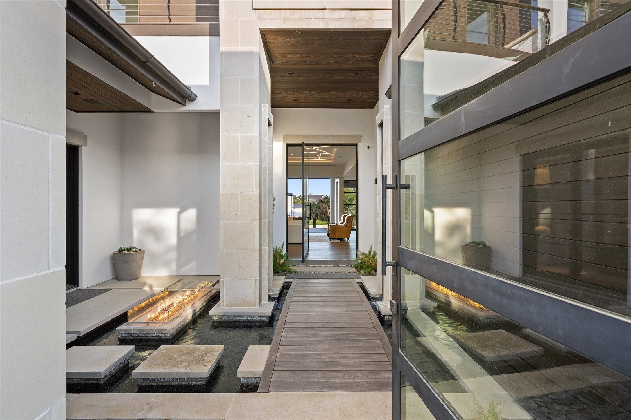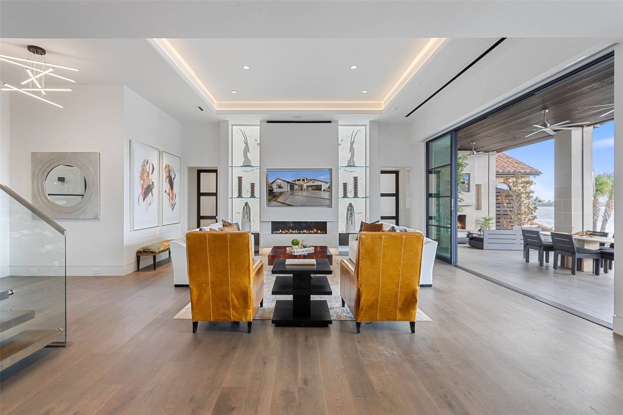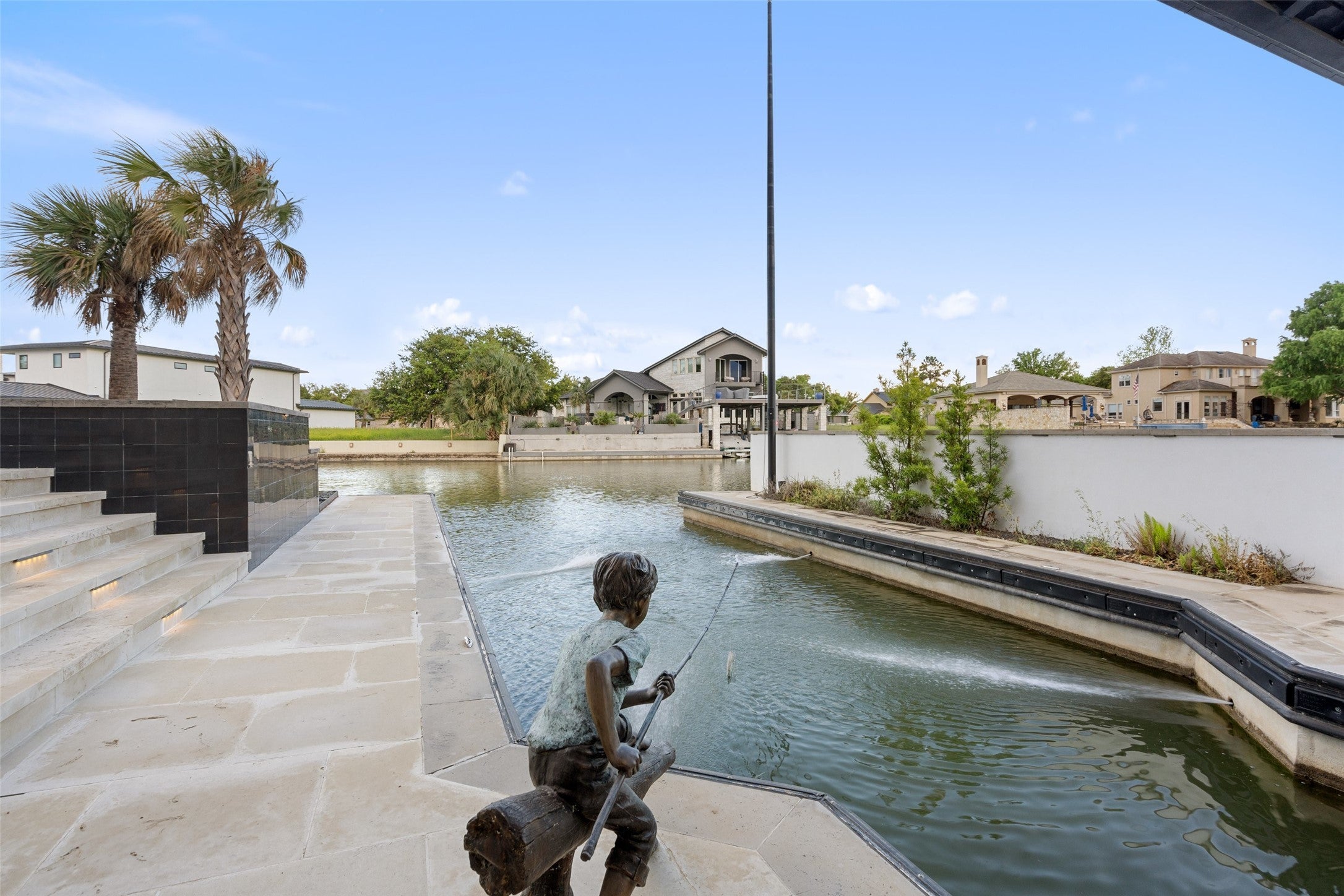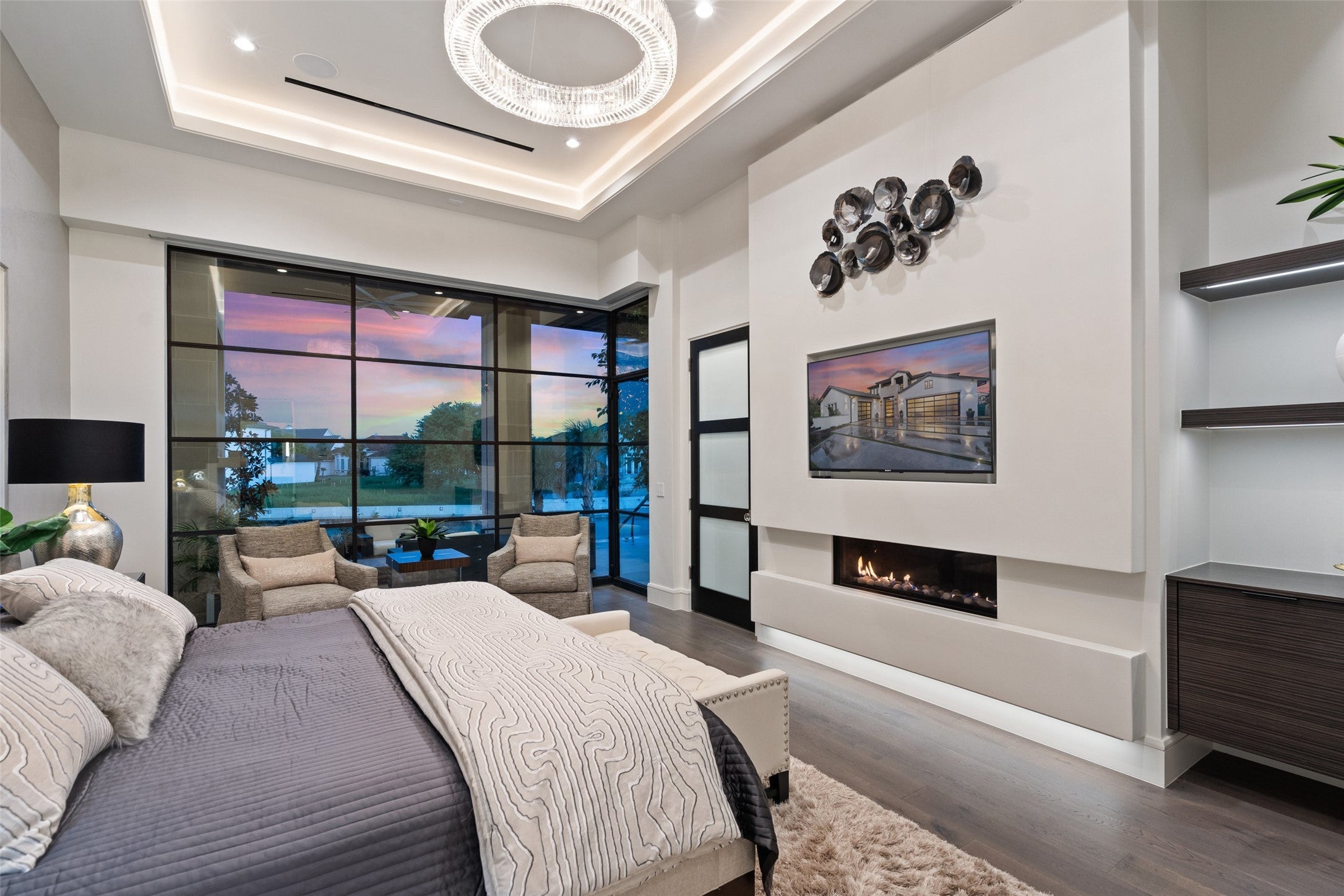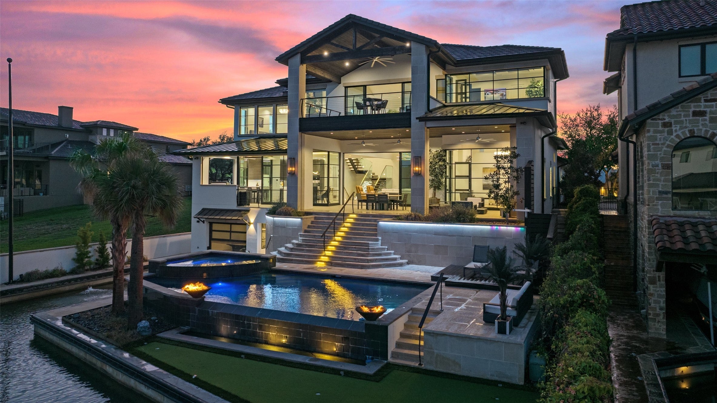 Welcome home to a stunningly gorgeous modern waterfront retreat on Lake LBJ. Enter through a one-of-a-kind courtyard with soaring waterfalls, a fire feature, entry to standalone casita, and enormous all-glass entry to main house with sweeping views to the cove and Lake LBJ beyond. Off the wide open main living is the beautiful primary suite, featuring an elegant gas fireplace, sumptuous soaking tub, luxurious walk-in rain shower and exceptional closet. The main living area boasts full-height glass doors with automatic power screens that open up to a sprawling back patio featuring a seating area with gas fireplace, fully-appointed outdoor kitchen with grill, refrigerator, ice maker and ample dining space, surrounded by power screens protecting the outdoor living space from bugs and debris. Upstairs, you'll find recessed floor lights, an impressive chandelier feature, additional guest suite with incredible views, large media room, fully appointed wet bar, a bunk room with ensuite, two covered balconies, and a C-Suite caliber office with full bath (or additional bedroom). The bottom floor houses the screened boat garage with lift, a full bathroom with outdoor access for the pool, and a gym, as well as additional storage. Adjacent to the casita is a theater/arcade with another full bathroom ready to entertain kids and kids-at-heart. This home is a must-see destination with too many unique features to list, most of them controlled through the Elan Smart Home system. For buyers with exquisite taste ready to enjoy the good life on Lake LBJ, you can't beat this home. Come see it today.