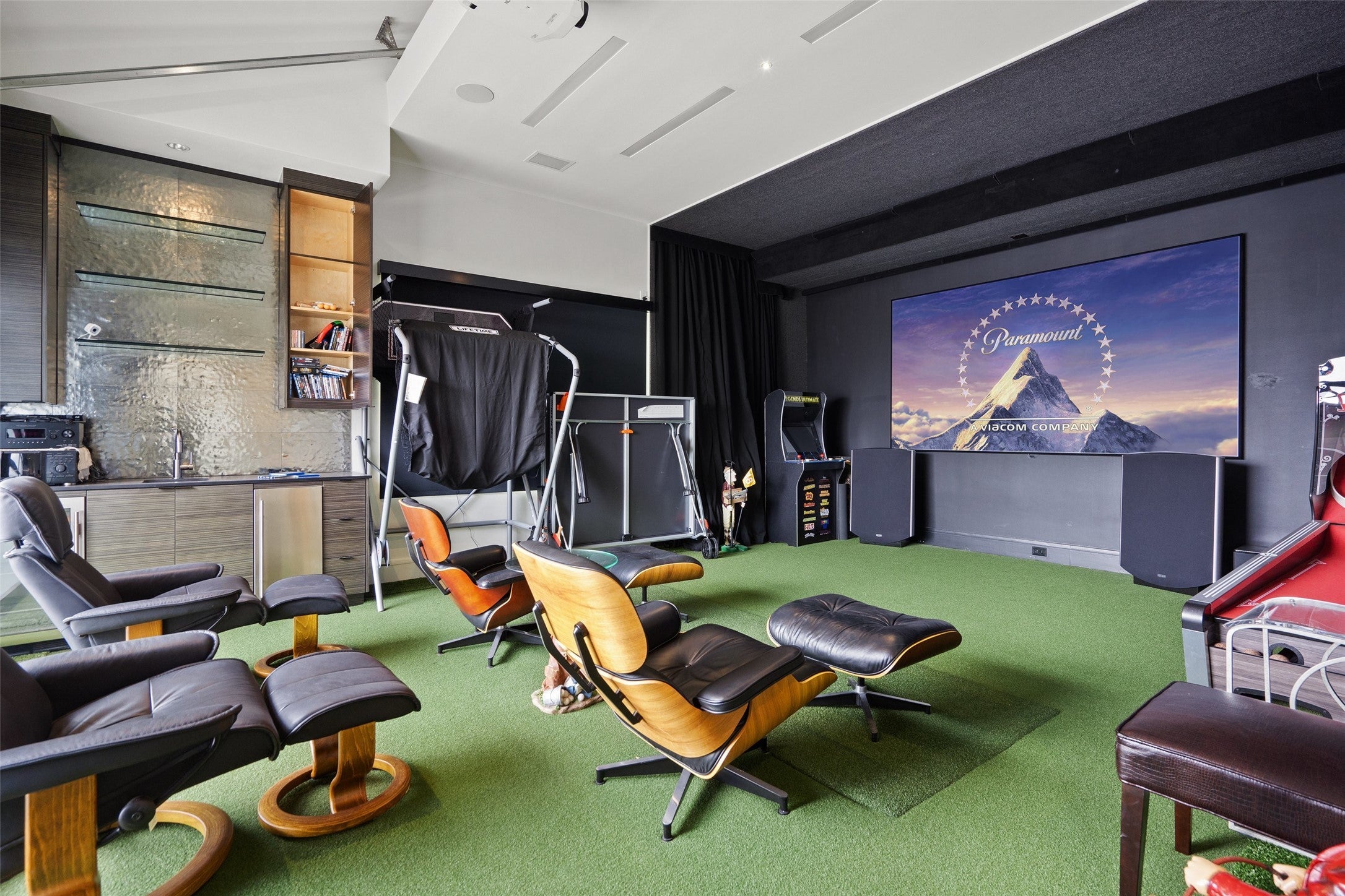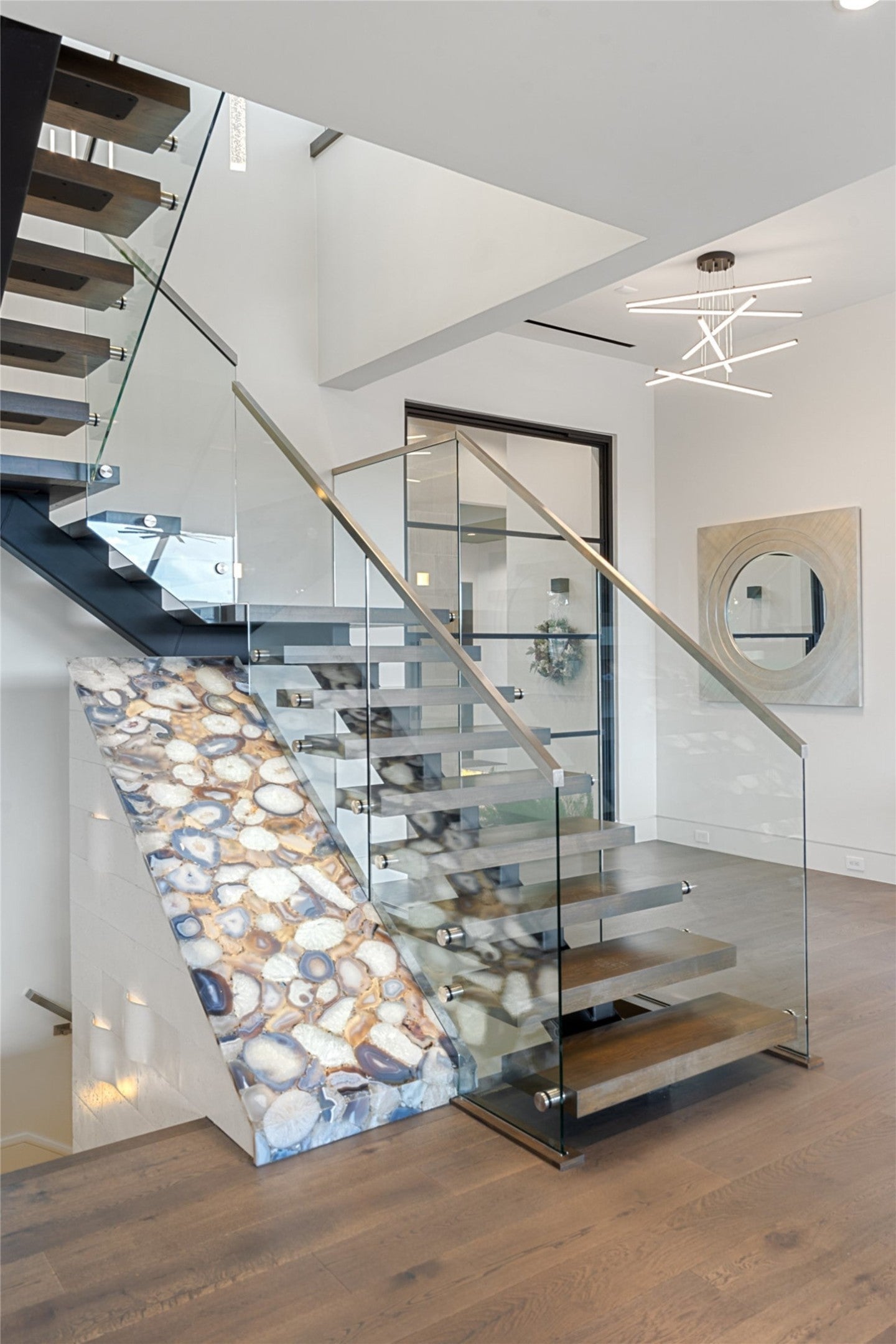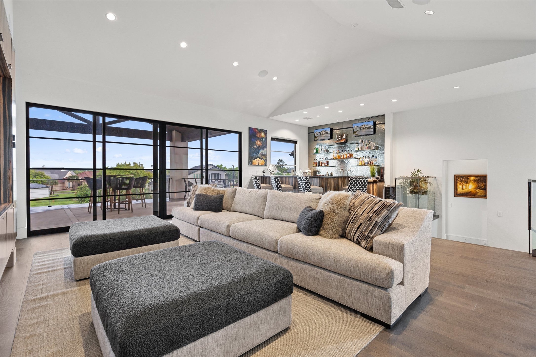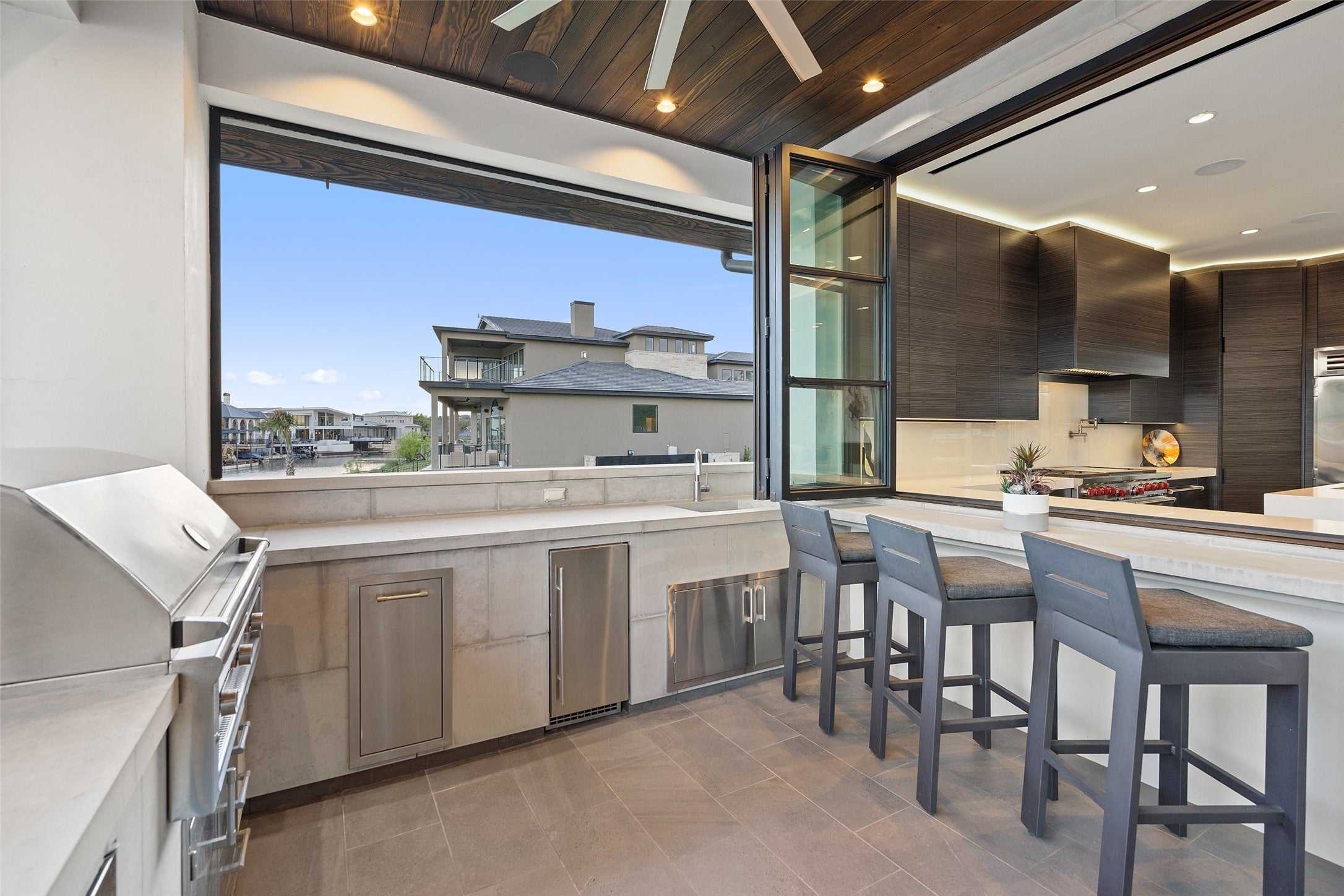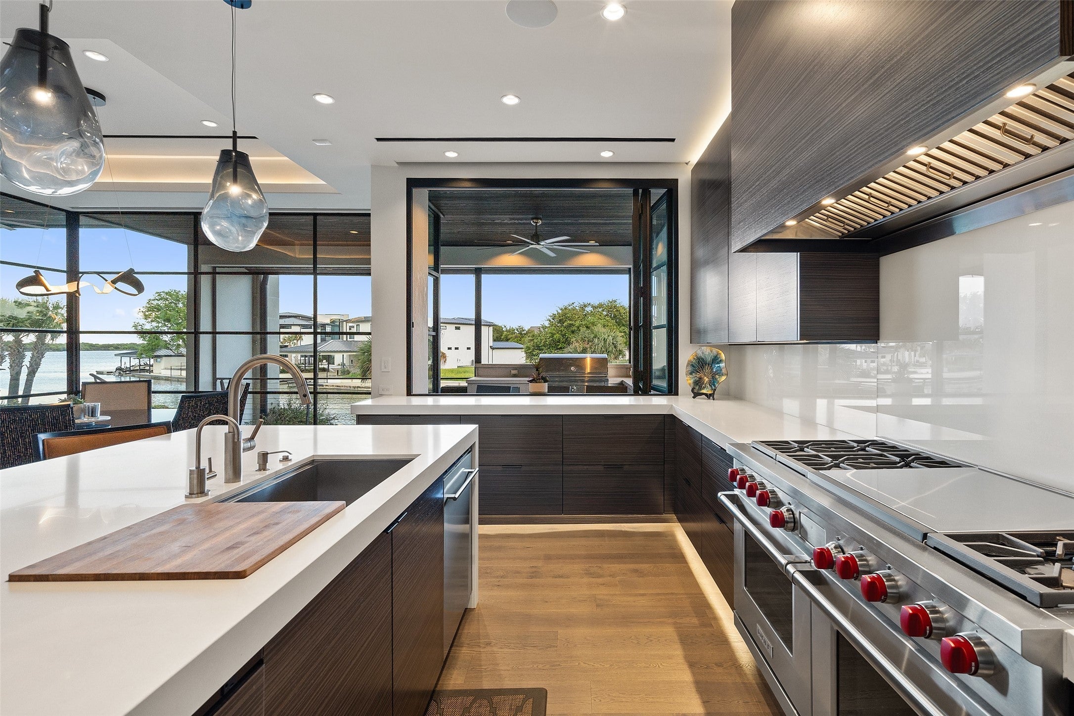 Welcome home to a stunningly gorgeous modern waterfront retreat on Lake LBJ. Enter through a one-of-a-kind courtyard with soaring waterfalls, a fire feature, entry to standalone casita, and enormous all-glass entry to main house with sweeping views to the cove and Lake LBJ beyond. Off the wide open main living is the beautiful primary suite, featuring an elegant gas fireplace, sumptuous soaking tub, luxurious walk-in rain shower and exceptional closet. The main living area boasts full-height glass doors with automatic power screens that open up to a sprawling back patio featuring a seating area with gas fireplace, fully-appointed outdoor kitchen with grill, refrigerator, ice maker and ample dining space, surrounded by power screens protecting the outdoor living space from bugs and debris. Upstairs, you'll find recessed floor lights, an impressive chandelier feature, additional guest suite with incredible views, large media room, fully appointed wet bar, a bunk room with ensuite, two covered balconies, and a C-Suite caliber office with full bath (or additional bedroom). The bottom floor houses the screened boat garage with lift, a full bathroom with outdoor access for the pool, and a gym, as well as additional storage. Adjacent to the casita is a theater/arcade with another full bathroom ready to entertain kids and kids-at-heart. This home is a must-see destination with too many unique features to list, most of them controlled through the Elan Smart Home system. For buyers with exquisite taste ready to enjoy the good life on Lake LBJ, you can't beat this home. Come see it today.