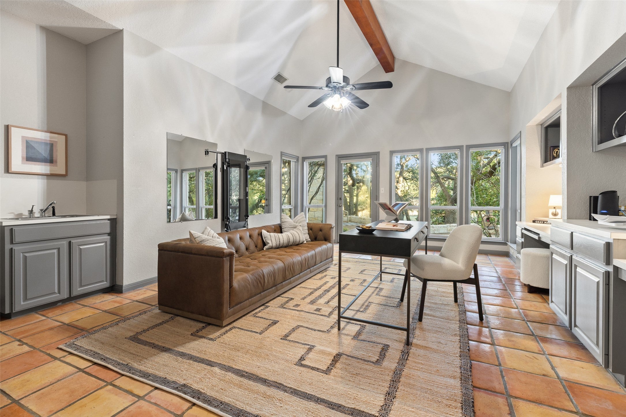 Welcome to creekside Hill Country living beneath majestic oaks in Wimberley, Texas. Tucked behind a private gate on 18 scenic acres, this exceptional ranch estate blends timeless character, thoughtful upgrades, and the tranquility of nature. Originally built in 1992 and expanded over the years, the home offers 5,656± sq. ft. of beautifully designed living space with flexible areas for entertaining, relaxing, and multi-generational living. A gallery-style foyer opens to the dramatic main living room, where soaring wood-beam cathedral ceilings, expansive windows, and a striking stone fireplace create a warm, light-filled centerpiece. The spacious chef’s kitchen features granite countertops, stainless steel appliances, a center island with raised bar seating, large pantry, built-in desk, and a bright breakfast room overlooking the property. Designed for gathering, the home includes game and media rooms that open to multi-level outdoor patios shaded by mature trees. The media room offers excellent flexibility and could easily serve as a private in-law or guest suite with its own entrance, walk-in closet, and plumbed bar. Four of the five bedrooms feature en-suite baths, while the primary suite enjoys its own private wing with a sitting room or study, spa-style bath with soaking tub and separate shower, and an oversized walk-in closet. Outside, a stocked wet-weather creek winds through the land with bluegill, catfish, and perch, along with a five-foot swimming hole and water often suitable for kayaking. A pedestrian bridge leads to a raised, irrigated garden with wildlife fencing, plus a horse corral and barn with stalls and tack room. Additional highlights include abundant storage, an oversized three-car garage, equipment barn, covered tractor/RV parking, scenic trails, and a secondary hilltop building site with utilities. Just 10 minutes from downtown Wimberley, this rare property offers the perfect blend of privacy, nature, and Hill Country charm.