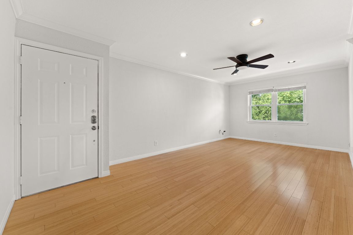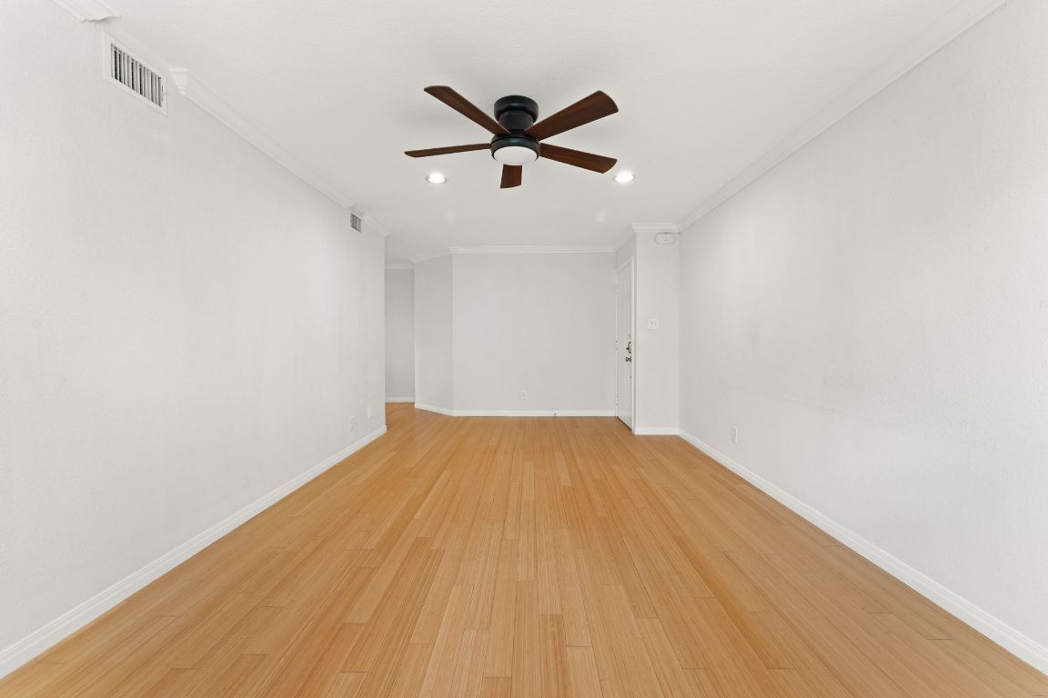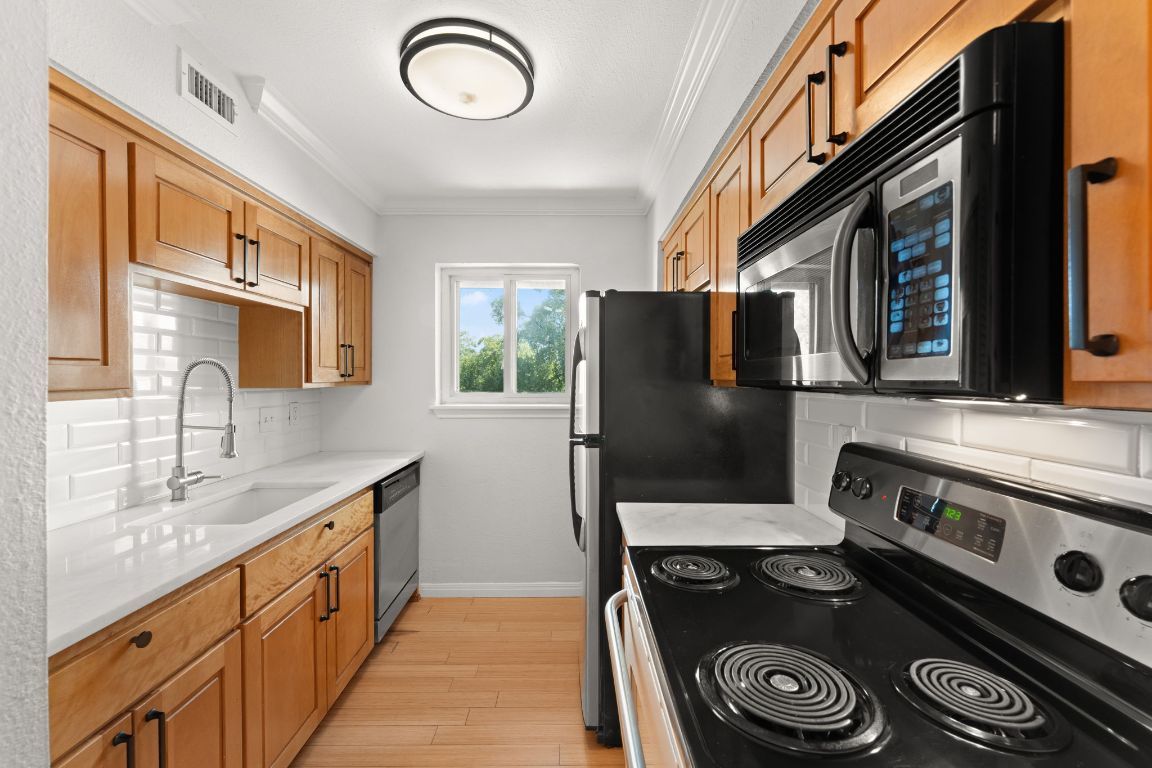 Live where Austin happens in this updated top-floor corner unit with sweeping cityscape views from the kitchen, bedroom, and bathroom, imagine the evening view with the Downtown lights! Located in one of Austin’s most iconic and vibrant neighborhoods, this bright and efficient one-bedroom condo sits within a boutique 26-unit community. Inside, you'll find bamboo flooring, crown molding, recessed lighting, and oversized windows that showcase lush treetop views and a peek at the downtown skyline. The updated kitchen features quartz countertops, stainless steel appliances, and warm wood cabinetry, while a full-size stacked washer and dryer add everyday ease. The spacious bedroom includes dual closets, and the bathroom offers a walk-in shower with modern tile finishes. Just outside your door are Austin favorites like JuiceLand, Barton Springs Picnic, Alamo Drafthouse, Uchi, Odd Duck, and Chuy’s — with Zilker Park, Lady Bird Lake, and downtown all moments away. The gated community includes secure parking, a sparkling pool, BBQ deck, and a grassy courtyard perfect for relaxing or entertaining. Whether you're looking for a low-maintenance home, a weekend retreat, or an investment opportunity, this condo delivers the best of 78704 living — a blend of comfort, convenience, and quintessential Austin charm.