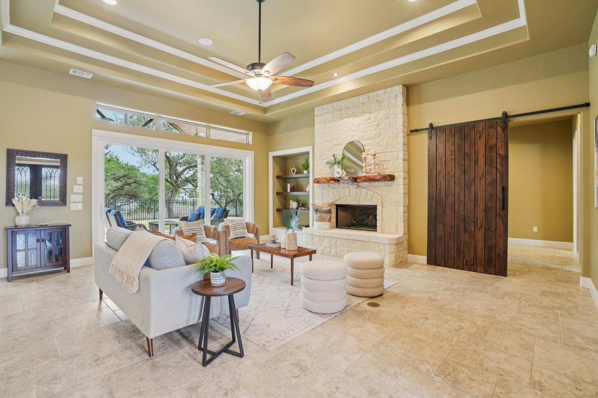 Set on 1.78 acres within the gates of Havenwood, this custom residence delivers scale, privacy, and craftsmanship rarely found in one address. The approach alone makes a statement — a long drive, 3-car garage, and a limestone-and-stucco exterior framed by mature landscaping. Inside, the home is built around space and flow. Expansive living areas are designed to feel open without ever feeling overwhelming. The fireplace commands attention in the main living room, while the kitchen operates as the centerpiece— anchored by a substantial limestone-wrapped island with ample seating. Wood cabinetry, quartz surfaces, double ovens, stainless appliances, and layered lighting create a kitchen that performs as beautifully as it presents. The rear of the home opens wide to an outdoor setting designed for everyday enjoyment. A vaulted, wood-paneled covered patio overlooks nature and roaming wildlife with multiple sittings areas. The primary suite is positioned for maximum privacy, creating a retreat that feels removed from the rest of the home. French doors introduce the space, tray ceilings elevate it, and panoramic windows soften it with natural light. The bath delivers scale and detail: dual vanities, a custom arched-entry shower, and a soaking tub set beneath a statement chandelier. Secondary bedrooms are thoughtfully placed for comfort and separation, including one with a private ensuite — ideal for guests or multigenerational living. All of this is set within Havenwood, where pools, courts, trails, and gathering spaces create a lifestyle that complements the property’s presence. This isn’t simply another home in the community. It’s the one others are compared to.