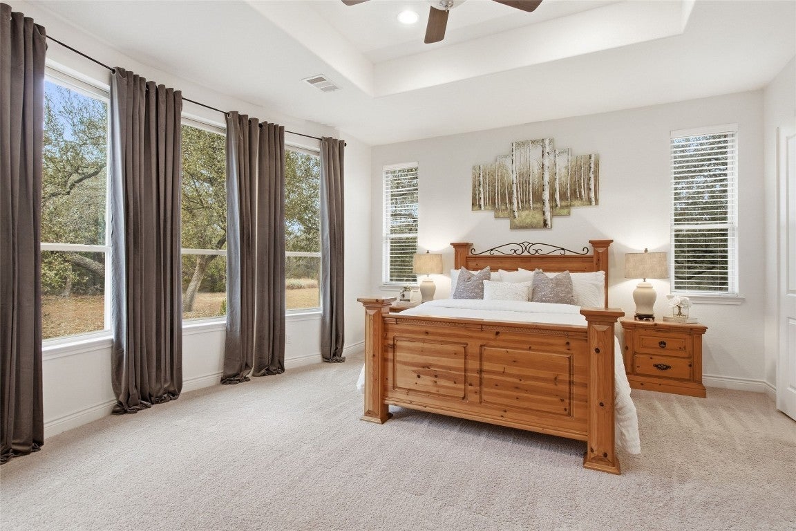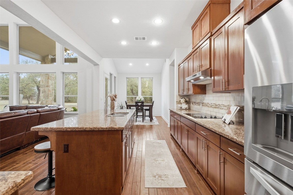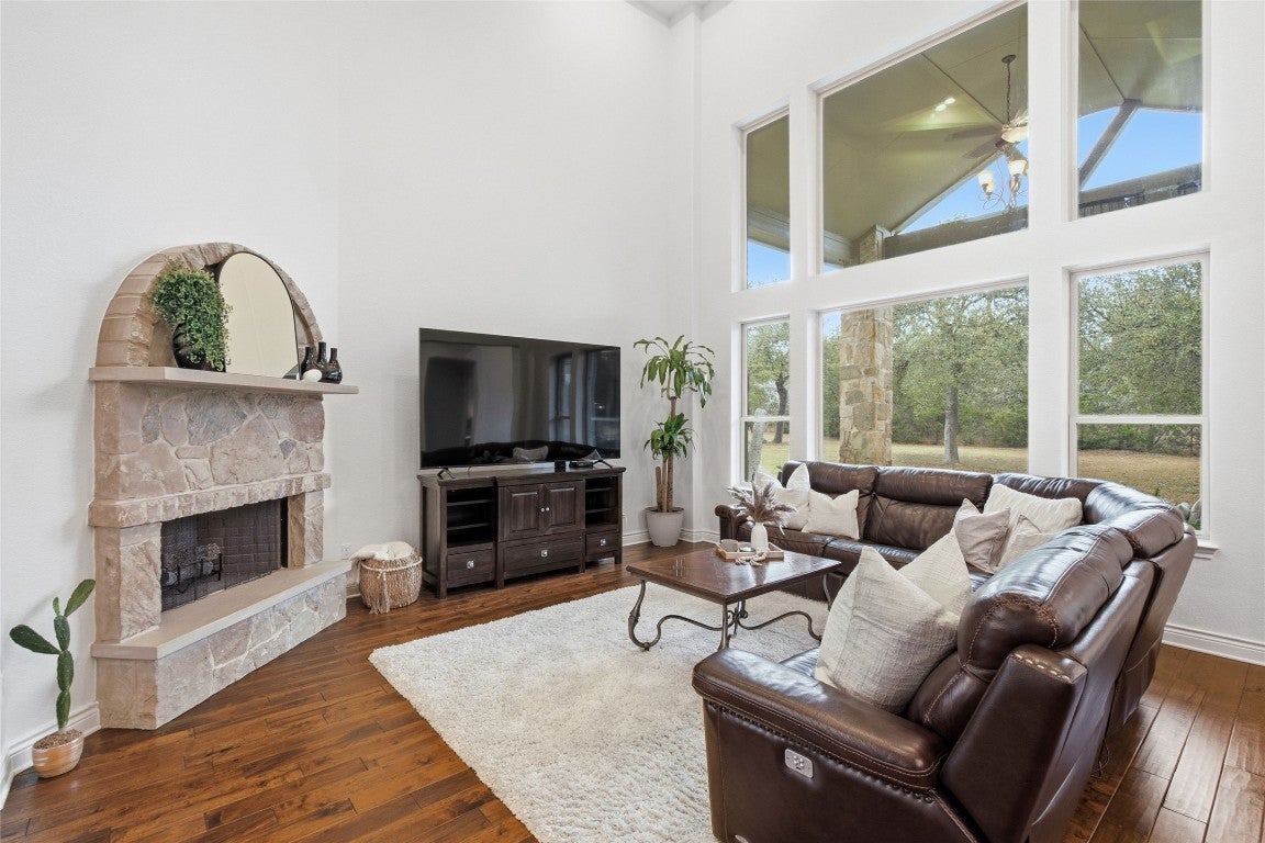 Welcome to 23315 Nameless Road - a custom, multi-generational estate set on three private, unrestricted acres. Surrounded by mature trees & sweeping Texas Hill Country views, this unique property features two homes: a five-bedroom main residence + a separate two-bedroom guest house. Offering exceptional space, privacy, and upscale finishes, it’s an ideal setup for a home business, guests, or flexible multi-family living. As you enter the main residence, soaring ceilings & timeless finishes welcome you inside. The great room serves as the heart of the home, featuring warm-toned flooring, a striking stone fireplace, & expansive floor-to-ceiling windows that flood the space with natural light and frame the surrounding landscape. The open-concept kitchen is thoughtfully designed with rich stone countertops, an oversized island with bar seating, & built-in stainless appliances. The owner’s suite offers a private retreat with elegant tray ceilings & bay windows overlooking the serene yard. The spa-like ensuite includes an oversized double vanity, soaking tub, walk-in shower, & spacious closet providing secondary access to the well-appointed laundry room. Also on the main level, a secondary bedroom with attached full bath is perfect for guests, along with a bright office featuring built-in shelving & additional closet space. Upstairs, you’ll find a flexible open living area, media room, three additional bedrooms, and two full bathrooms. Outside, a large covered patio with vaulted ceilings invites you to unwind, with plenty of room for a pool or expanded outdoor living. Guest House/Casita: Completed in 2023, this 2-bedroom guest house includes its own electric meter and modern open floor plan—ideal for rental income or visiting guests. No HOA, no restrictions, and low tax rate! Just 2 miles from daily conveniences, this property offers serene country living with easy access to local amenities.
