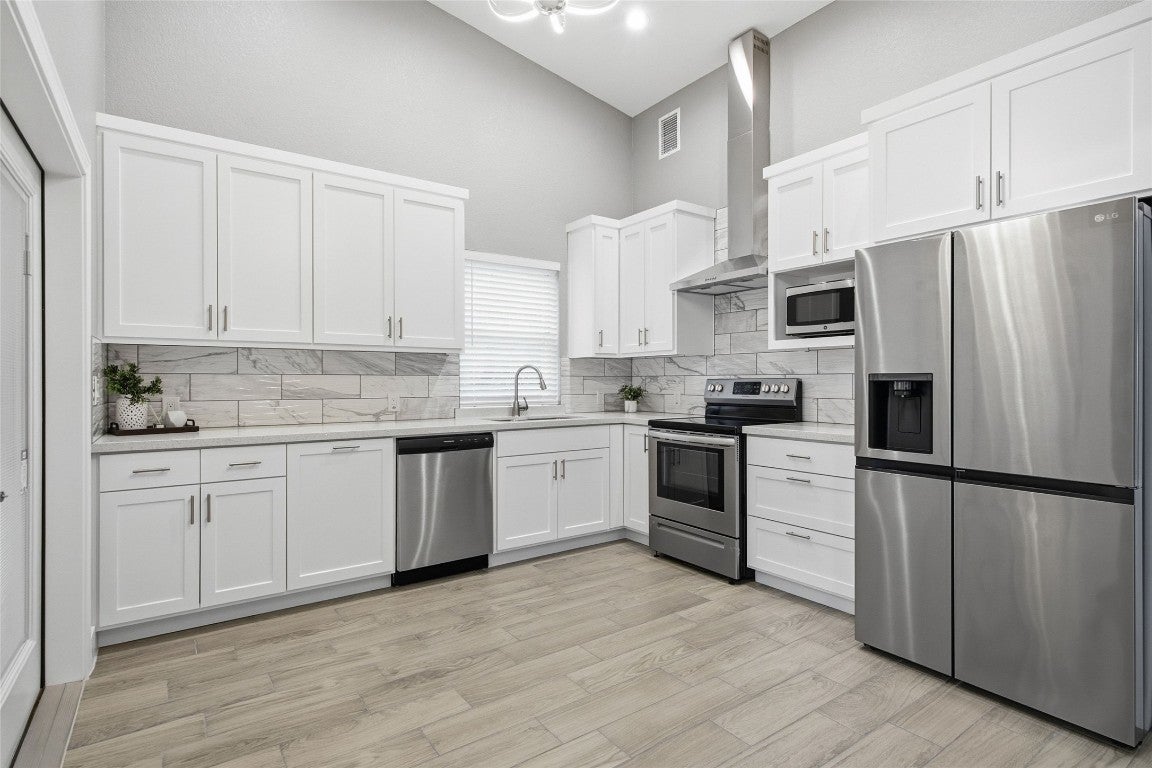 - Built-In Electric Range, Bar Fridge, Dishwasher, Electric Cooktop, Disposal, Microwave, Oven, Refrigerator, Stainless Steel Appliance(s)