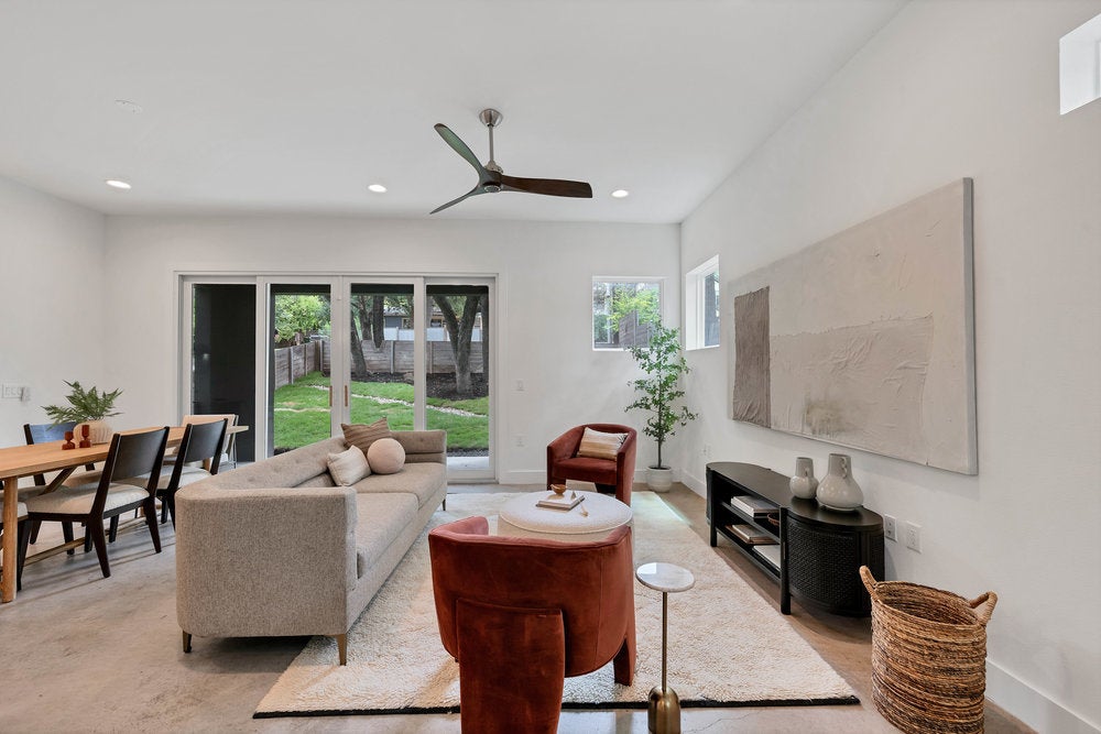 Incredible opportunity in the highly desirable Galindo neighborhood in the 78704 zip code. This home offers 2,471 SF of living space set on gorgeous lot in a private setting. Thoughtful floor plan with primary suite on main level with all additional bedrooms/flex rooms upstairs. The main level encompasses an open floor plan throughout that seamlessly connects the living area to the gourmet kitchen with a powder bath close by for convenience and spacious walk-in laundry room. Tons of natural light throughout the home, but for added privacy and energy efficiency, custom window treatments and shutters were installed in 2021. The kitchen is designed for those who love cooking and entertaining, equipped with top-of-the-line appliances, gas stove and ample counter space on the stand alone island. The primary suite is a true retreat with an oversized closet, luxurious soaking tub, walk-in shower and look-out patio with sliding doors for fresh air. Upstairs you will find 2 additional bedrooms, 1 office (or 4th bedroom), 2 full bathrooms PLUS another bonus flex room (ideal for play room, storage, office or workout area. The low-maintenance front yard is very spacious, fully-fenced and also has a patio for seating. HOA with Unit 2 was dissolved (no HOA or dues). The icing on the cake is the 1-car attached garage. The driveway will allow for 2 more parking spaces. Privacy is paramount here; enjoy peace and quiet within your own secluded sanctuary. Minutes to South Congress, South Lamar and Downtown. Truly an unbeatable location.